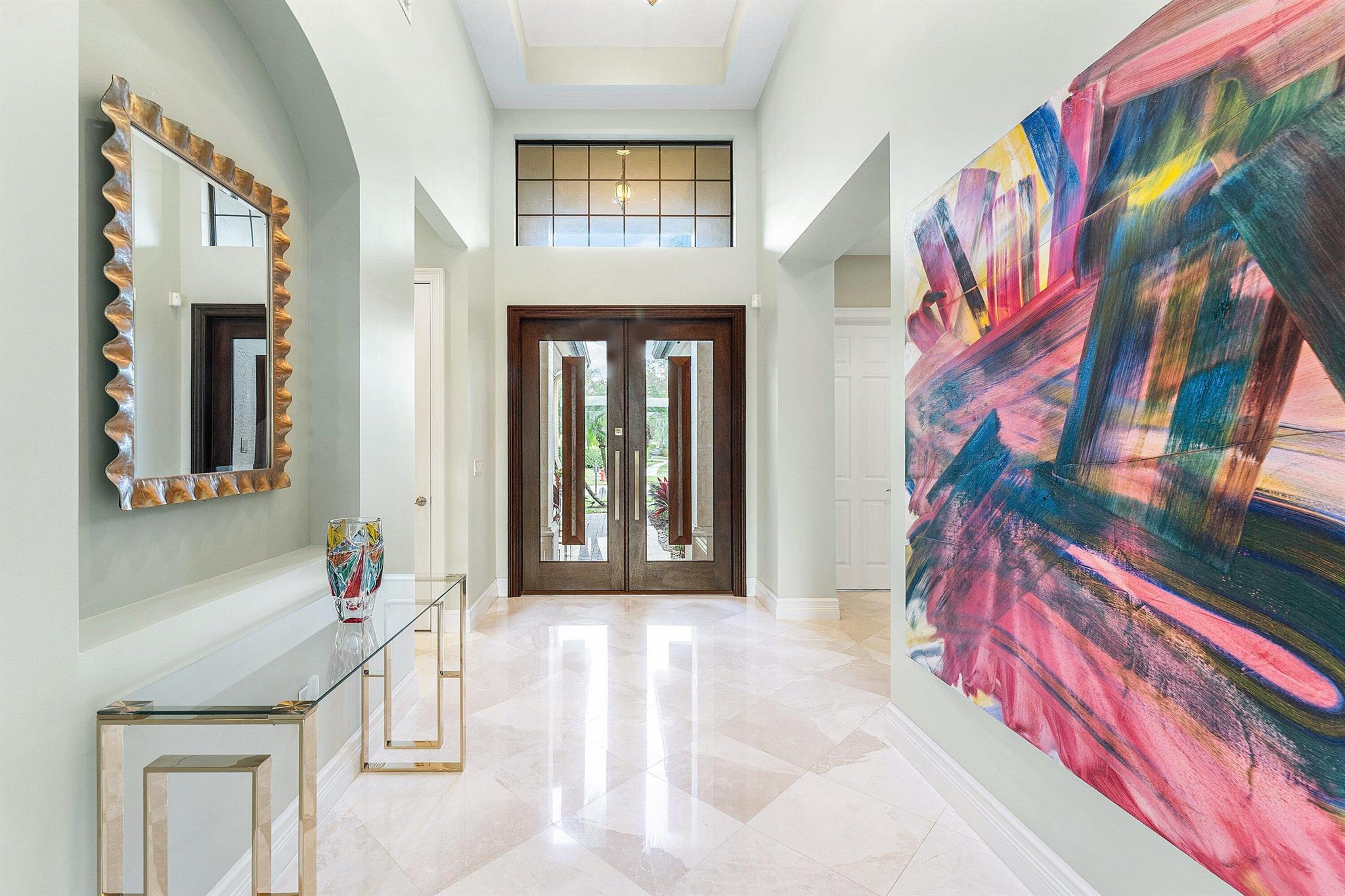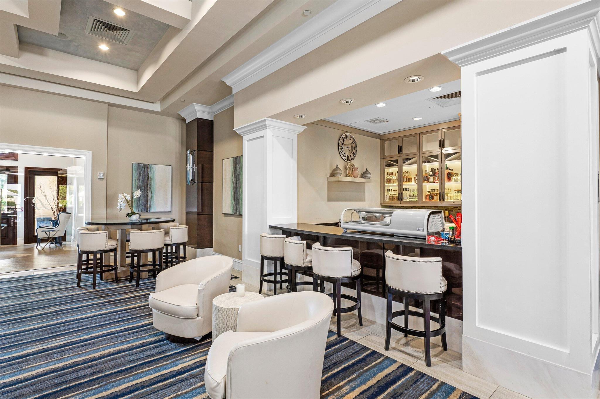 Experience elevated lakefront living in this exceptional single-story Venetian Model from the Coastal Collection, located in the prestigious gated community of The Bridges. This expanded residence welcomes you with a dramatic double-height foyer leading to a stately living room, formal dining room, and spacious family room. Marble flooring, volume coffered ceilings, and a custom wet bar create a refined and inviting atmosphere.Expansive windows showcase breathtaking lake and pool views, seamlessly blending indoor elegance with outdoor tranquility. The heated saltwater pool and spa are surrounded by lush landscaping and capture stunning sunset vistas across the approximate 1/3-acre lot.