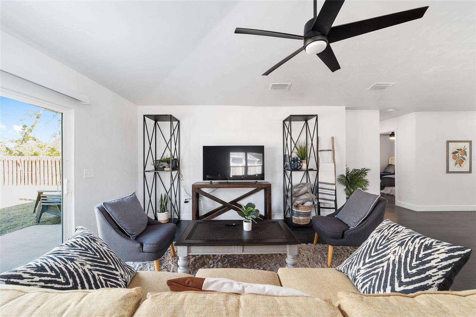 A quiet sense of arrival sets the tone as this newer residence comes into view, offering the ease of modern construction paired with a thoughtfully composed interior that feels both grounded and refined. Designed for low maintenance living without sacrificing character, the home unfolds with warmth, intention, and understated style. Inside, chic dark toned hardwood floors stretch throughout the main living areas, anchoring each space with depth and allure while elevated ceilings above invite light to move freely from room to room. The result is an atmosphere that feels open yet intimate, airy yet calm. The living room becomes the heart of the home, generous in scale and framed by a coffered ceiling that introduces architectural dimension and quiet sophistication. Dual French doors open seamlessly to the backyard, drawing sunlight indoors and creating an effortless connection between interior comfort and outdoor living. Gatherings flow easily here, whether slow mornings or lively evenings with friends. Just off the entry, a dedicated office offers a peaceful retreat for study, work, or creative pursuits, thoughtfully separated to support focus while remaining connected to the rhythm of the home. The eat-in kitchen balances charm with function. A cozy breakfast nook welcomes everyday moments, while the kitchen itself is designed with intention for those who love to cook and entertain. Expansive prep surfaces, abundant storage, and elevated fixtures create a space that feels both beautiful and highly practical, equally suited to weeknight dinners or holiday celebrations. Four comfortable bedrooms provide flexibility and rest, including a serene primary suite that echoes the homes refined details with its own coffered ceiling and generous proportions. The space feels tranquil and restorative, a true retreat at days end. Two well appointed baths and an attached two car garage add everyday convenience and efficiency. Outdoors, a fully fenced backyard offers privacy and possibility. A quiet, contained setting for pets, play, gardening, or simply unwinding beneath the open sky. Set in desirable High Springs with close proximity to parks, springs, and local amenities, this move in ready home pairs thoughtful design with a lifestyle of simplicity and ease. Comfortable. Stylish. Private. A place where daily life feels lighter and beautifully lived.