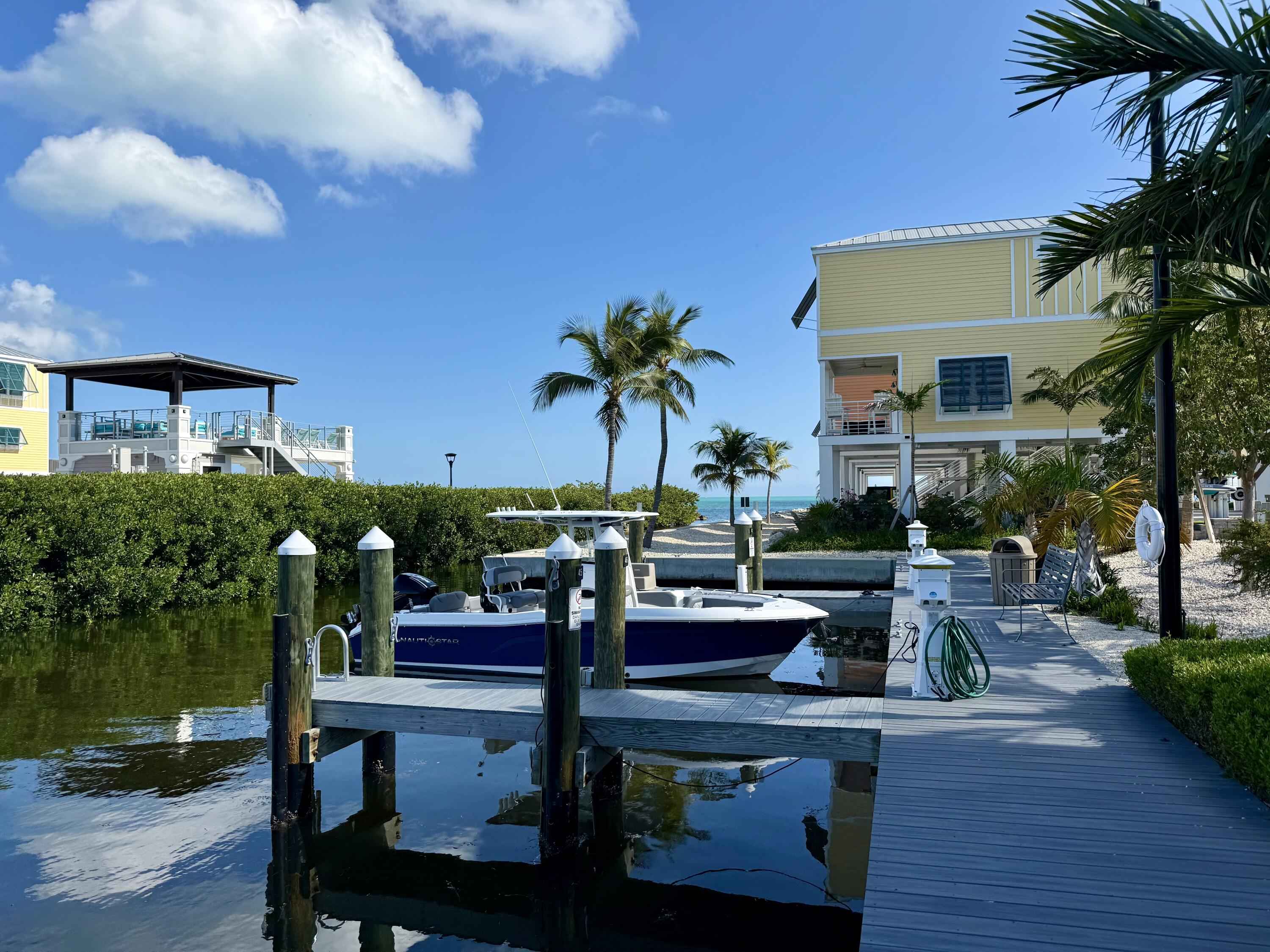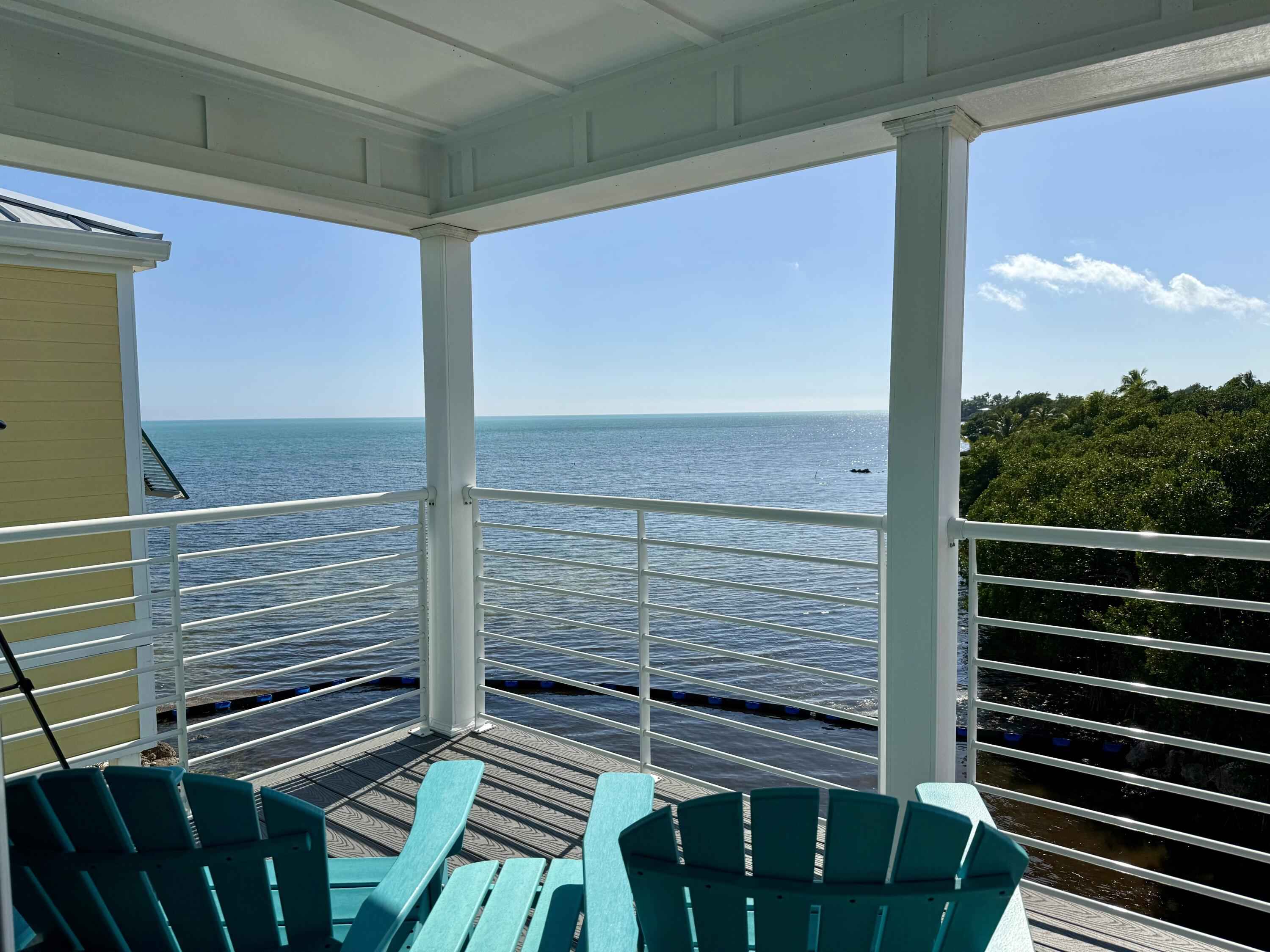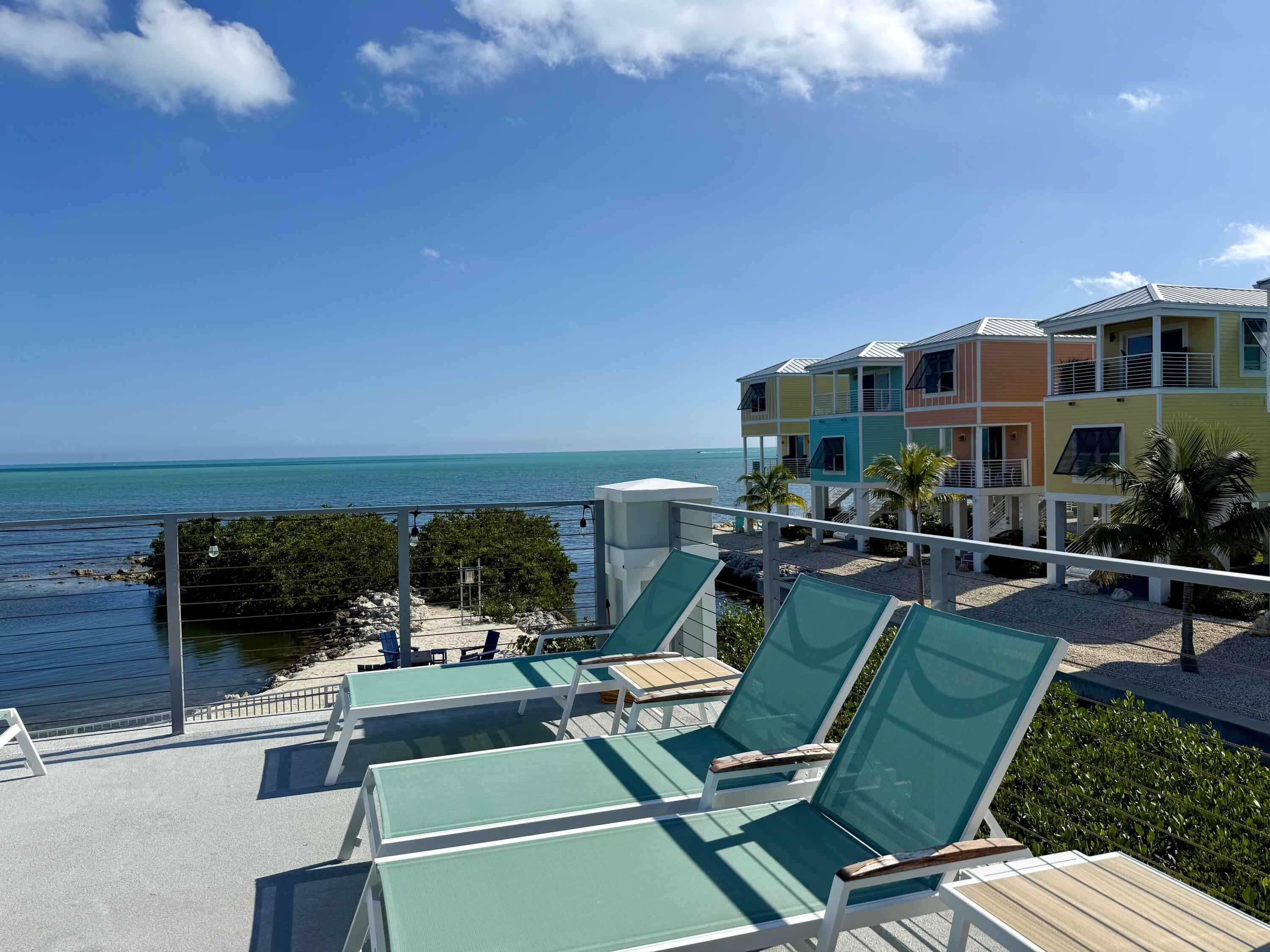 Live your vacation year-round in this ocean-front townhome offering resort-style living. This recently constructed and furnished home features two-bedrooms and two-bathrooms. The first living level includes a guest bedroom and bathroom and an open-concept kitchen and living area, while the second level is dedicated to a private primary suite with a coffee and wet bar, ideal for a morning cup of coffee or an evening glass of wine before stepping onto the ocean-front porch to enjoy the sunrise or sunset. The home features ocean views from nearly every window.The home is located within the Sun Outdoors community on Plantation Key. Owners-only amenities include a gated private drive, a private pool with seating area and TV, a rooftop tanning deck with loungers and seating, an ocean-front fire pit, and a private marina with a fishing cleaning station and ice machine. Dockage is available for an additional fee. Additional community amenities include paddle boards and kayaks, a fitness center, cornhole boards, an additional pool with cabanas and a tiki hut, and more. The community frequently hosts local food trucks and weekly entertainment at the community center.Covered parking is located under the home for up to two vehicles, along with a private storage shed. Well-behaved pets will be considered. Water and electric are included, with a usage cap.