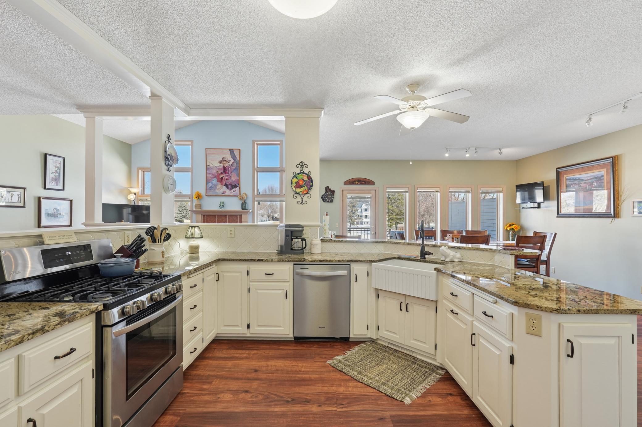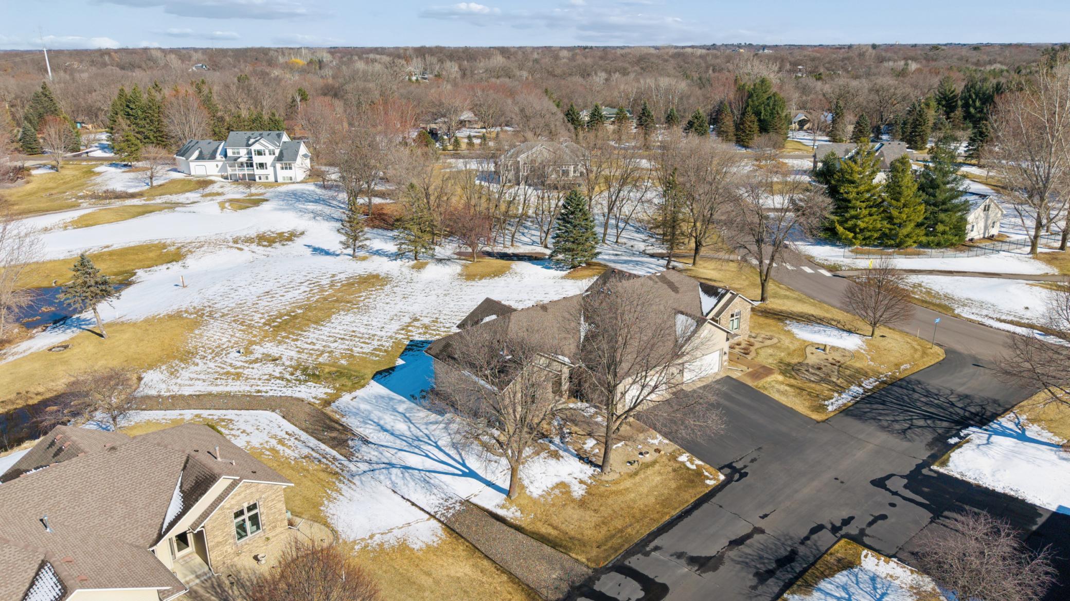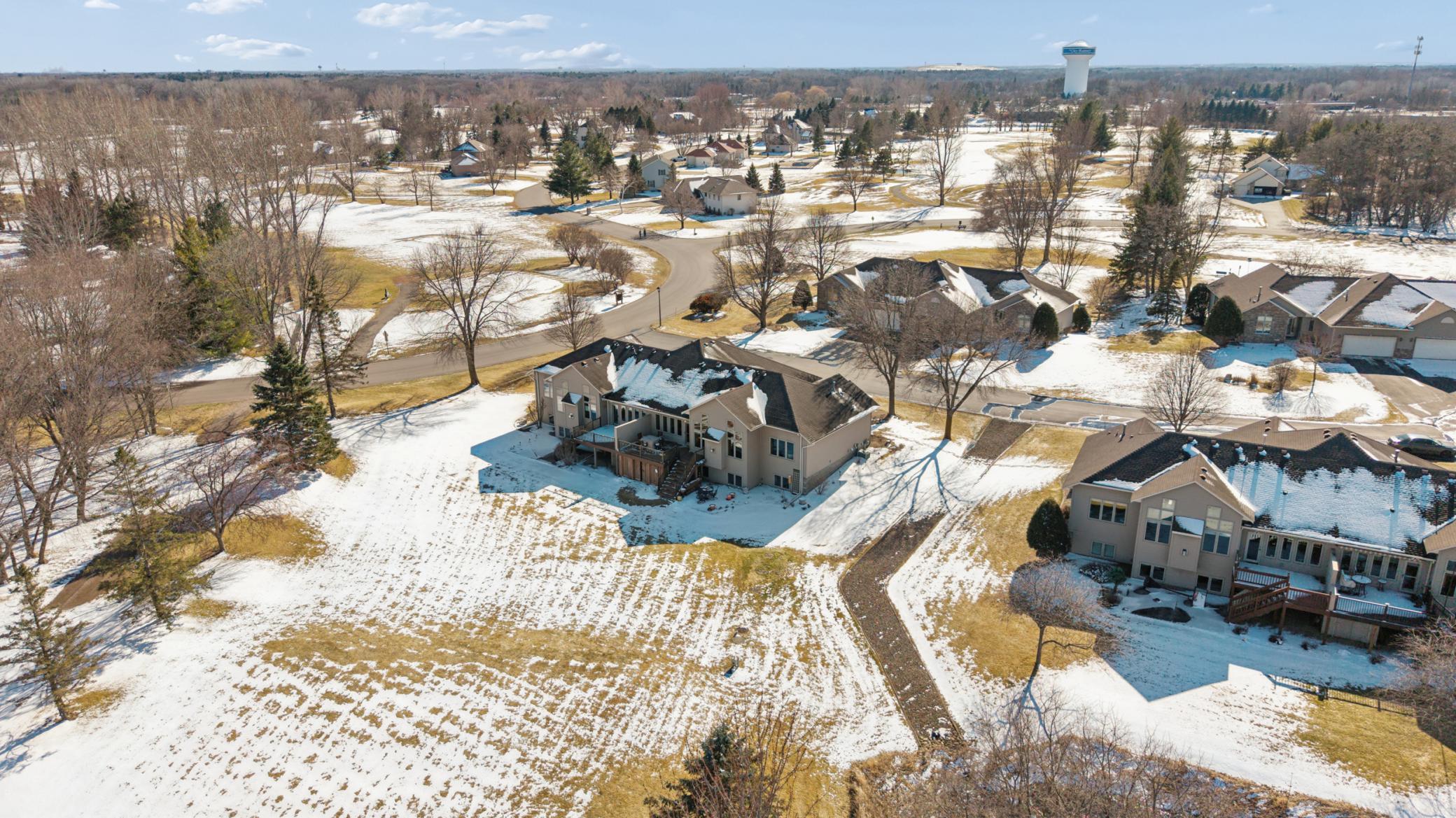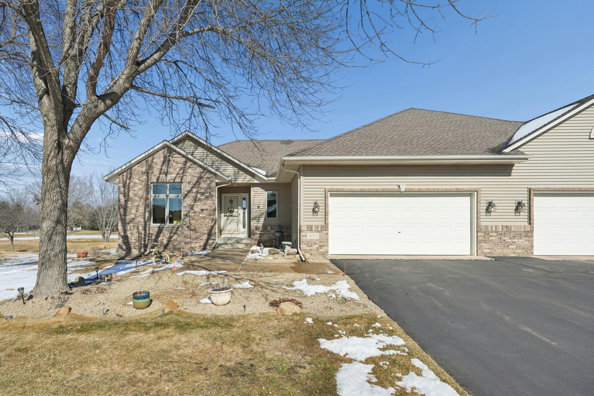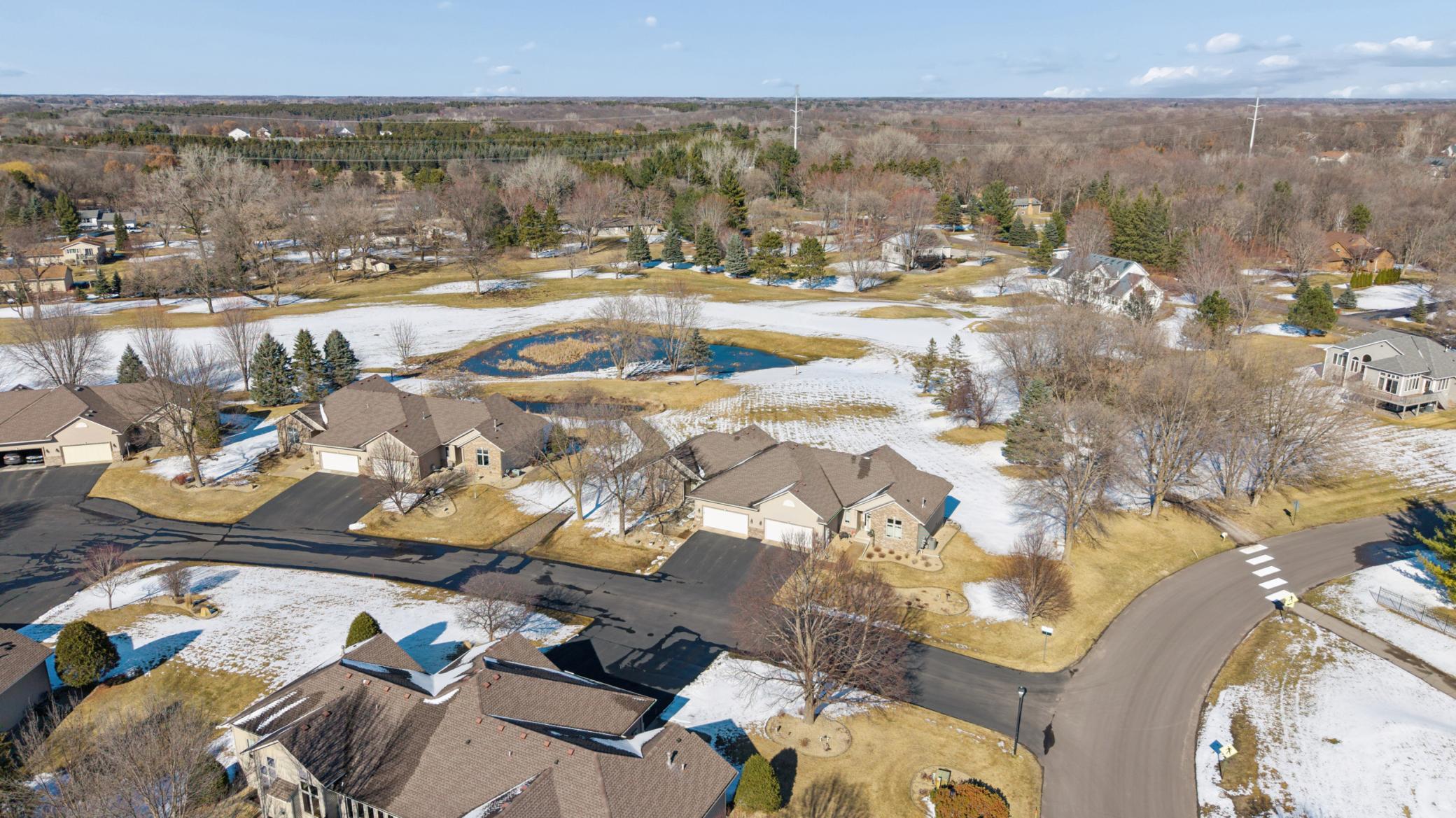 Rarely available in the highly desirable Rum River Hills golf course community, this executive Gorham-built townhome sits beautifully along the 12th green, offering scenic views and a peaceful setting! The inviting front entry leads into a vaulted living room filled with natural light from a striking wall of windows and anchored by a warm gas fireplace, creating a welcoming and comfortable gathering space. The remodeled kitchen and dining area (2021) feature stainless appliances from Warners Stellian, ample cabinet and counter space, and a comfortable informal dining area! Designed for convenient one-level living, the main floor includes a generous primary suite with a walk-in closet, custom built-ins, and a beautifully updated private bath featuring a dual sink vanity and floor-to-ceiling travertine tile shower. Enjoy main level laundry and an updated 1/4 bath, great for guests (both main level bathrooms remodeled in (2022)! The bright and spacious lower level offers a comfortable family room, an additional bedroom, and another updated bath with tile shower (2021)! This home has over $134,000 in upgrades, including a new furnace (2024), water softener (2021), water heater (2021), HRV air exchanger (2023), washer and dryer (2021), and kitchen appliances (2018)! Step outside to the large maintenance free deck, newly built in 2023, complete with stairs leading to the backyard patio, under-deck storage and a golf cart garage, perfect for enjoying the golf course lifestyle!