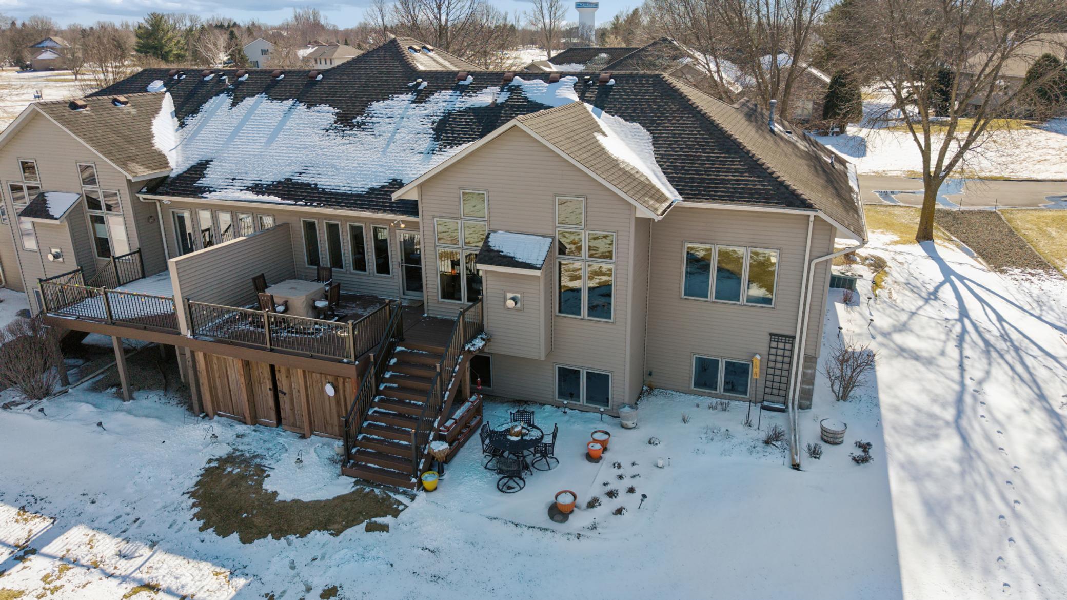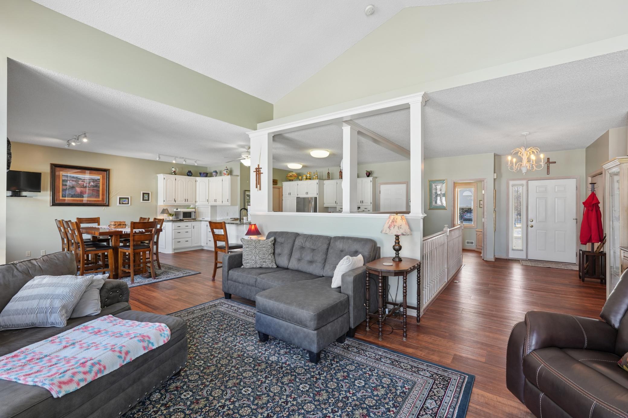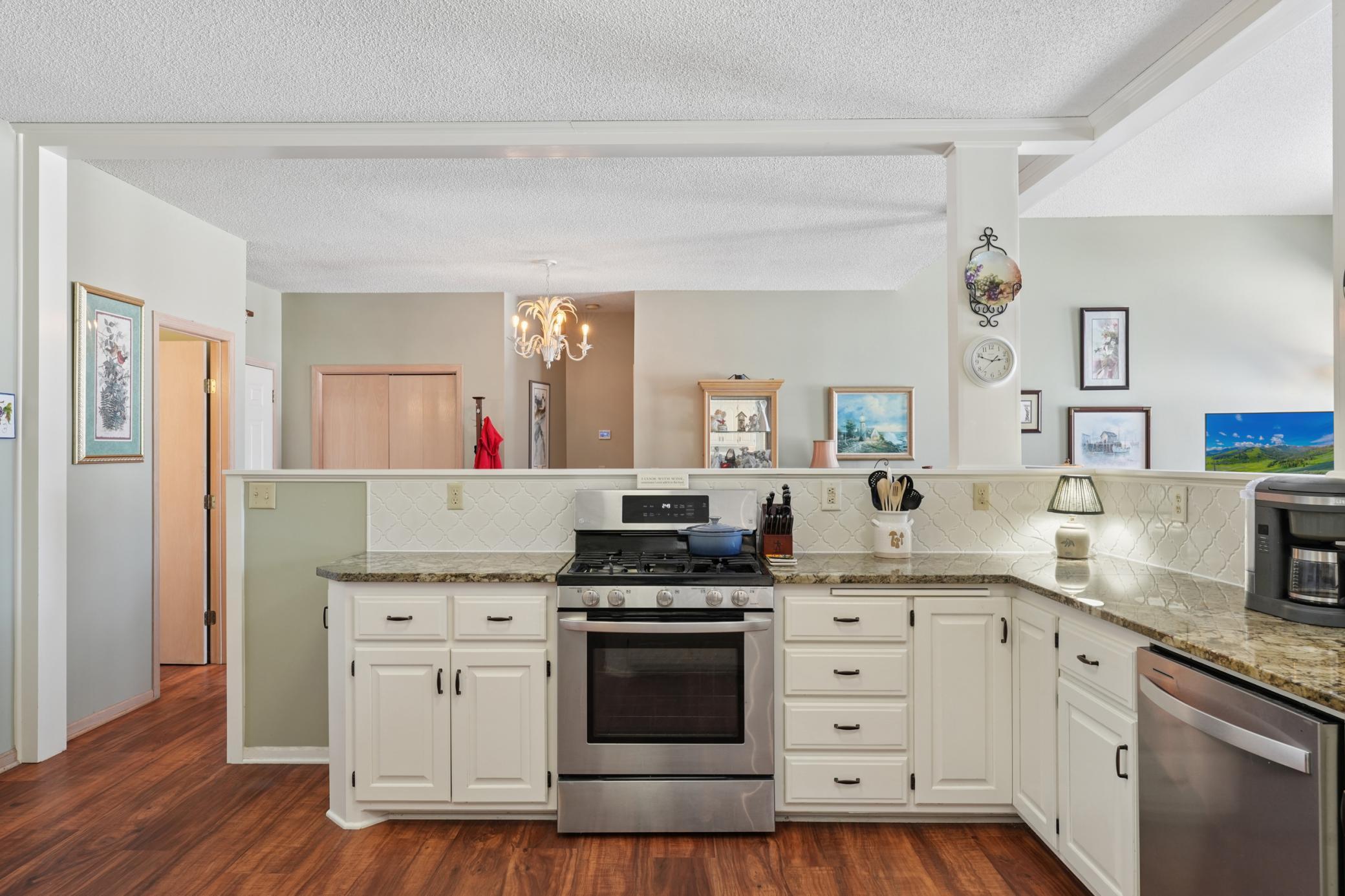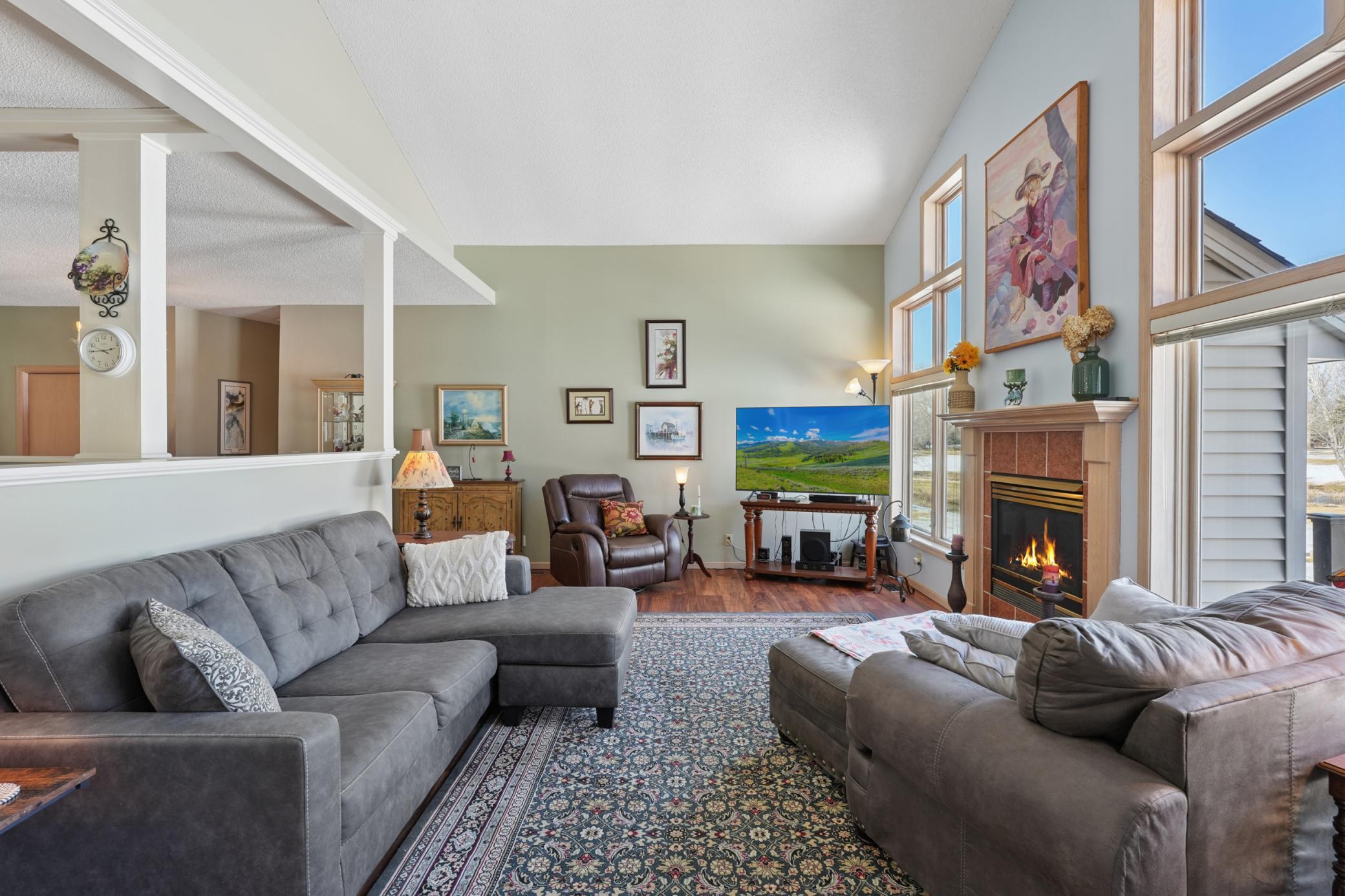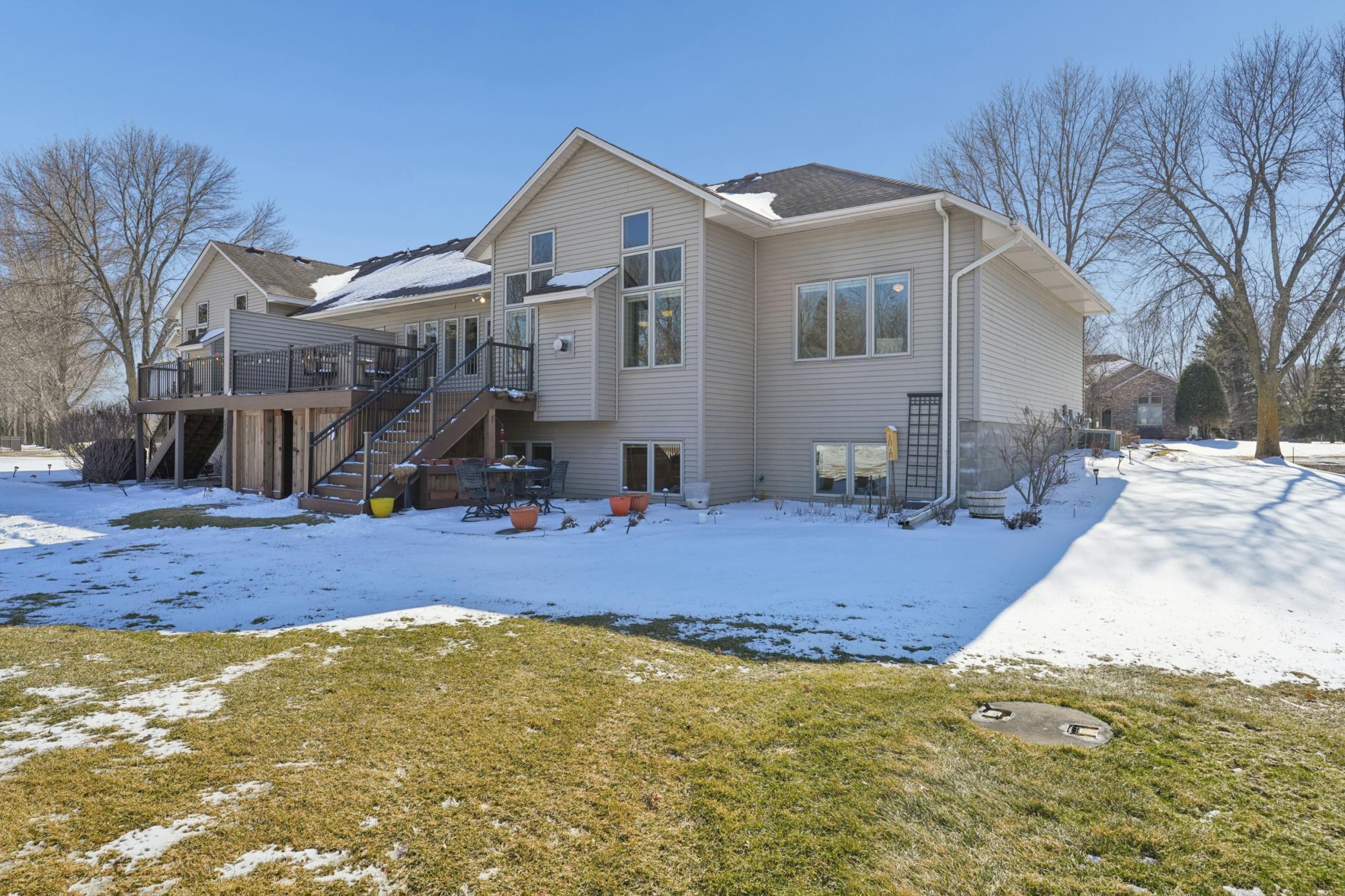 Rarely available in the highly desirable Rum River Hills golf course community, this executive Gorham-built townhome sits beautifully along the 12th green, offering scenic views and a peaceful setting! The inviting front entry leads into a vaulted living room filled with natural light from a striking wall of windows and anchored by a warm gas fireplace, creating a welcoming and comfortable gathering space. The remodeled kitchen and dining area (2021) feature stainless appliances from Warners Stellian, ample cabinet and counter space, and a comfortable informal dining area! Designed for convenient one-level living, the main floor includes a generous primary suite with a walk-in closet, custom built-ins, and a beautifully updated private bath featuring a dual sink vanity and floor-to-ceiling travertine tile shower. Enjoy main level laundry and an updated 1/4 bath, great for guests (both main level bathrooms remodeled in (2022)! The bright and spacious lower level offers a comfortable family room, an additional bedroom, and another updated bath with tile shower (2021)! This home has over $134,000 in upgrades, including a new furnace (2024), water softener (2021), water heater (2021), HRV air exchanger (2023), washer and dryer (2021), and kitchen appliances (2018)! Step outside to the large maintenance free deck, newly built in 2023, complete with stairs leading to the backyard patio, under-deck storage and a golf cart garage, perfect for enjoying the golf course lifestyle!