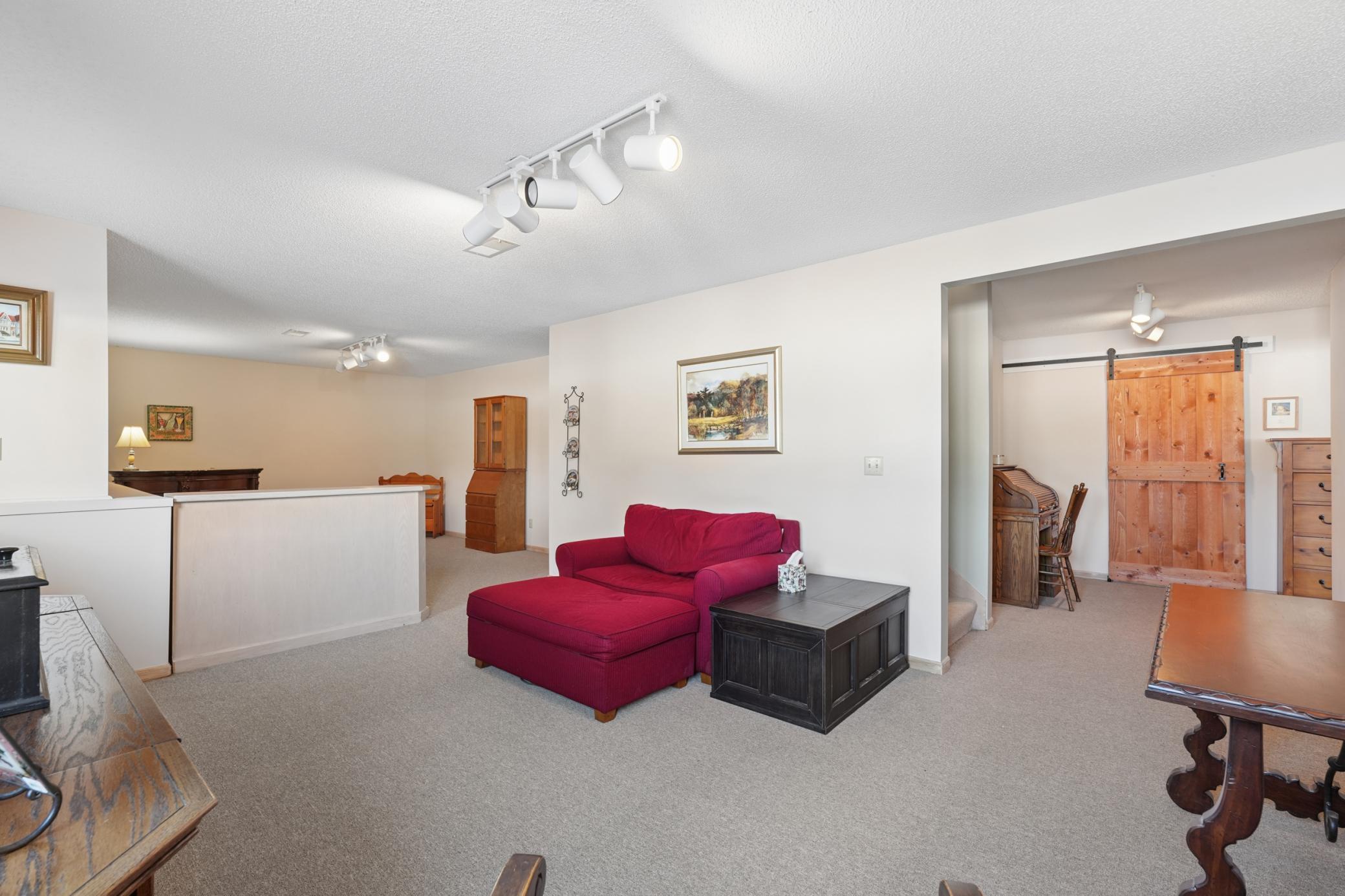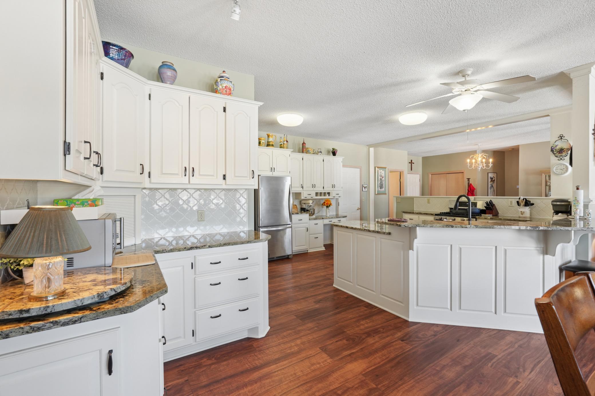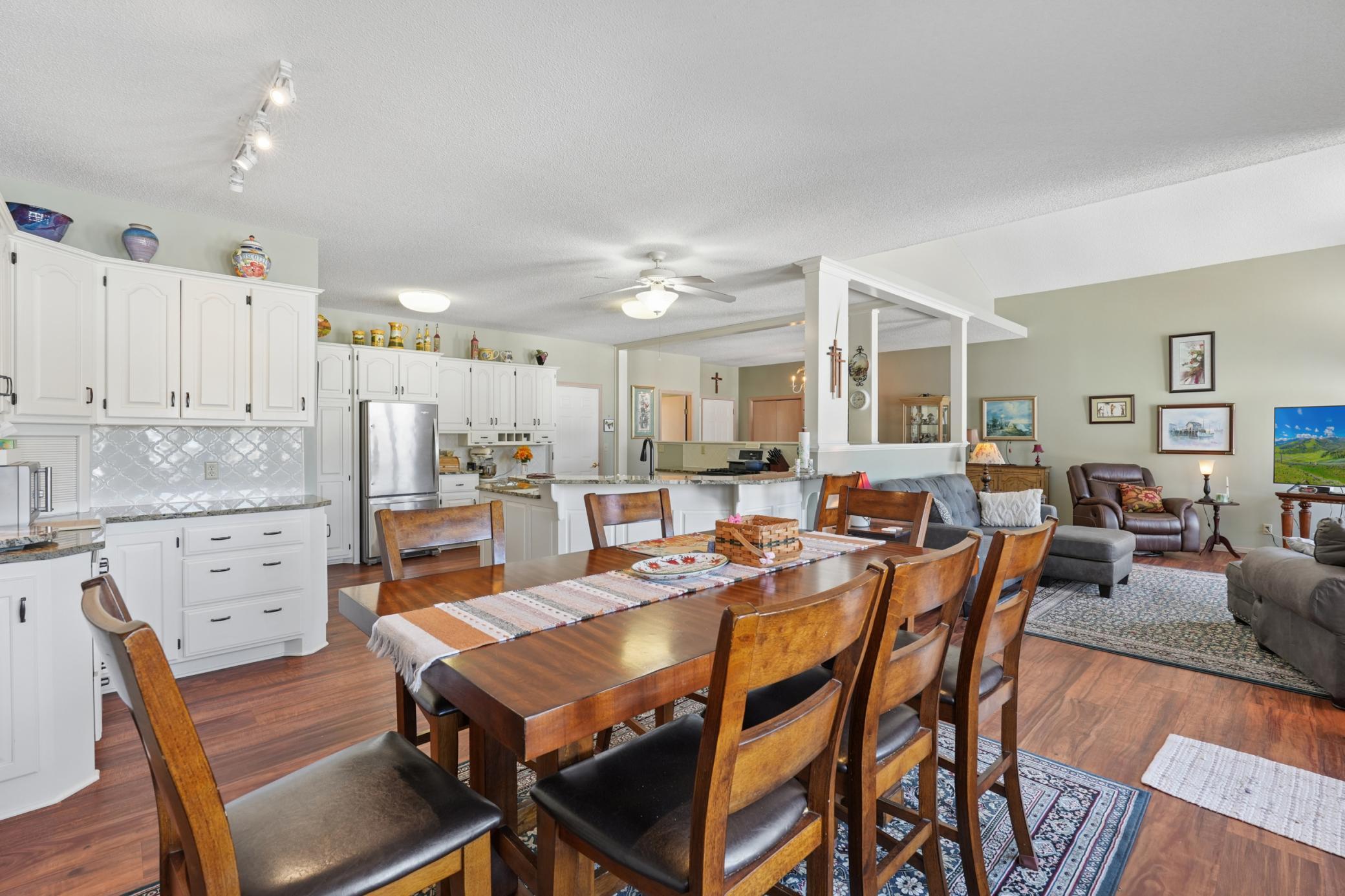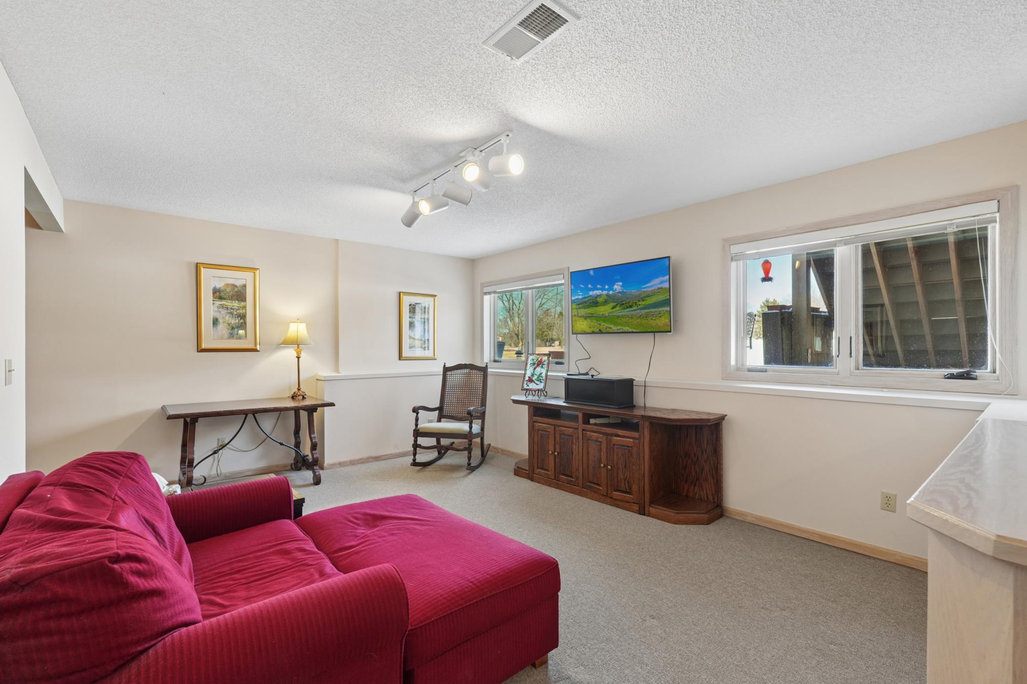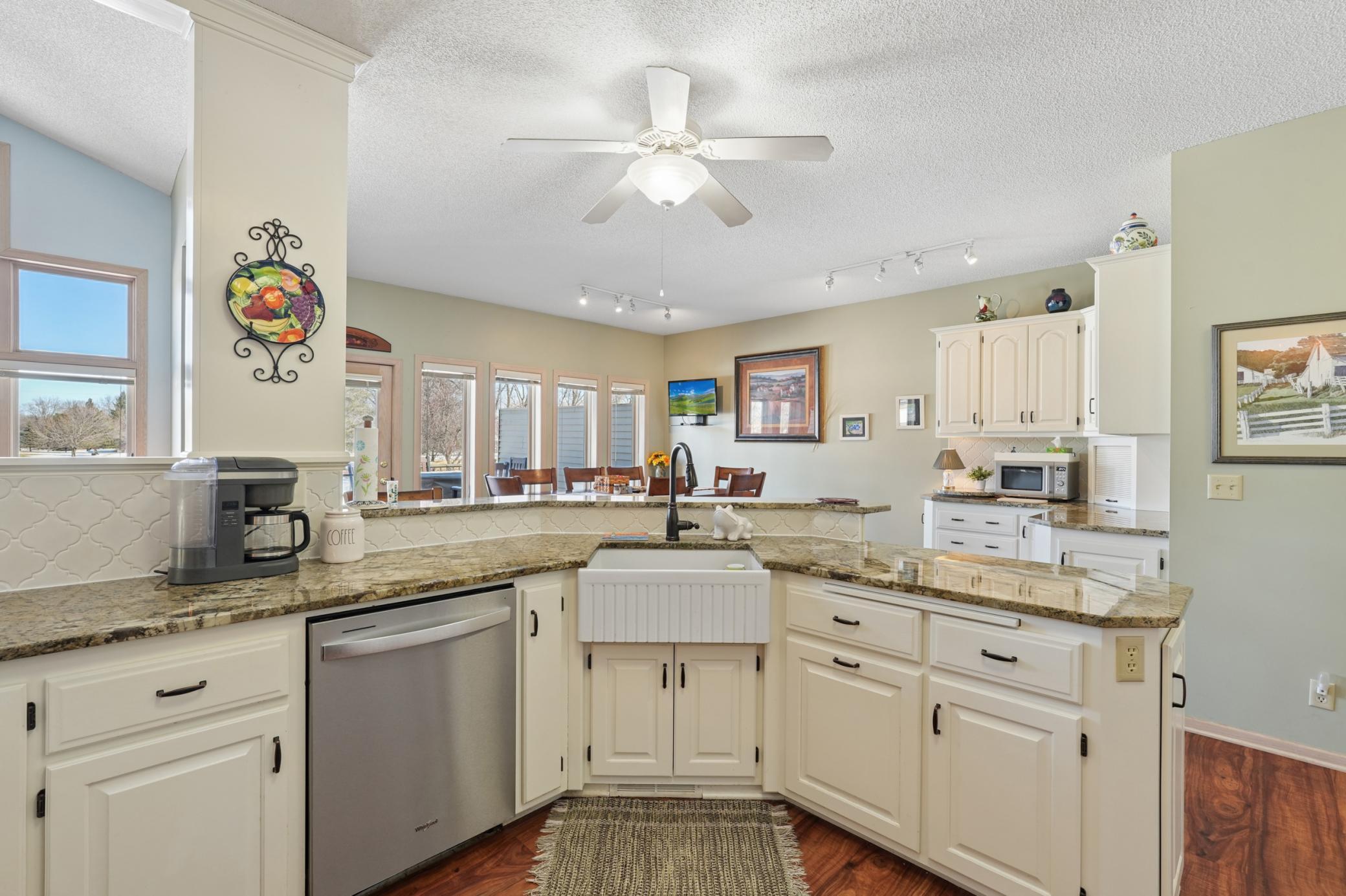 Rarely available in the highly desirable Rum River Hills golf course community, this executive Gorham-built townhome sits beautifully along the 12th green, offering scenic views and a peaceful setting! The inviting front entry leads into a vaulted living room filled with natural light from a striking wall of windows and anchored by a warm gas fireplace, creating a welcoming and comfortable gathering space. The remodeled kitchen and dining area (2021) feature stainless appliances from Warners Stellian, ample cabinet and counter space, and a comfortable informal dining area! Designed for convenient one-level living, the main floor includes a generous primary suite with a walk-in closet, custom built-ins, and a beautifully updated private bath featuring a dual sink vanity and floor-to-ceiling travertine tile shower. Enjoy main level laundry and an updated 1/4 bath, great for guests (both main level bathrooms remodeled in (2022)! The bright and spacious lower level offers a comfortable family room, an additional bedroom, and another updated bath with tile shower (2021)! This home has over $134,000 in upgrades, including a new furnace (2024), water softener (2021), water heater (2021), HRV air exchanger (2023), washer and dryer (2021), and kitchen appliances (2018)! Step outside to the large maintenance free deck, newly built in 2023, complete with stairs leading to the backyard patio, under-deck storage and a golf cart garage, perfect for enjoying the golf course lifestyle!