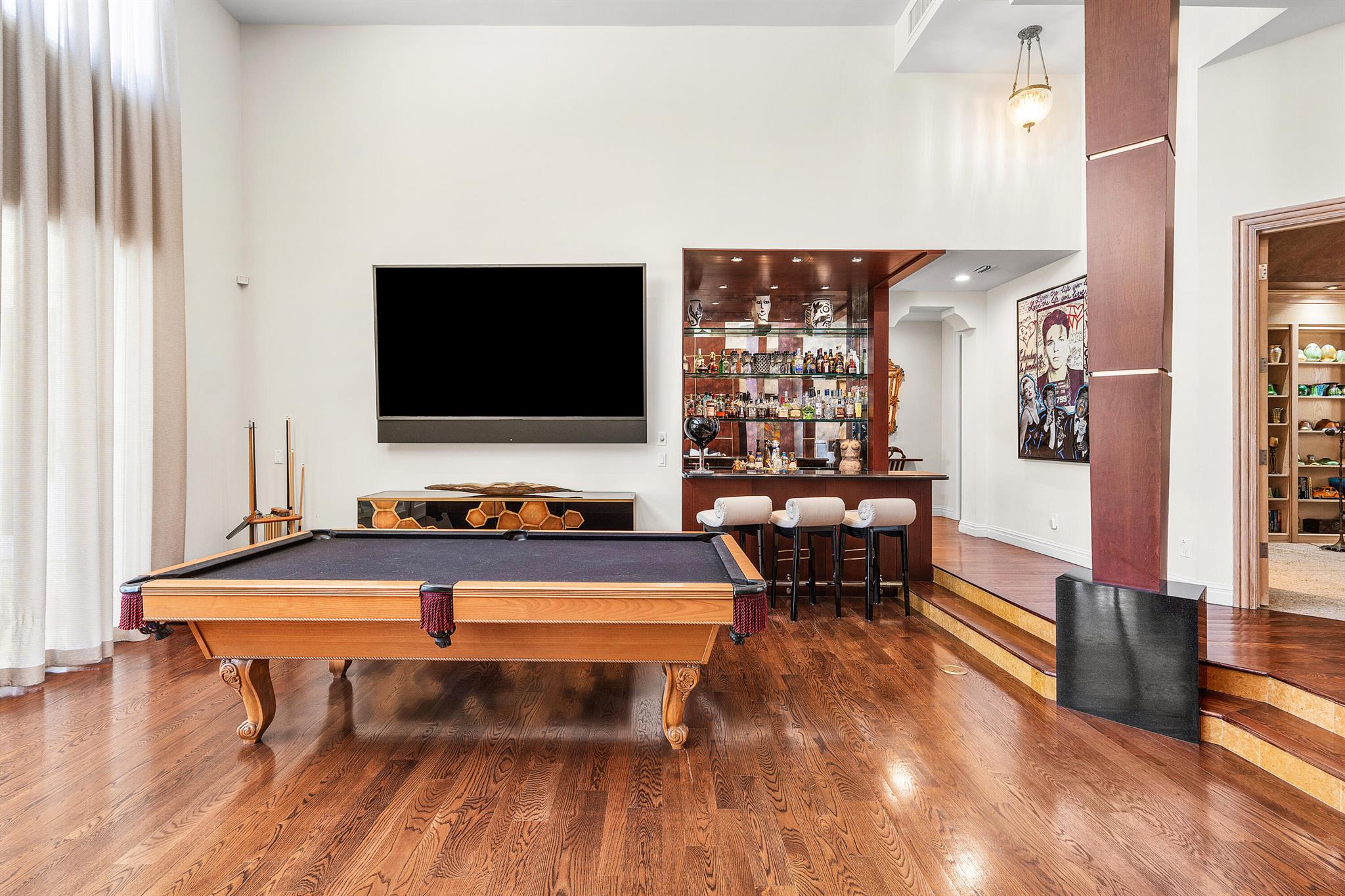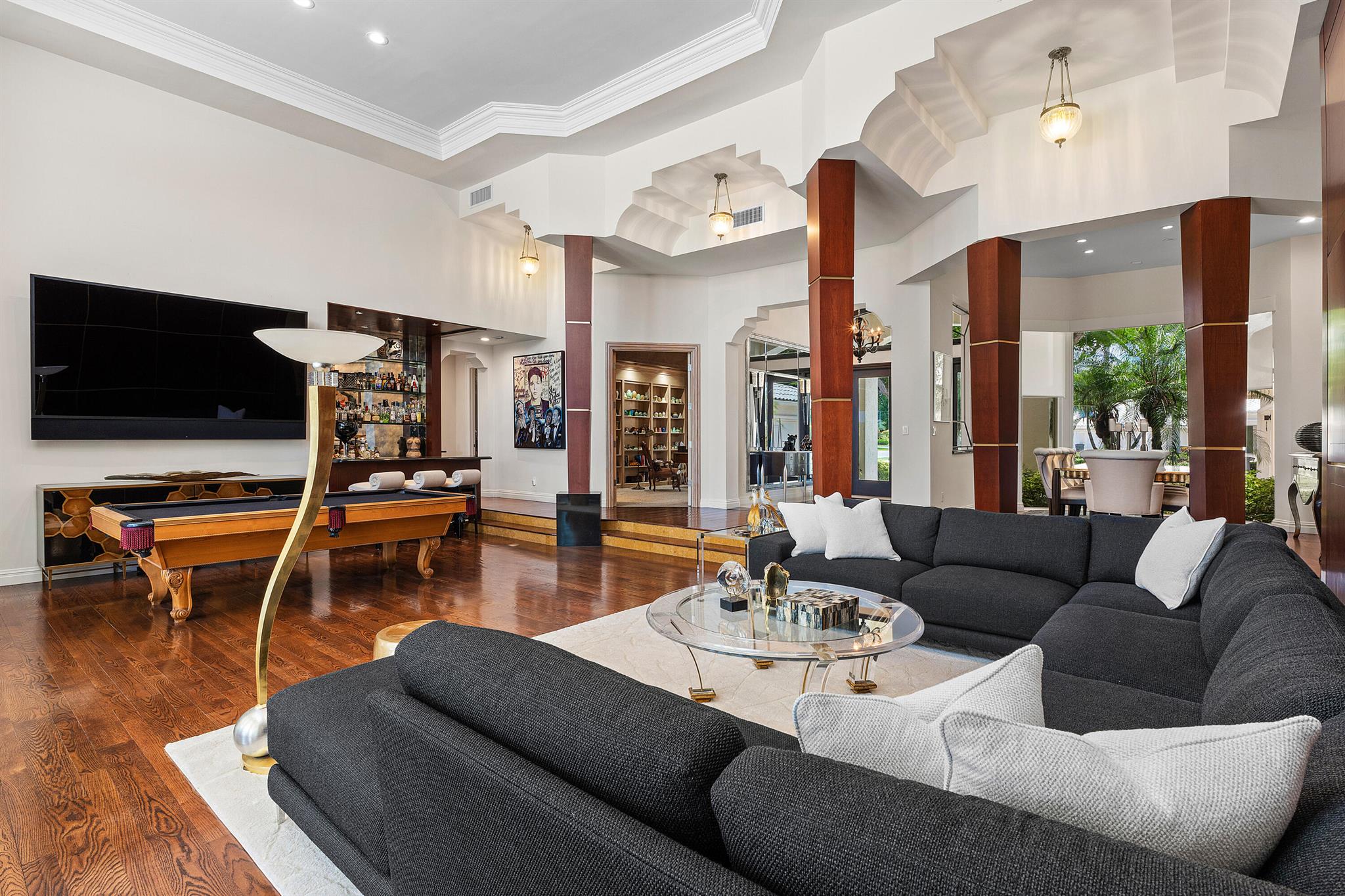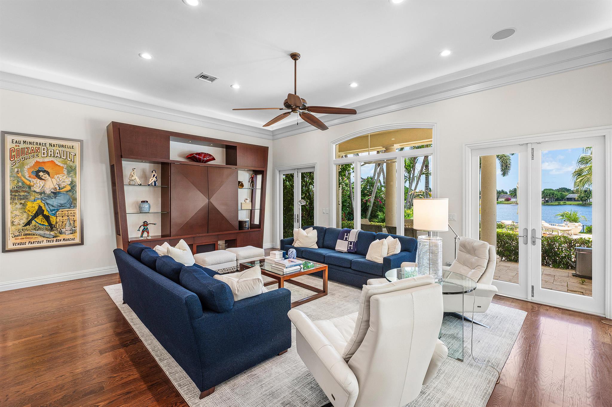 This exceptional lakeside estate blends sophistication, comfort, and timeless design. Nestled beneath a canopy of mature trees and approached by a circular driveway, the home makes an impressive first statement. Inside, rich wood tones, elegant volume ceilings, and refined finishes create a warm yet luxurious atmosphere. The formal living room is a stunning centerpiece, featuring a wet bar and expansive glass doors and windows that showcase serene lake views. The gourmet kitchen is a chef's dream, equipped with a Wolf six-burner gas stove, a Sub-Zero refrigerator, a wine cooler, and a warming drawer. The oversized dining area seamlessly connects to the open family room, while the formal dining room provides an ideal setting for entertaining. The expansive primary suite serves as a
