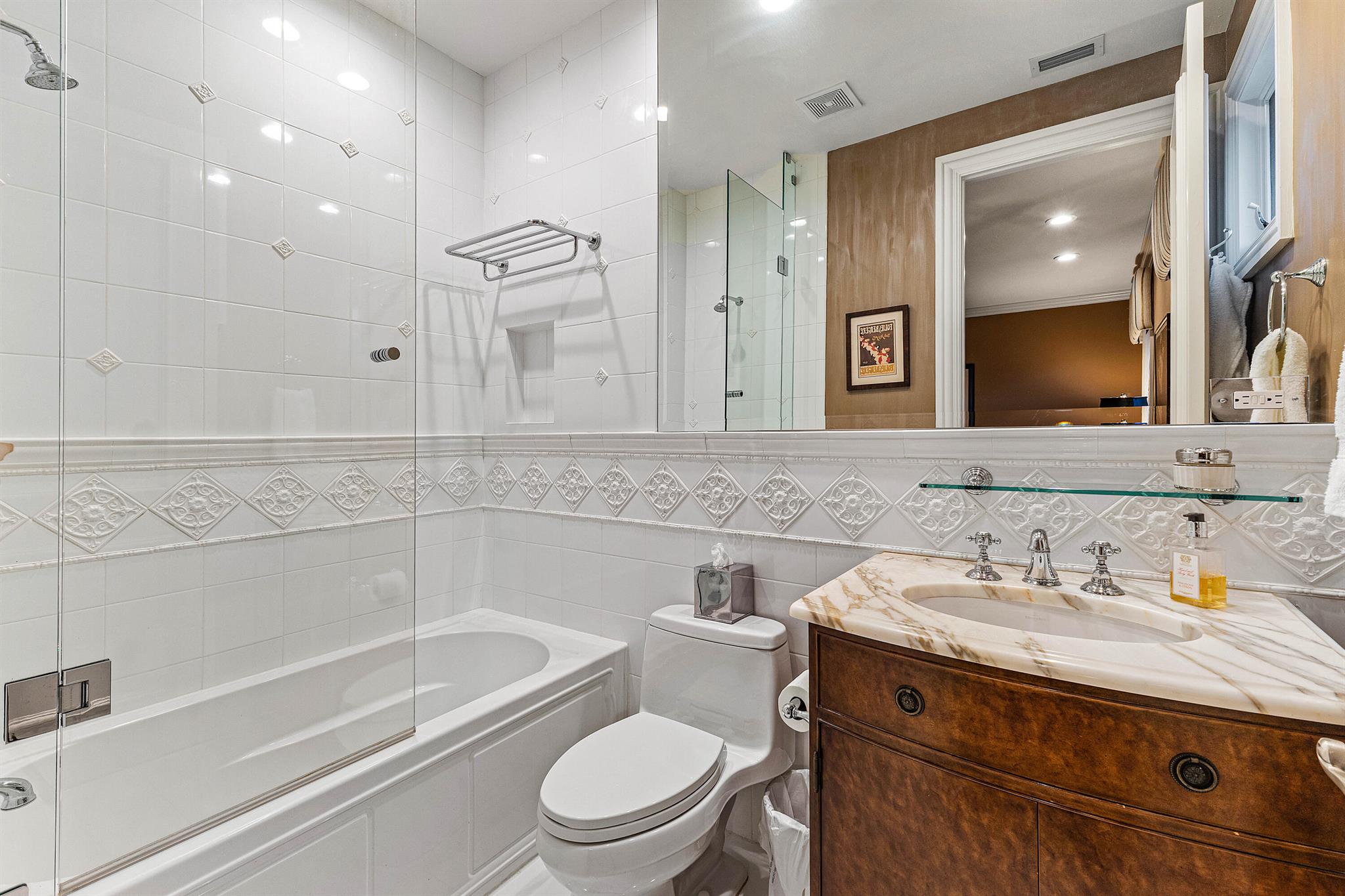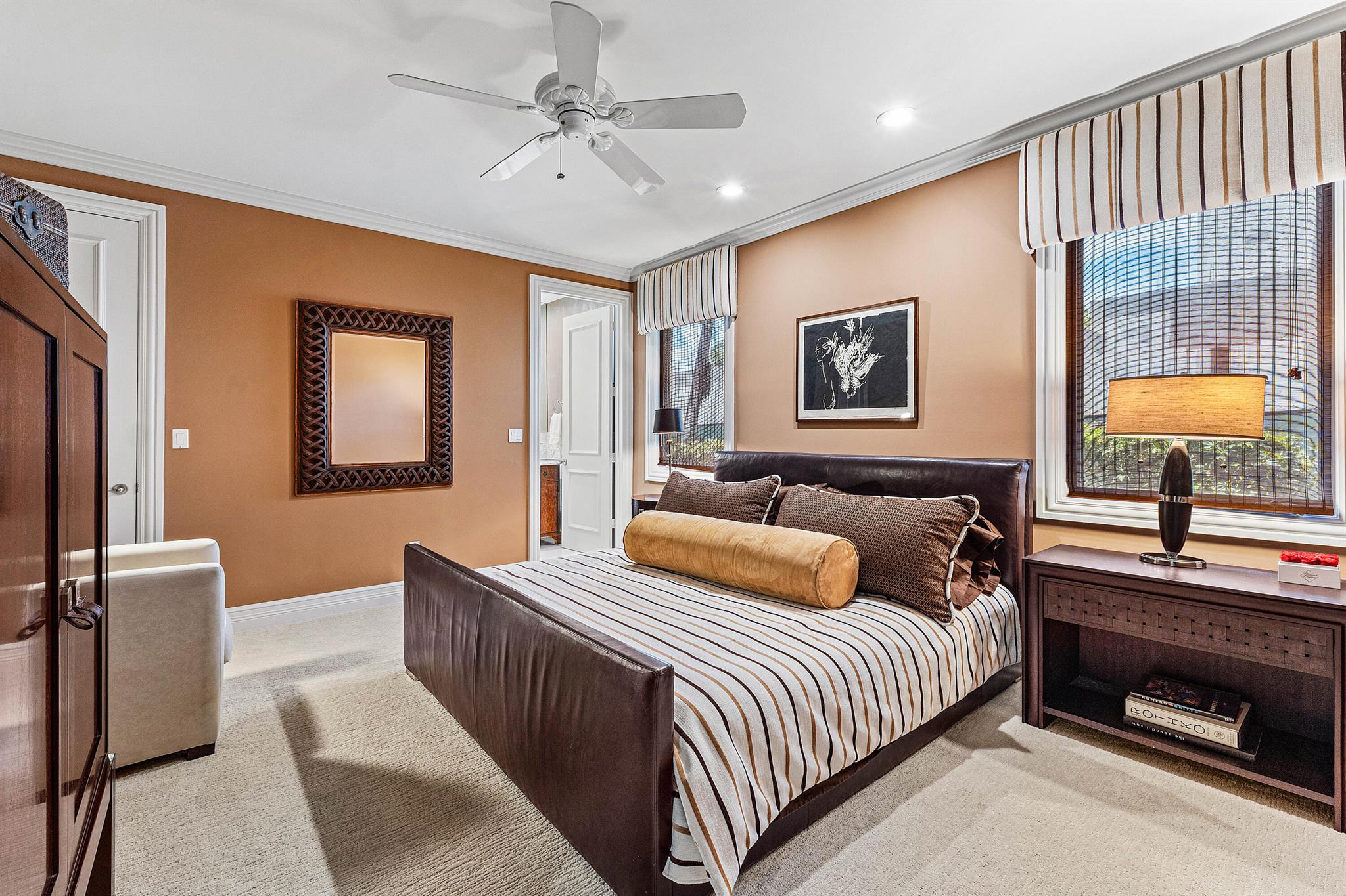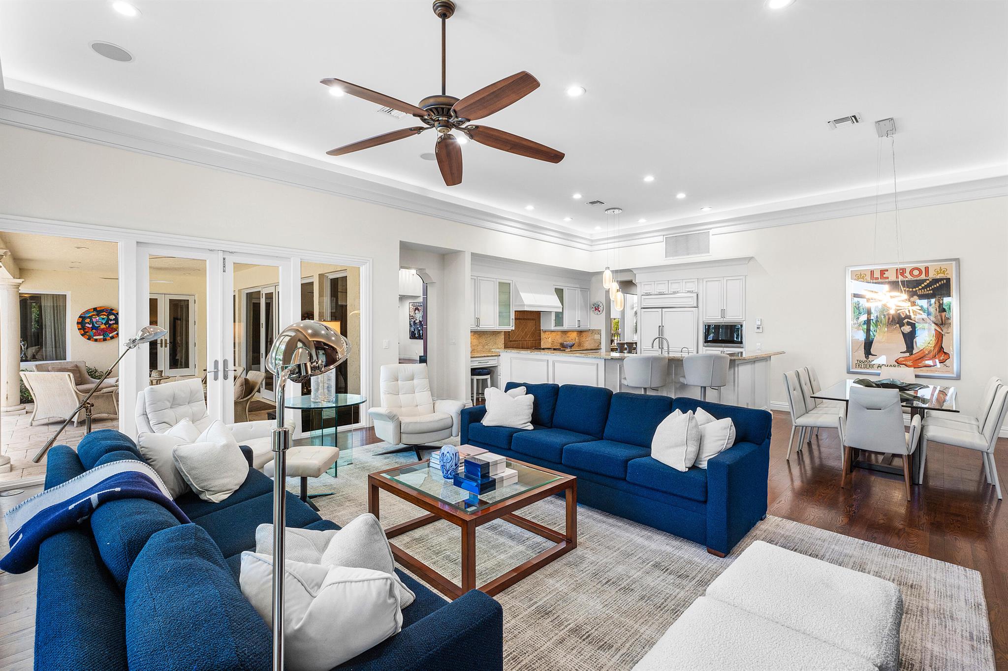 This exceptional lakeside estate blends sophistication, comfort, and timeless design. Nestled beneath a canopy of mature trees and approached by a circular driveway, the home makes an impressive first statement. Inside, rich wood tones, elegant volume ceilings, and refined finishes create a warm yet luxurious atmosphere. The formal living room is a stunning centerpiece, featuring a wet bar and expansive glass doors and windows that showcase serene lake views. The gourmet kitchen is a chef's dream, equipped with a Wolf six-burner gas stove, a Sub-Zero refrigerator, a wine cooler, and a warming drawer. The oversized dining area seamlessly connects to the open family room, while the formal dining room provides an ideal setting for entertaining. The expansive primary suite serves as a