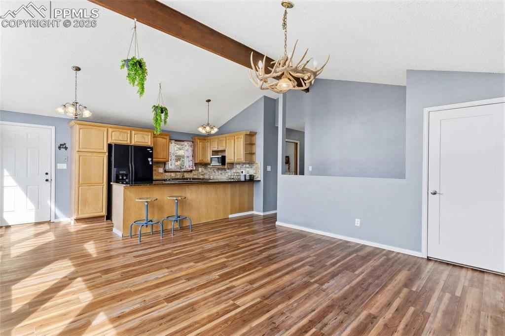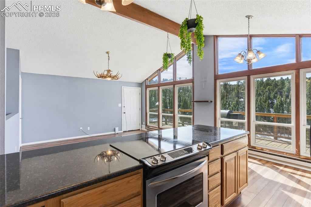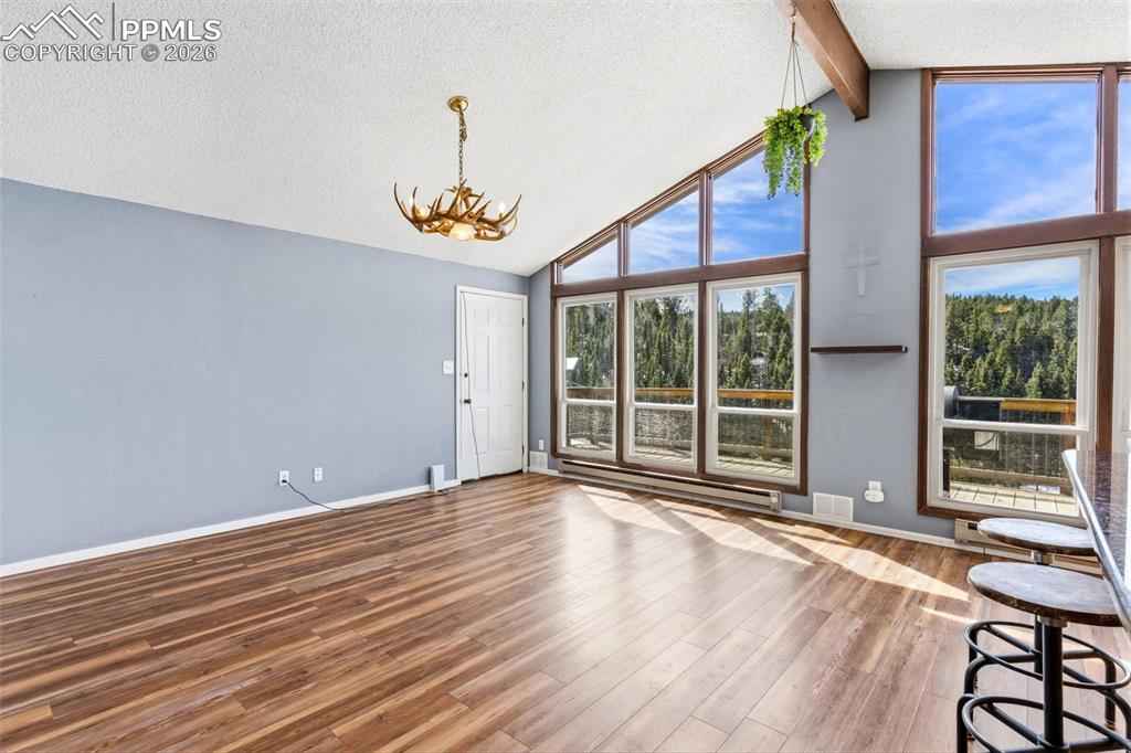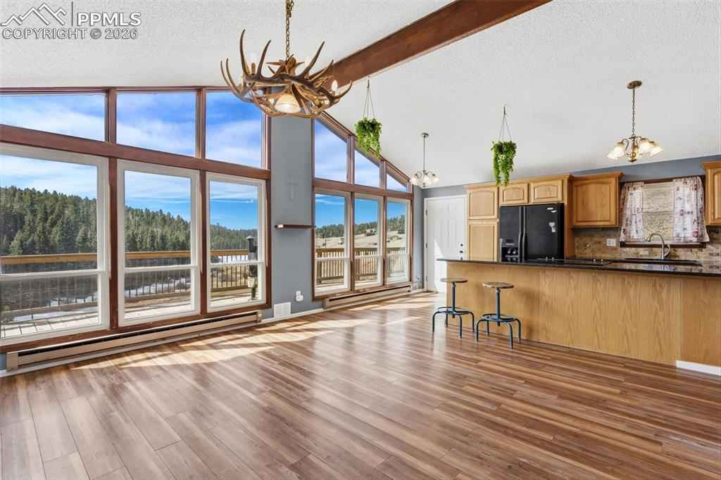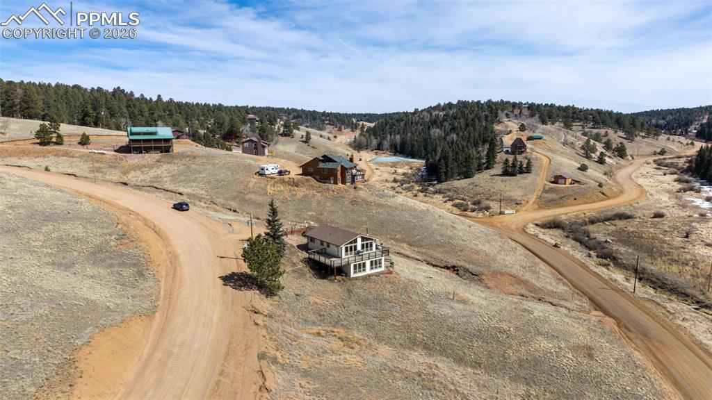 Tucked into the scenic Highland Lakes community, this inviting raised ranch offers a blend of Colorado charm, everyday comfort, and space to truly spread out. Set on 1.39 acres with views toward Elk Lake, the setting feels peaceful and private while still being conveniently located hear Highway 24 for an easy drive to Woodland Park, Colorado Springs, or even a quick trip to Cripple Creek. Inside, the home welcomes you with vaulted ceilings, exposed beam accents, and a wall of windows that brings the outdoors in. The main living area feels open and connected, with the living room flowing into the kitchen, where granite countertops and included appliances make it easy to settle right in. Laminate flooring runs throughout, creating a cohesive and low-maintenance feel. The lower-level family room offers a cozy retreat with a pellet stove and walk-out access to a sunroom that adds even more flexible living space. With tile flooring and a tongue-and-groove ceiling, itx2019;s the kind of room youx2019;ll find yourself using year-roundx2014;perfect as a sitting area, home office, workout space, or playroom. With four bedrooms and two full bathrooms, therex2019;s room for everyone, and the updated baths add a fresh, modern touch. Step outside and take in the expansive wraparound deck, ideal for morning coffee, evening sunsets, or simply enjoying the quiet surroundings. Rustic yet refined, the home also features natural gas and high-speed internet, giving you the best of mountain living without sacrificing modern convenience. Located within the RE-2 Woodland Park school district and close to stocked fishing at Elk Lake, this is a property that offers both lifestyle and livability in one of Dividex2019;s most desirable communities.