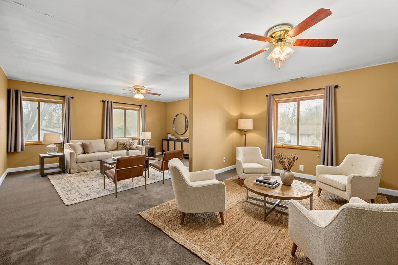 Spacious and updated 5-bedroom, 3.5-bath home on a beautifully landscaped half-acre lot. This property offers exceptional indoor and outdoor living with an upgraded kitchen featuring custom cabinetry, solid-surface countertops, stainless steel appliances, and a breakfast bar. The vaulted dining room includes a bay window, and the bright living room offers hardwood flooring. A stunning sunroom with floor-to-ceiling windows, knotty pine detailing, and a vaulted ceiling provides views of the backyard and convenient access through French doors. The main level includes three bedrooms, a full bath, and a half bath with laundry. The upper level features a private primary suite with walk-in closet and an additional 26x17 bedroom or flex room. A walk-up attic provides excellent storage options. Additional highlights include an oversized two-car garage with cabinets and a desirable location on a channel of the Kishwaukee River, close to Hopkins Park and recreational amenities. This move-in ready home offers versatility, comfort, and a serene natural setting.