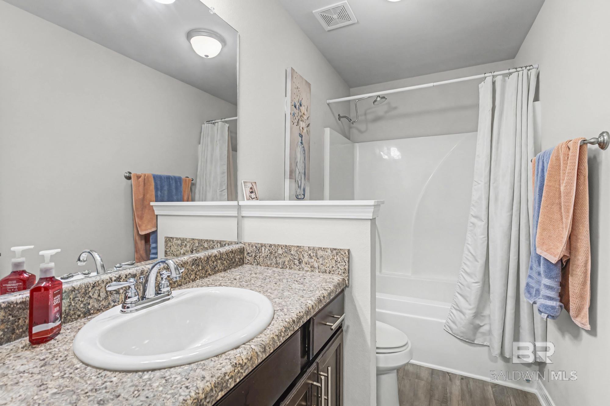 **OPEN HOUSE: Saturday, March 21st | 2:00-4:00 pm** Seller will entertain all offers! Built by John Howard Homes, this MACON III plan is located in the sought-after Woodland Hills subdivision and tucked on a quiet cul-de-sac. The low-maintenance brick exterior with dimensional shingles and a FORTIFIED roof offer lasting curb appeal and added protection, while the interior layout is designed for everyday functionality. Inside, youll find luxury wood plank flooring and a spacious open-concept living area that connects seamlessly to the kitchen. The kitchen features granite countertops, stainless steel appliances, custom cabinetry, and a large island overlooking the family room. The split-bedroom layout provides privacy, with a generously sized primary suite that includes a tray ceiling, ceiling fan, double vanities, a separate shower and soaking tub, and a walk-in closet with direct access to the laundry room for added efficiency. Additional highlights include an attached double garage, keyless Schlage entry system, privacy-fenced backyard with an open patio, and a security system with interior and exterior cameras plus motion detection. Energy-efficient and storm-ready features include LP TechShield Radiant Heat Barrier in the attic, a Square D electrical panel with surge breaker, and storm shutters. Buyer to verify all information during due diligence.