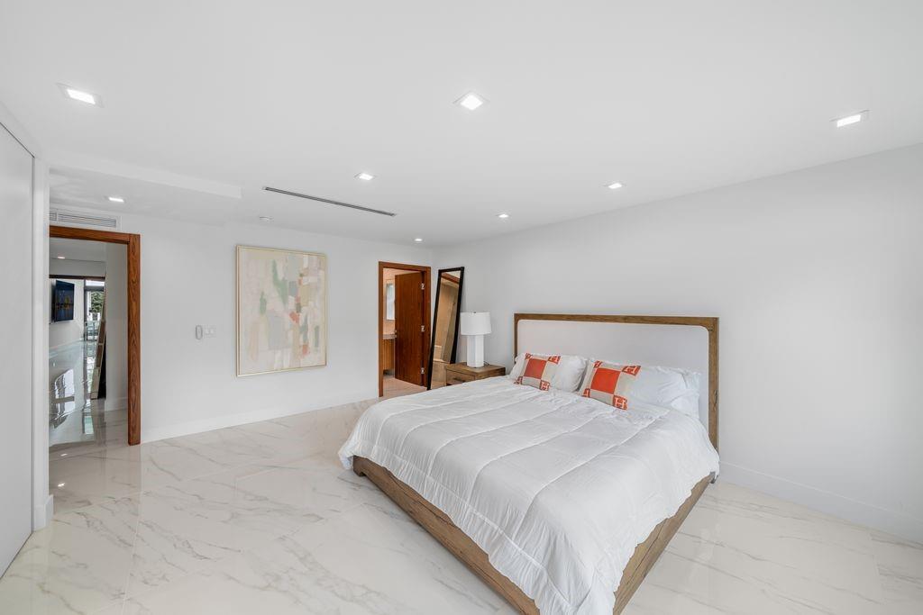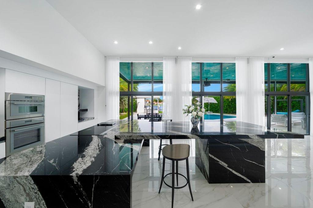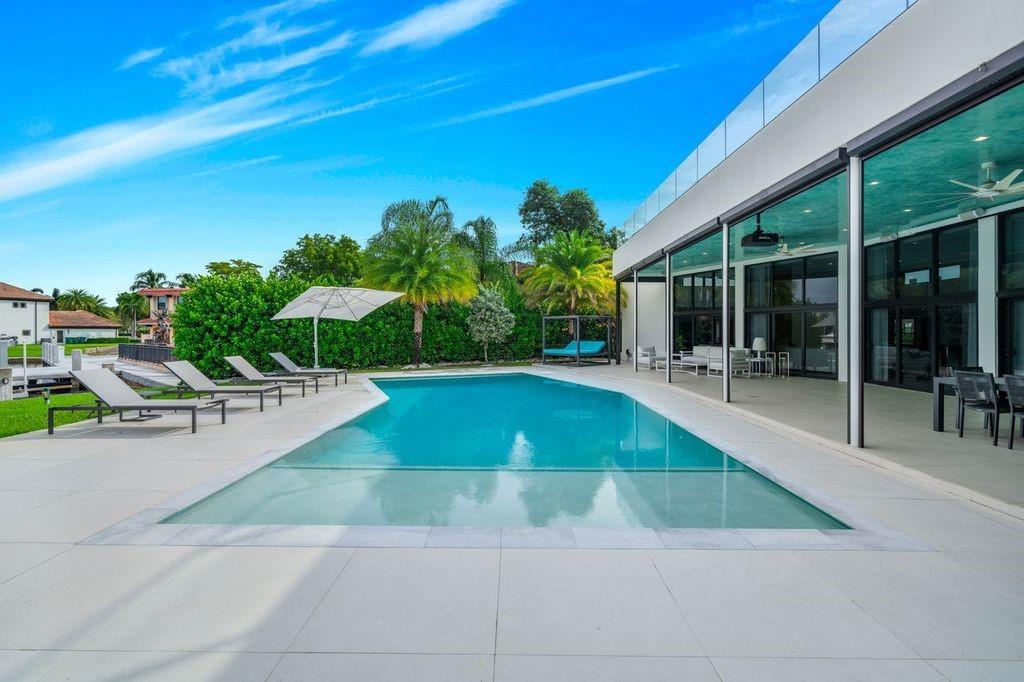 Magnificent waterfront estate in Sea Ranch Lakes, a gated home within the exclusive 24-hr guard-gated community with private beach club. Set on a 22,000+ sq. ft. lot with 80 ft. of direct Intracoastal frontage, this residence boasts lush landscaping, a resort-style pool, and expansive outdoor spaces designed for entertaining. A huge roof terrace offers panoramic water views. Inside, the flow-through plan includes 7 rooms, 5 full + 2 half baths, and an Italian imported kitchen with new countertops, built-in bar, and extendable island. Additional upgrades include a state-of-the-art facial recognition security system, outdoor kitchen with new counters and bar, master suite with custom closet, and updated garage with fridge, beverage fridge, and wall organization panels.