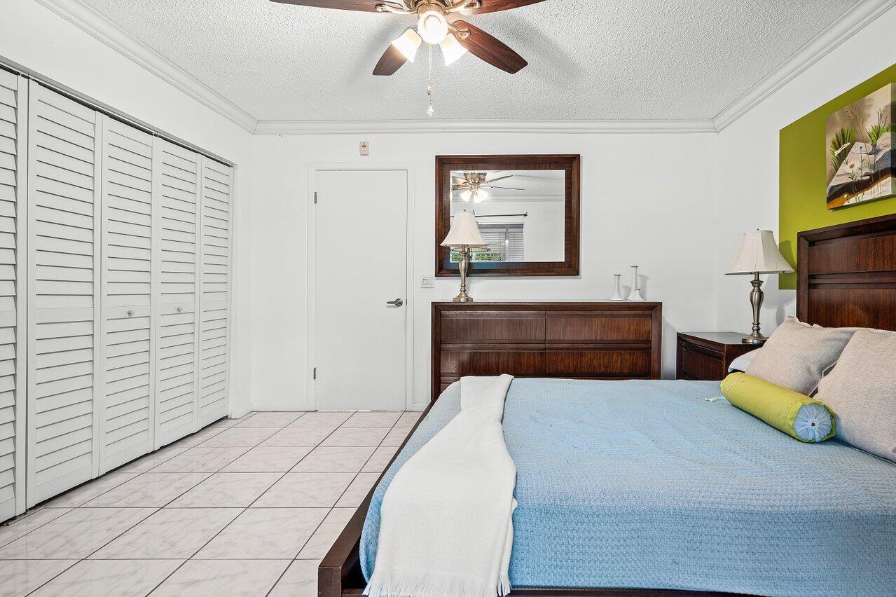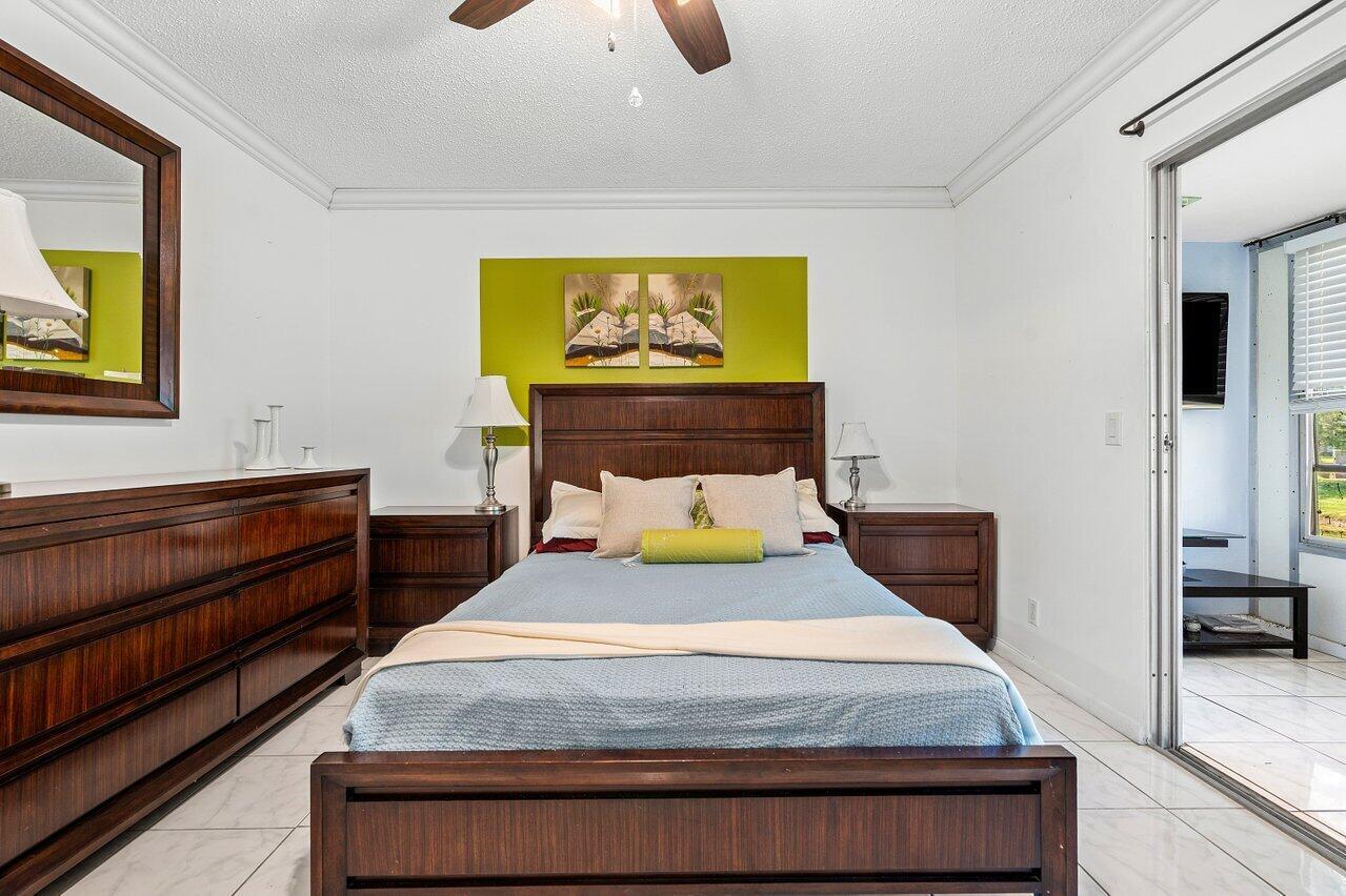 NEW ROOF! Beautifully updated second floor unit in the 55+ community of Century Village East. Meticulously taken care of and move-in ready. The open-concept gourmet kitchen features newer stainless steel appliances, bar seating, and flows seamlessly into the living and dining area. Tile flooring throughout (no carpet). Updated bathroom with shower/tub combo. Two oversized closets and ample cabinet space offer excellent storage space. Enclosed patio with canal view. Condo fee includes cable, water, and access to a multi-million dollar clubhouse with a gym, movie theater, pickleball, pools, yoga, art classes, and on-site restaurant. Assigned parking space and storage unit included. Laundry room just one door away.