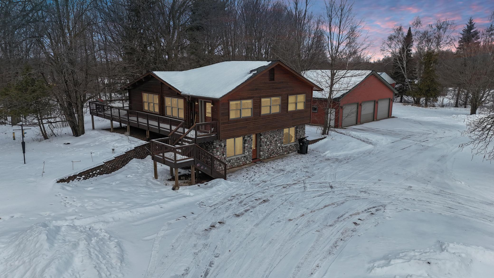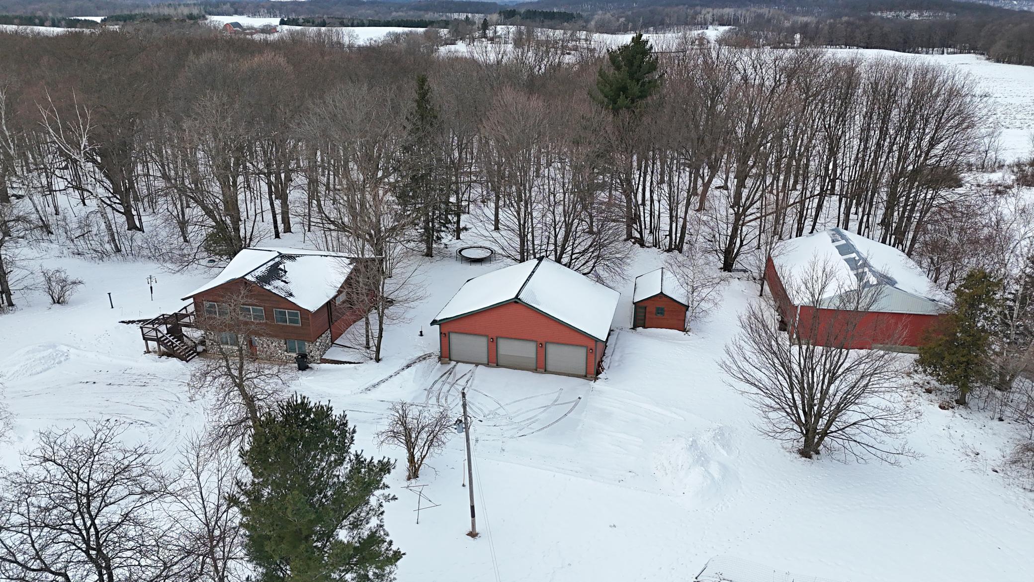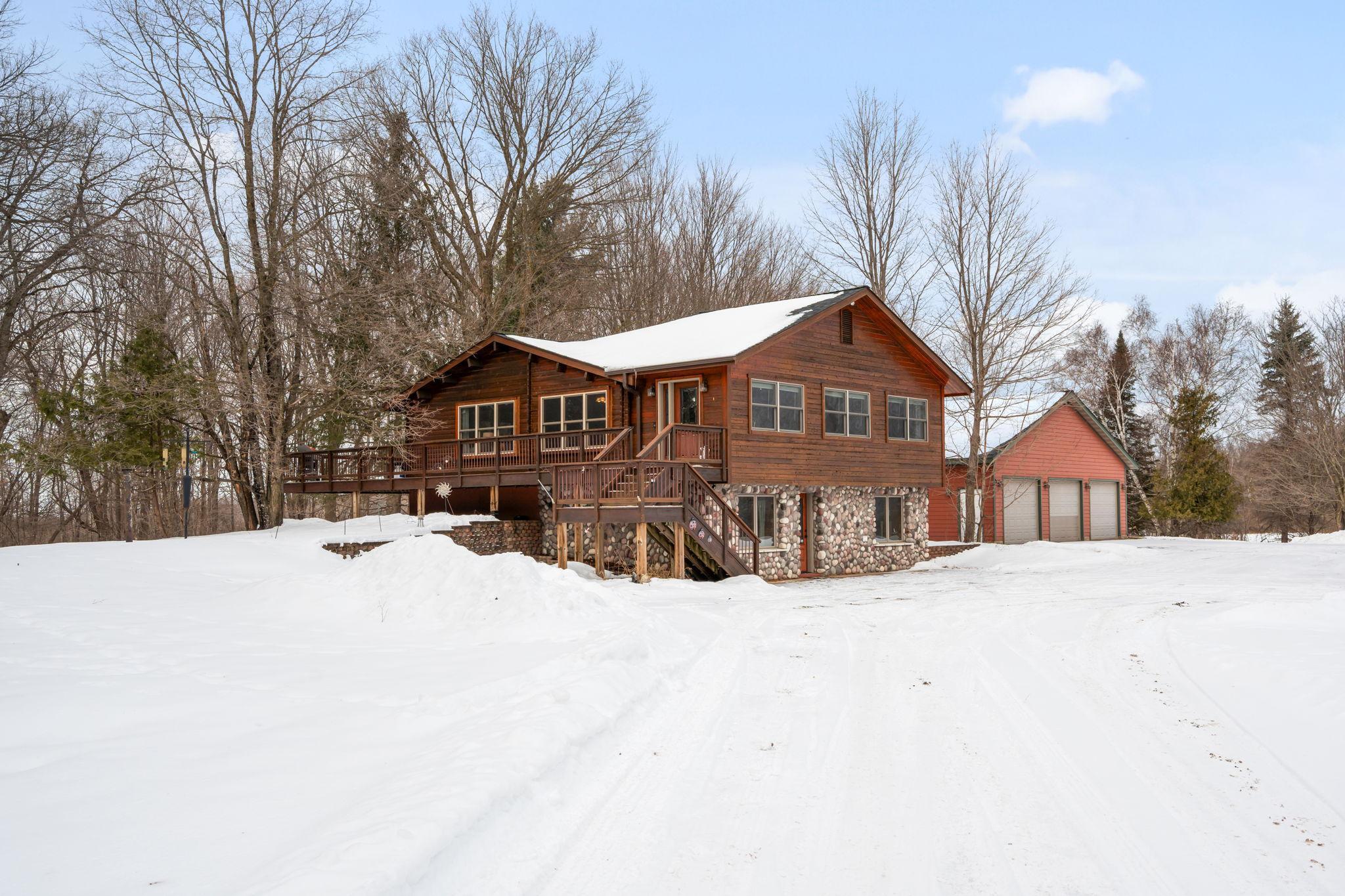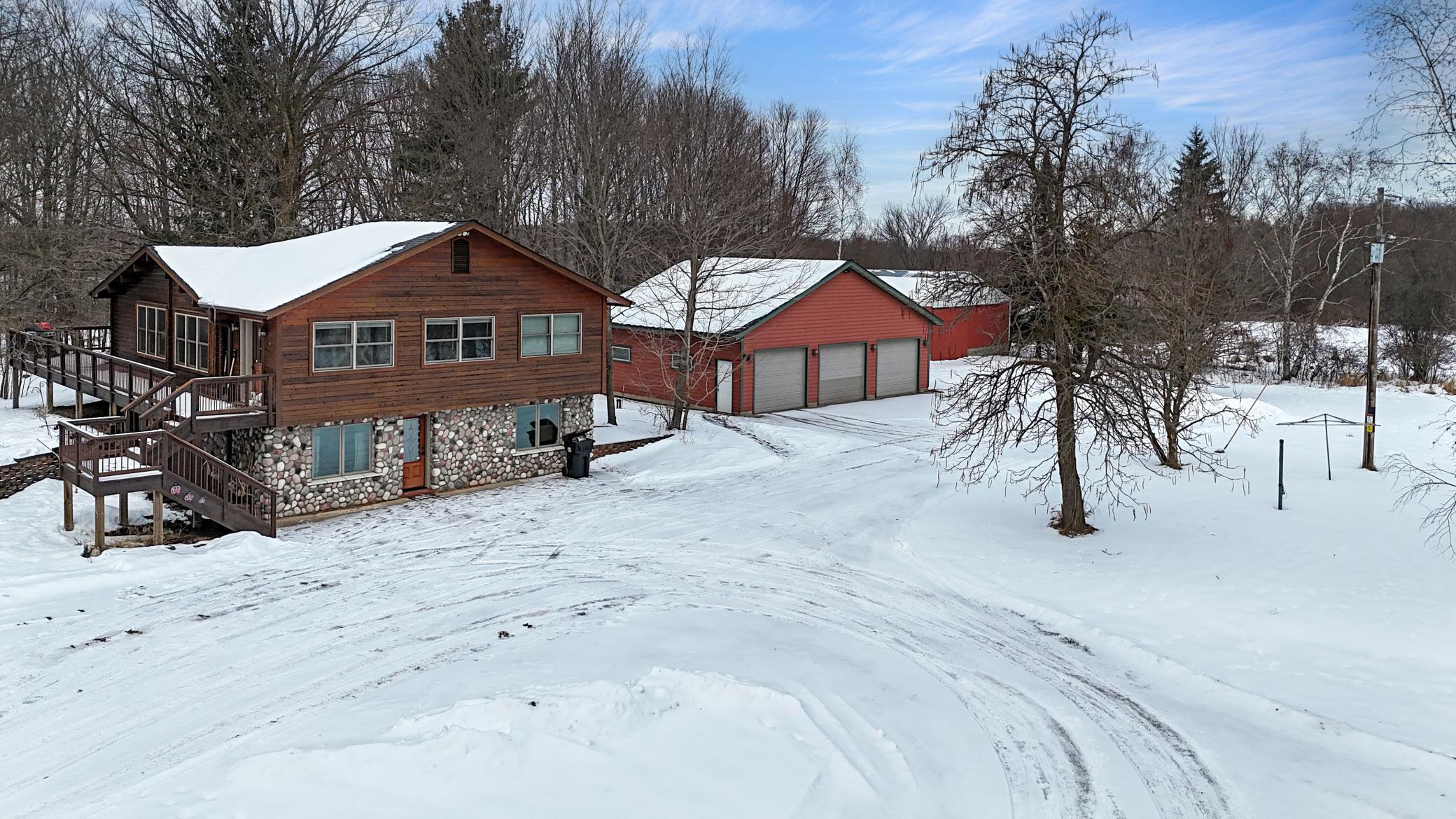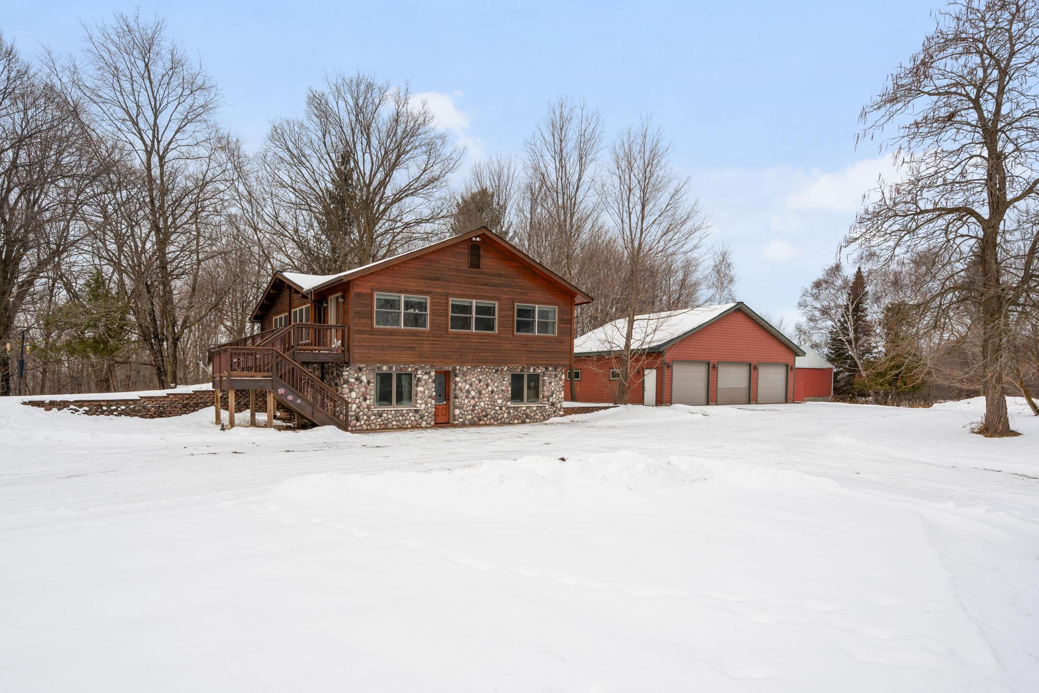 Well-maintained cedar log home on a beautiful 11-acre parcel offering privacy, functionality, and country living. This spacious 5-bedroom, 3-bath home features a flexible floor plan with generous living spaces, comfortable gathering areas, and ample bedrooms for everyday living or entertaining. Numerous updates reflect pride of ownership, including a new roof in 2023 and many updated windows, making the home truly move-in ready. Step out onto the deck and relax in the hot tub while enjoying the peaceful surroundings. The scenic acreage includes apple trees and mature grapevines and is set on a quiet Rustic Road. Outbuildings are a standout, featuring a 40x52 pole shed ideal for storage, equipment, or hobbies, along with a 30x40 heated 3-car garage offering year-round convenience. With acreage, multiple outbuildings, and thoughtful updates throughout, this property is perfect for those seeking space, privacy, and a true country lifestyle.
