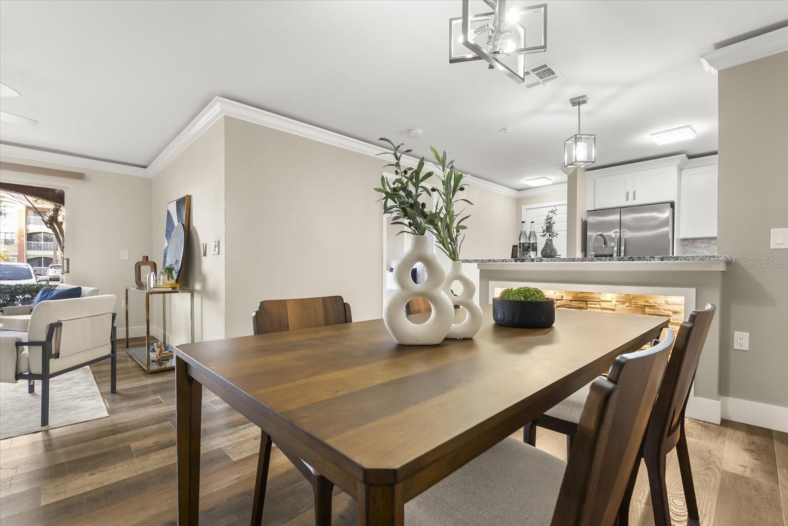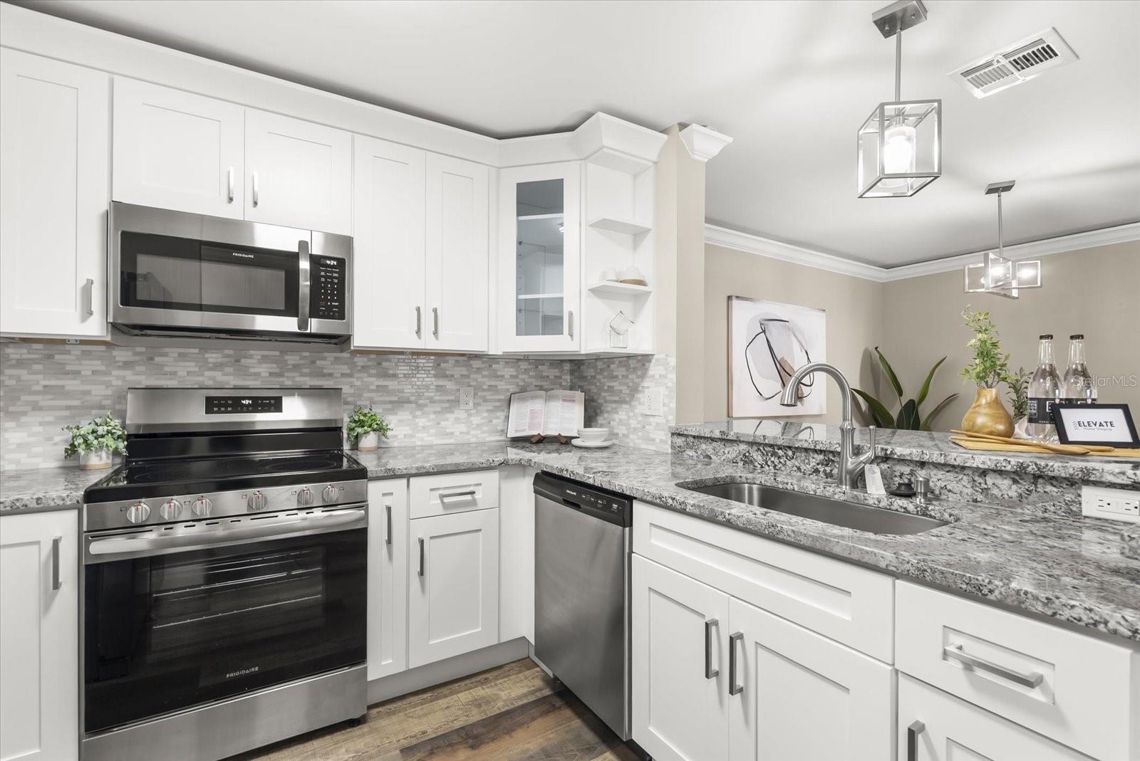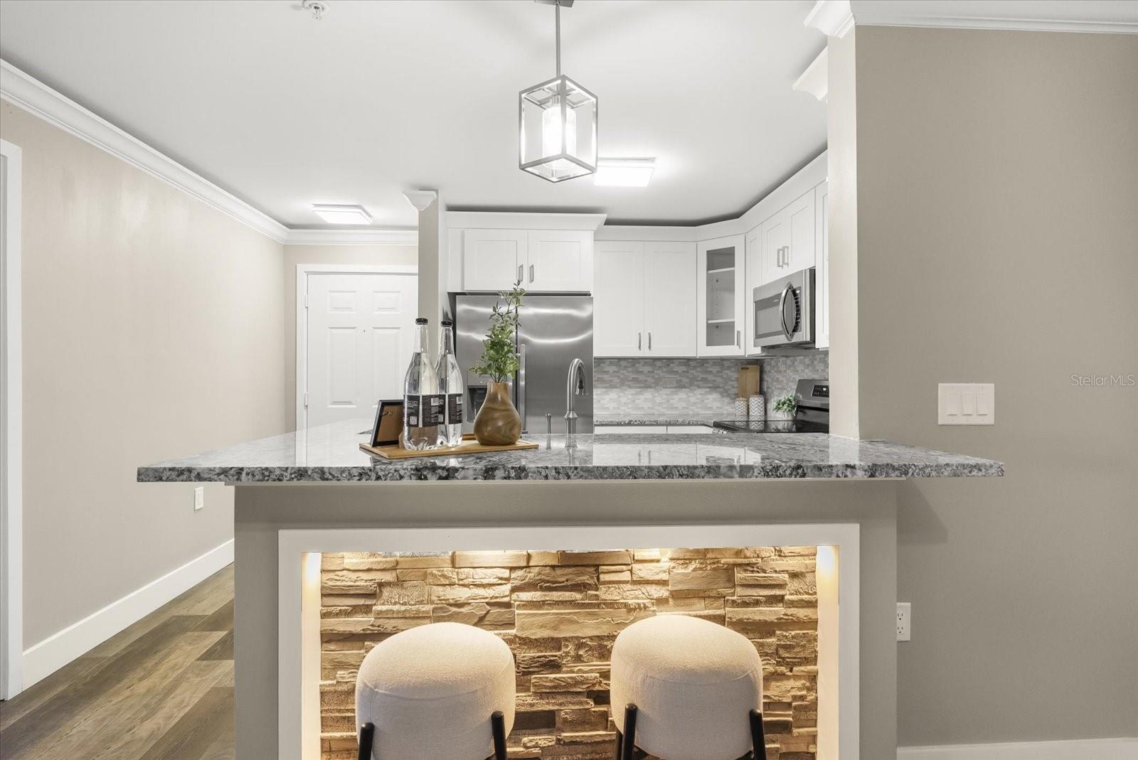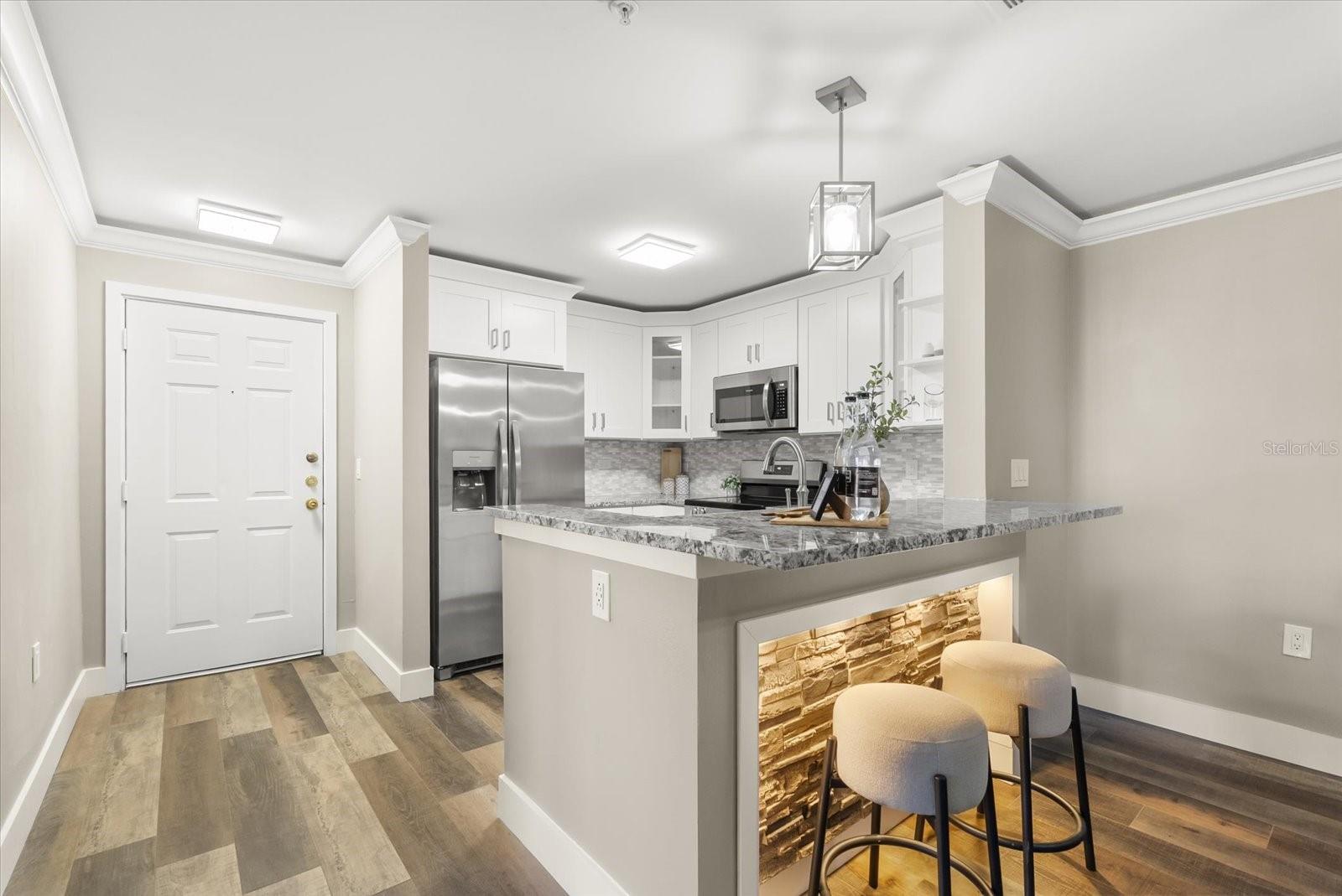 Beautiful, Completely Renovated Ground Level, 2 bedroom 2 bath condominium in Oviedo's Villas at Lakeside. All finishes and surfaces are new! The open Kitchen with breakfast bar features granite countertops, new appliances, and shaker style cabinetry. The combination kitchen/living/dining spaces have all new paint, crown molding and LED lighting. These updates continue throughout the rest of the unit with multiple designer accents including a stone accent on breakfast bar and built in shelving in the guest room. The primary suite boasts a walk-in-closet and newly renovated ensuite. The second bath was also newly renovated. A indoor laundry room with extra bonus storage room completes the functional redesign of the spaces. This popular ground floor unit also has an open patio with storage. The community itself is well appointed with clubhouse, pool, tennis courts, fitness center, playground, walking paths and benches by the lake, and even a car cleaning facility. Great schools, close to UCF, Seminole State College, Oviedo Medical Center, shopping and restaurants and 417 it is a convenient location for access to Central Florida as a whole. HVAC 2022, installed at the beginning of the renovation, New Electrical Panel/Surge Protection/GFCI Breakers installed in 2023. The wiring was also updated to host the smart LED lighting system.