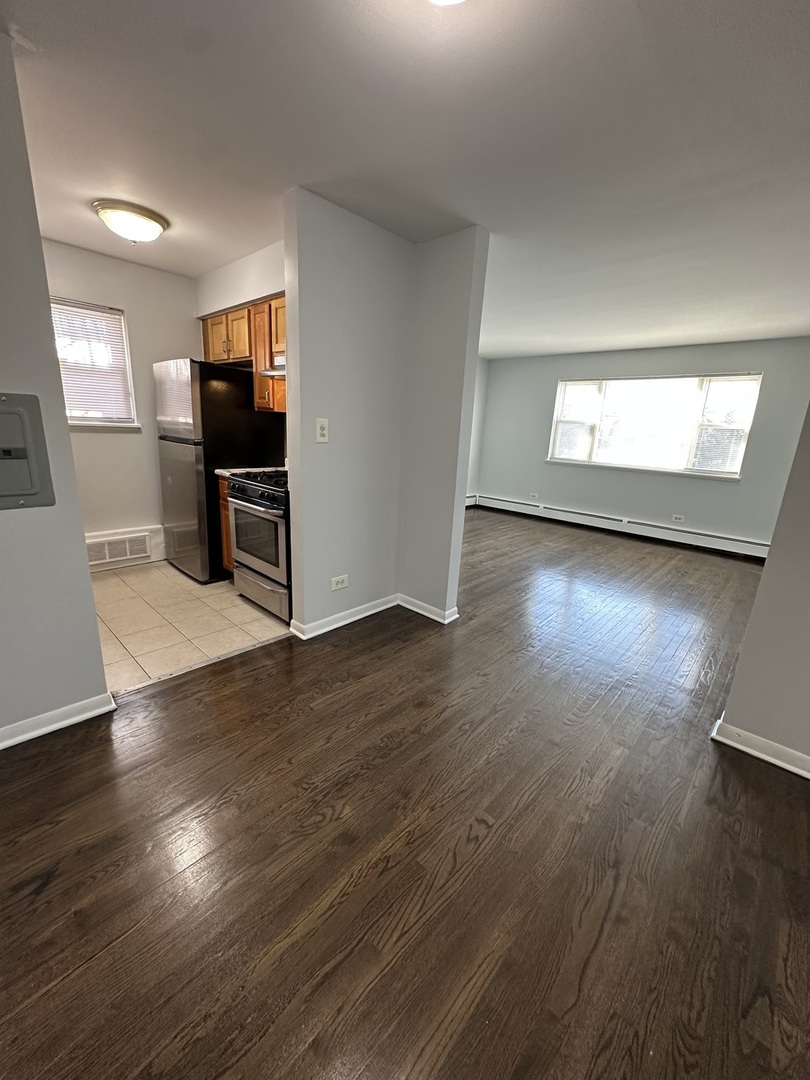 Available 5/1- Bright and well-maintained top floor 2-bedroom, 1-bath apartment offering a spacious and functional layout in a convenient Evanston location. The unit features hardwood floors throughout and a large, sun-filled living room with oversized windows, creating a warm and welcoming living space. The separate kitchen includes stainless steel appliances, gas range, ample cabinetry, and durable tile flooring. A dedicated dining area provides flexibility for dining, work-from-home, or additional living space. Both bedrooms are generously sized with hardwood floors, ceiling fans, good closet space, and natural light. The updated bathroom features a tiled tub/shower, modern vanity, and clean, neutral finishes. Additional highlights include on-site laundry, assigned parking included, baseboard heat, fresh neutral paint, and a well-kept brick building. Ideally located near shopping, dining, parks, public transportation, and all that Evanston has to offer.
