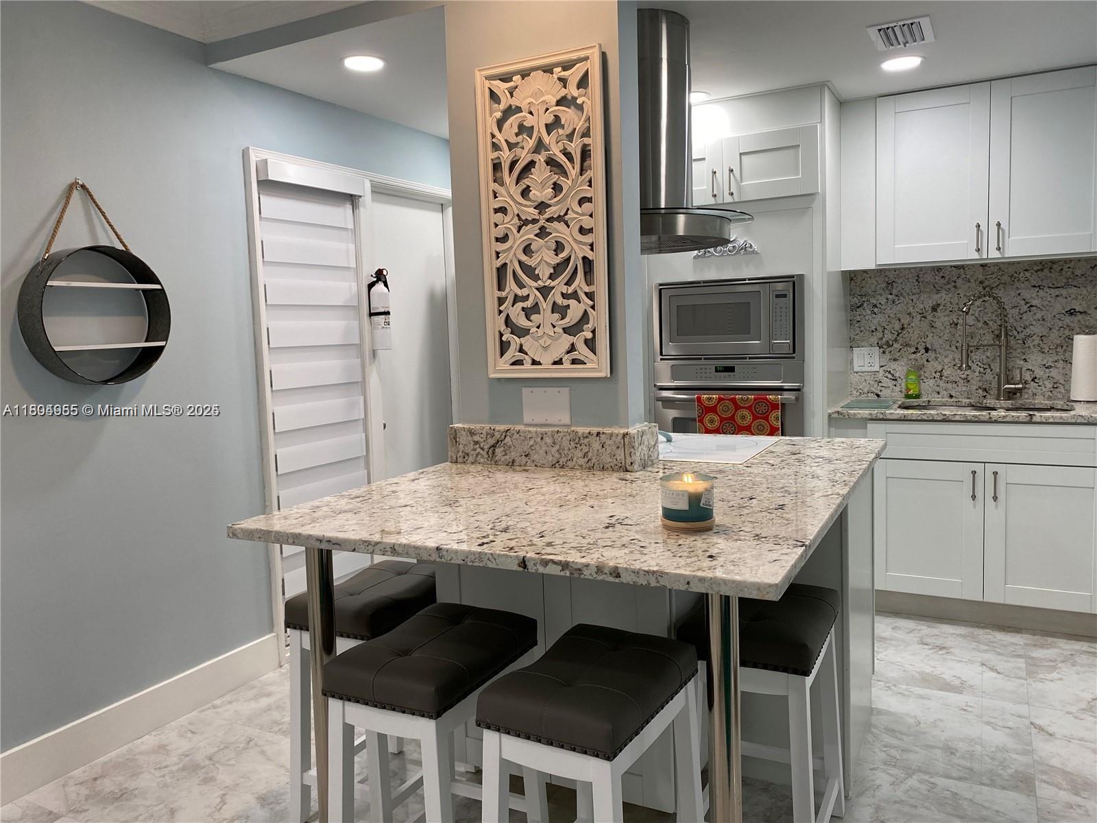 Luxurious Beach Getaway... Fully furnished & remodeled, this unit evokes a sense of COZY-RELAXATION. Walking in, the floor plan opens to the living and kitchen area with modern and upscale dcor and furnishings + 2 TV's. Kitchen is outfitted with SS appliances, granite counter-tops, shaker style cabinets, and stocked with dishware, silverware, cookware.... Porcelain floors flow throughout the flat in all rooms. Heated pool. Take a short walk to the beach; public access near. Also, a short walk to local dining, shopping and parks. The unit includes 1 assigned parking space, guest parking and laundry facility within the building. --NO BALCONY in UNIT-- SHORT TERM (ADD $200/month + tax): Includes water, trash, electric, wifi. LONG TERM: Includes water, trash
