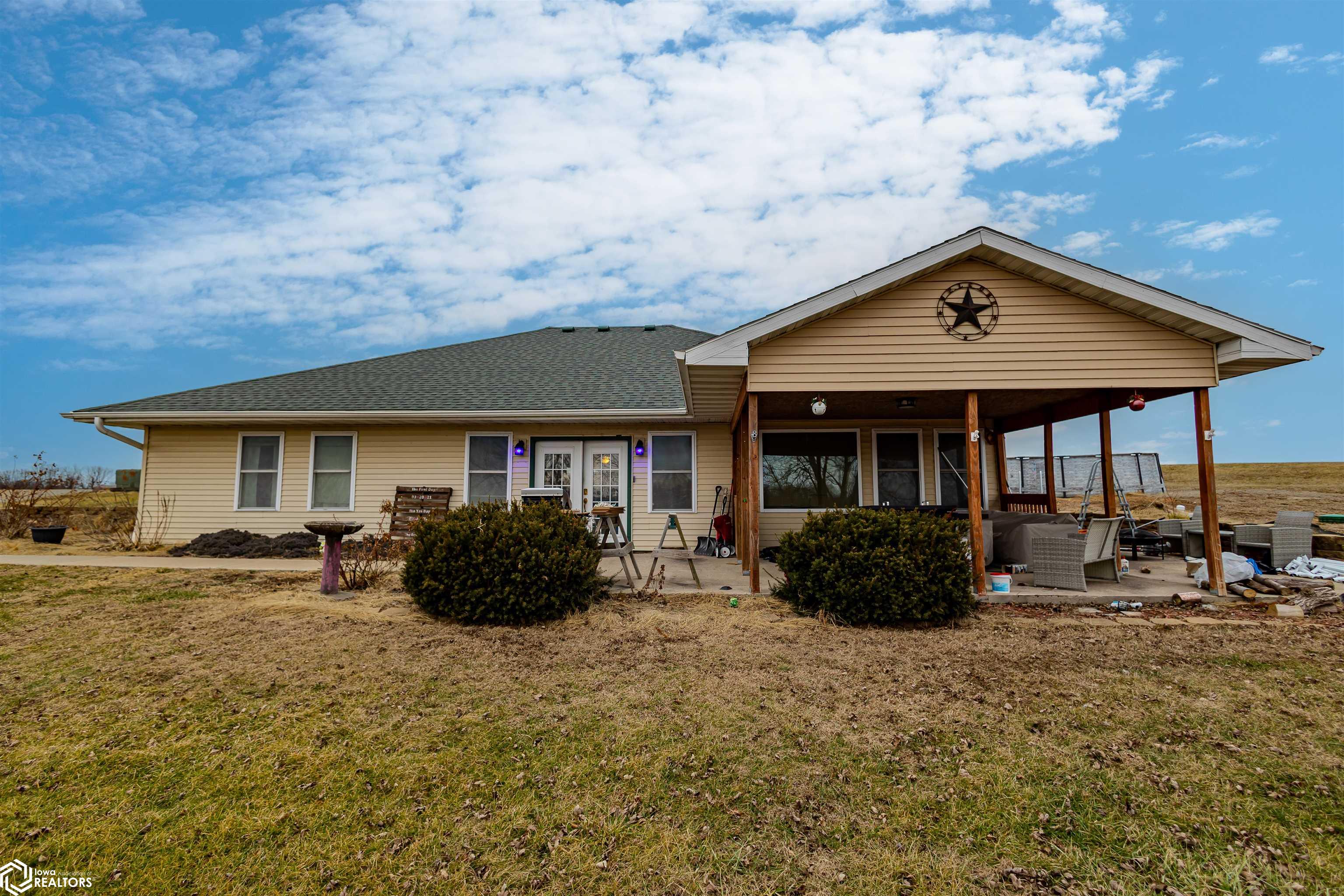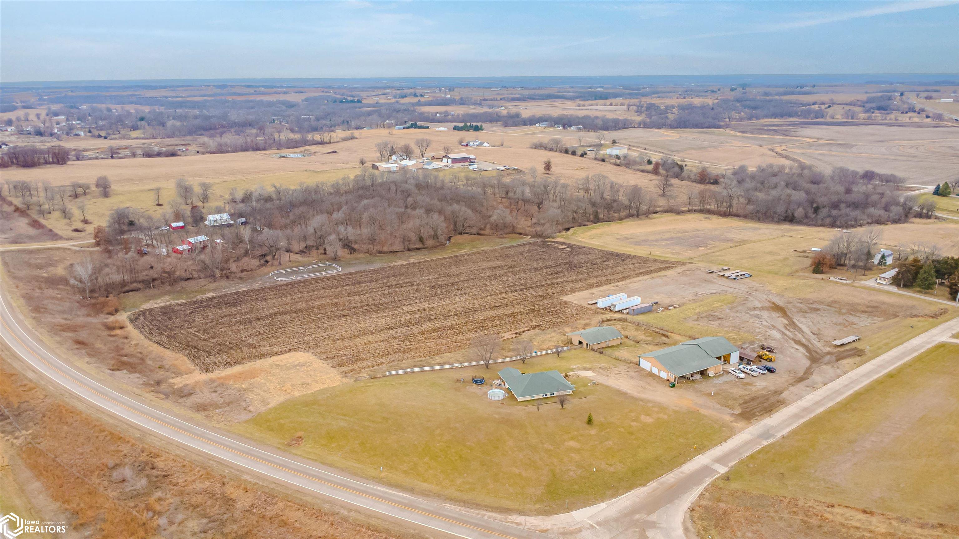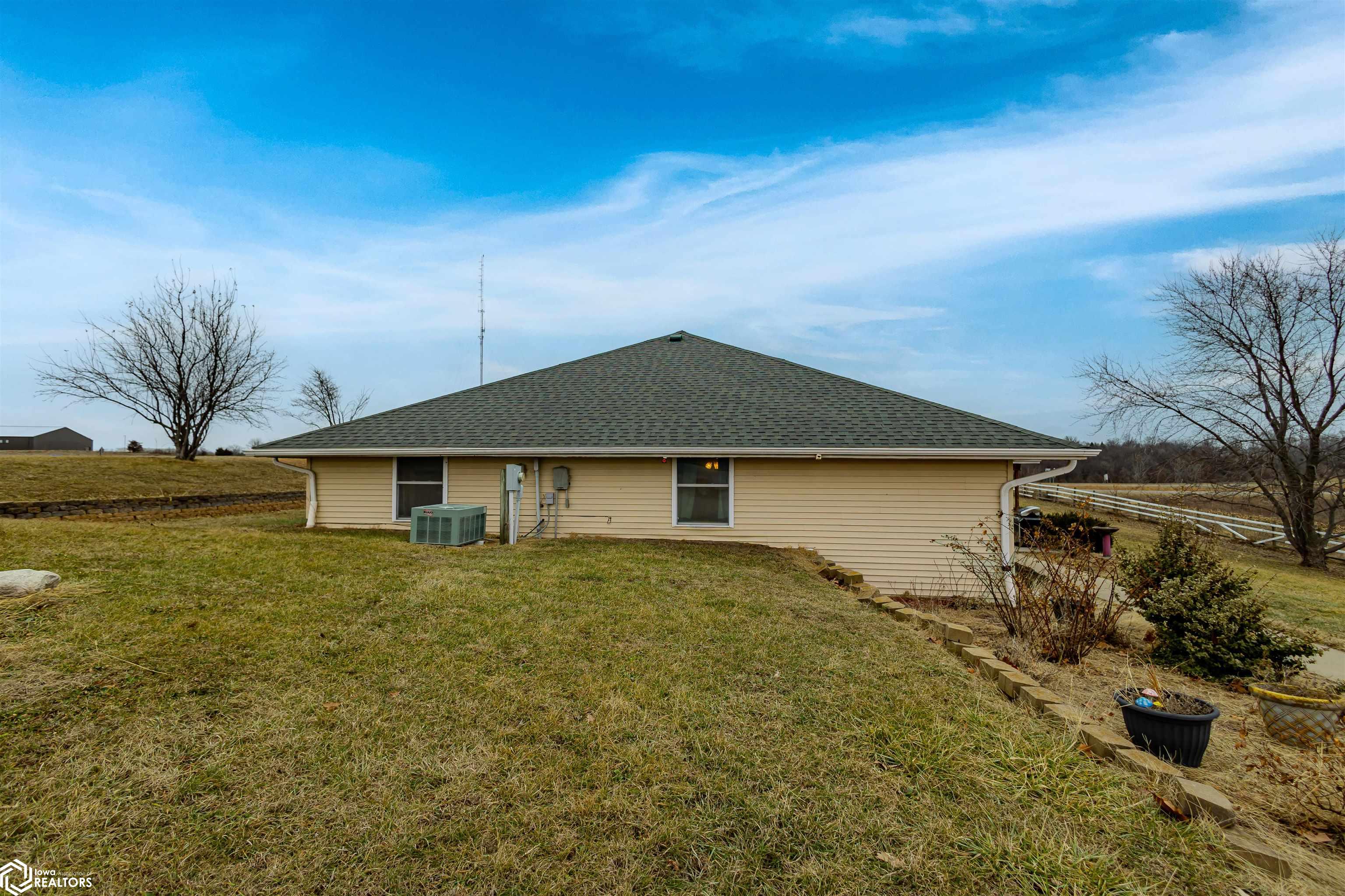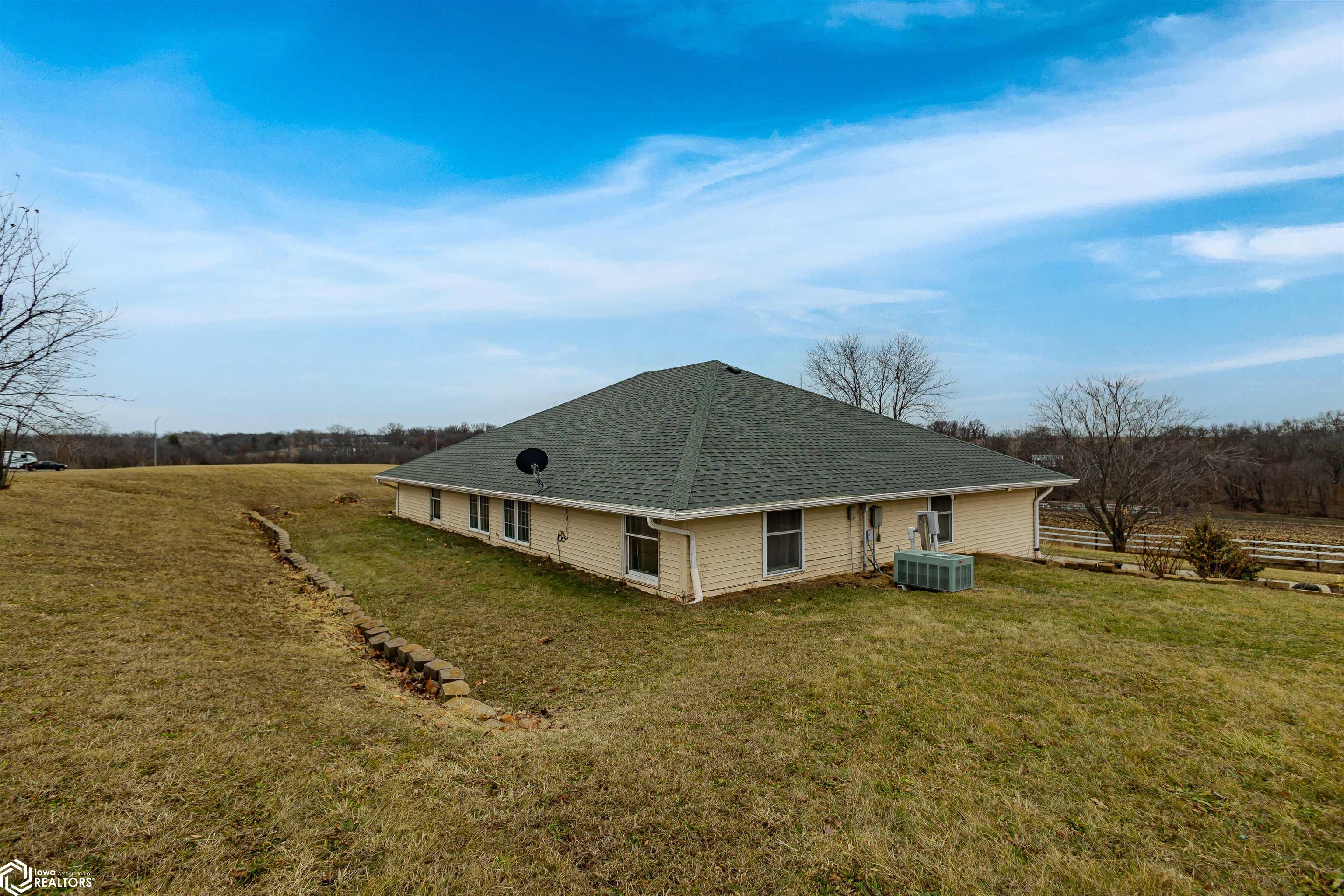 Open and spacious berm style home on 10.68 acres located on the edge of Oskaloosa city limits. Built in 2002, this home offers just under 2,400 sq ft with 4 bedrooms and 2 full baths. The ranch layout allows for abundant natural light through large north-facing windows. A spacious entry leads into the open-concept kitchen, dining, and living area. The primary suite features a walk-in closet and a full bath with a tile soaking tub. Three additional bedrooms plus an office (or potential 5th bedroom) provide flexible living options. Main-floor laundry is located off the kitchen. Updates include LVP flooring (2020) and a new roof (2015). Exterior features include a large machine shed built in 2012 with cement floors, electric, office space, and heated sections, plus a 30x50 insulated horse barn with 4 stalls, wash area, tack room, hay storage, and cement floors. A rare acreage close to towndont miss this one!