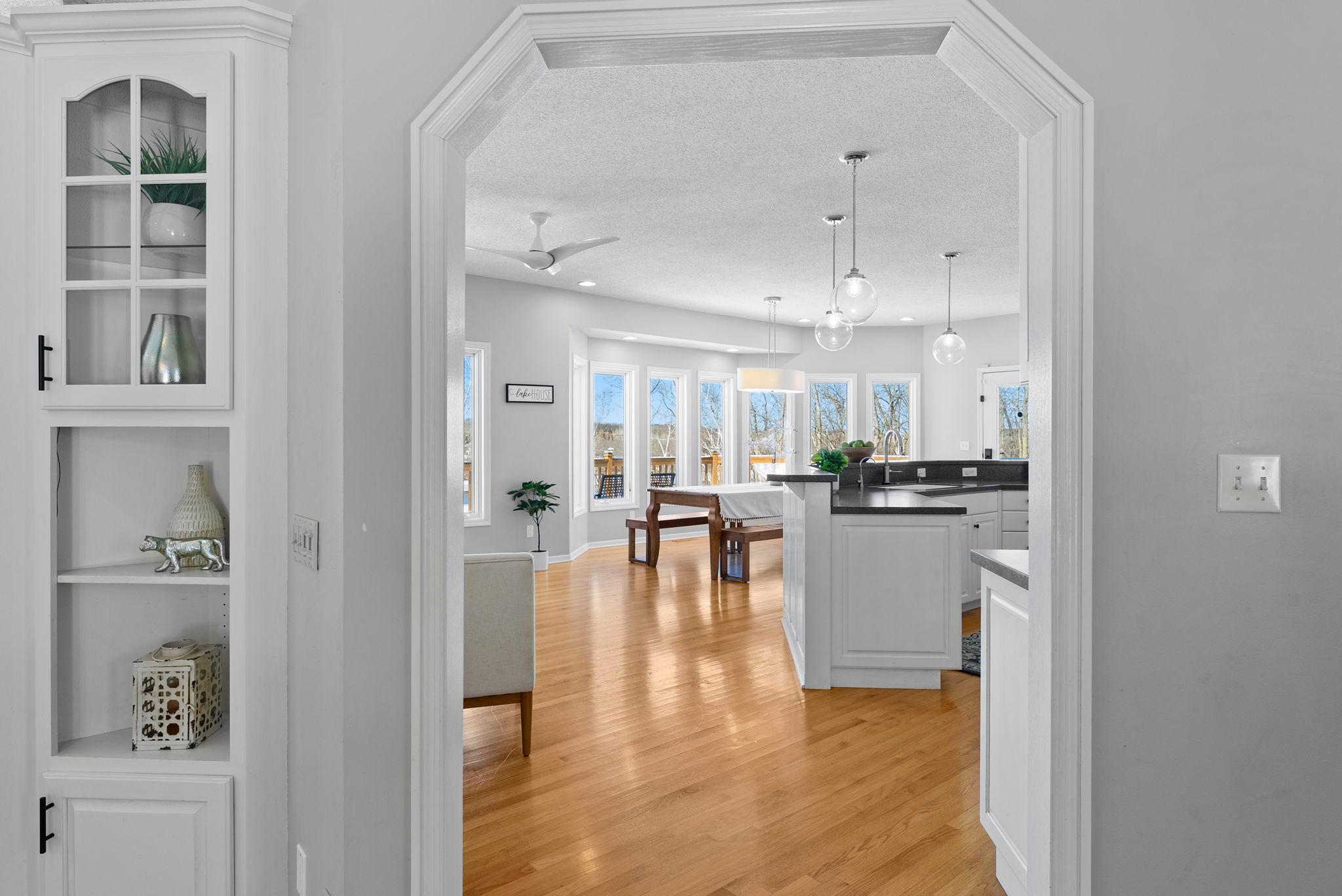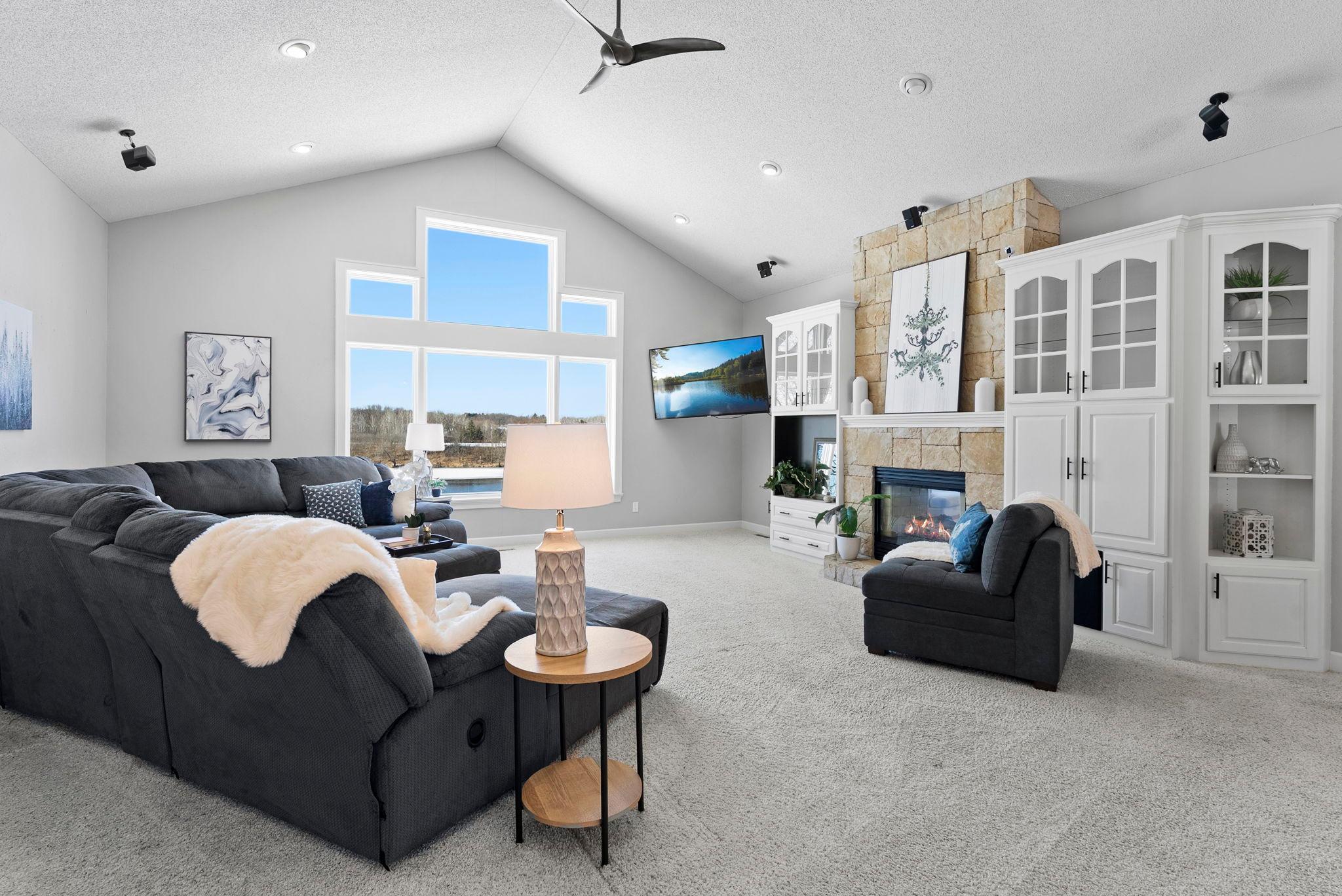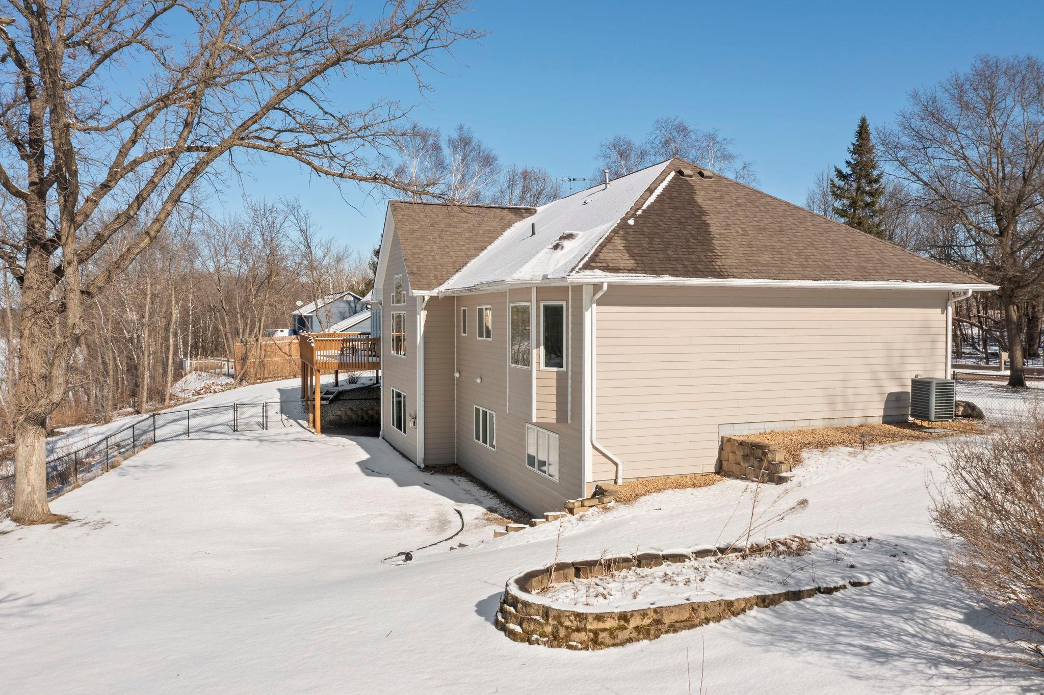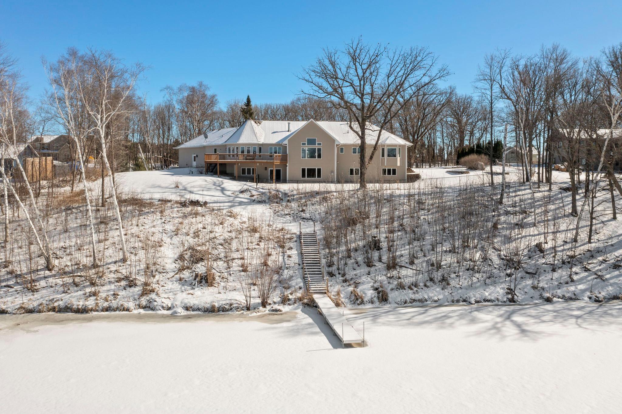 Gorgeous lake home with breathtaking panoramic views! Situated in a peaceful setting on a beautiful treed lot with over 190 feet of private lakeshore. Comfortable, yet elegant layout lives large with amazing spaces and stunning views throughout. Enjoy the welcoming formal living room with floor to ceiling windows and fabulous architectural details. Bright and open chefs kitchen showcases a large center island with breakfast bar, a walk-in pantry, and a cozy sitting area; with a bayed dining space that nicely opens to a deck overlooking the lake perfect for your morning coffee or barbecues! An exquisite study behind pocket doors boasts gorgeous woodworking with a coffered ceiling and custom built-ins. Three bedrooms are conveniently positioned on the main level including a wonderful owners suite with large walk-in closet and relaxing jetted tub. Walkout lower level is an entertainers dream featuring a huge gathering space with built-in media center, a fireplace, and a spectacular wet bar; with two additional bedrooms and a full bath that are perfect for visiting family and friends. Main level mudroom and laundry room are nicely placed just off the attached three-car garage, which is heated and offers ample space for vehicles, toys and tools. Fenced-in yard is perfect for backyard fun, and the in-ground sprinkler provides for easy lawn maintenance. Located on beautiful Fish Lake offering endless recreation with spectacular fishing, swimming and boating surrounded by tranquil wildlife!
