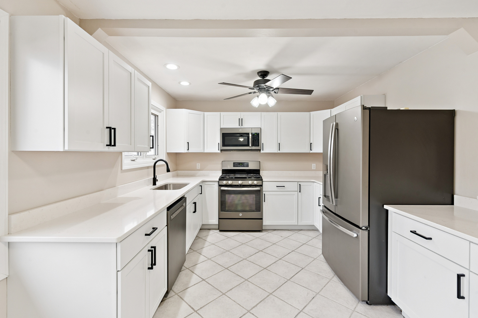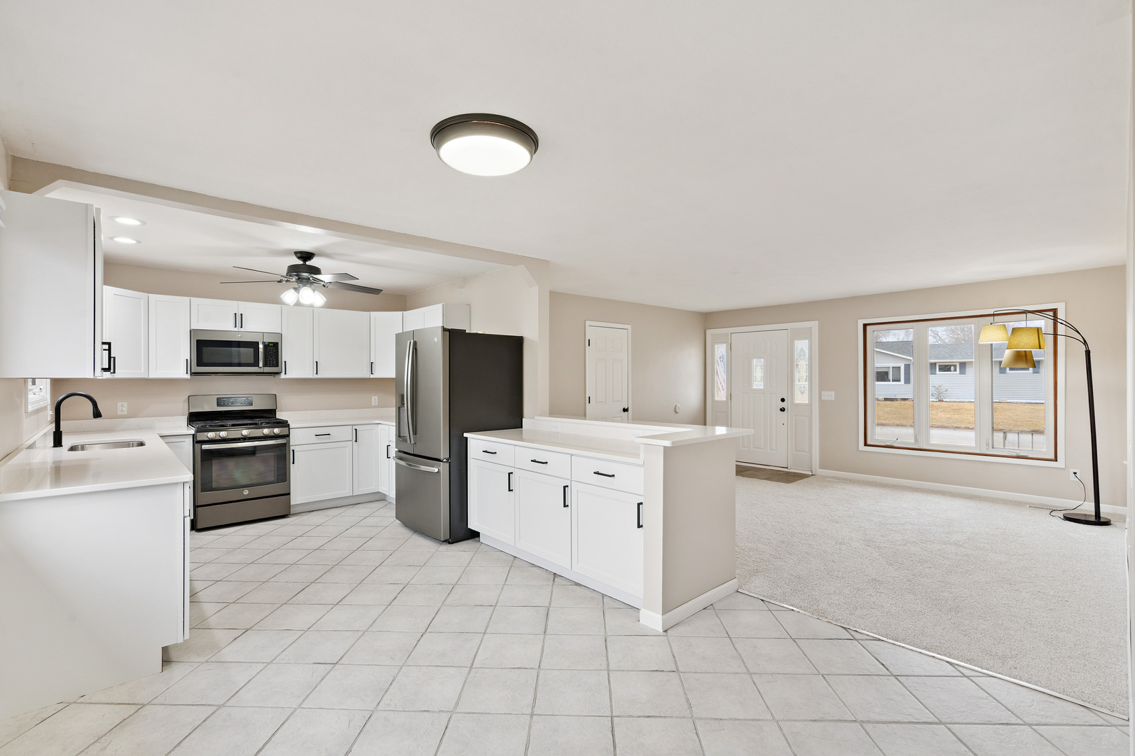 Recently refreshed ranch on a quarter acre corner lot in Park View, IA. Offering 3 bedrooms, 3.5 bathrooms, plus a non-conforming bedroom suite downstairs. The main level shines with fresh paint and brand new carpeting throughout, plus a beautifully remodeled kitchen with quartz countertops, white cabinetry, and black stainless appliances. The primary bedroom includes a private full bath. Downstairs offers over 1,000 finished sq ft with a spacious rec room, recessed lighting, stylish bar area, office, storage space, and a non-conforming bedroom suite with walk-in closet and a full bath, ideal for guests or growing families. Off the rec room is another half bath. All mechanicals replaced within the last 7 years including a water softener and a nearly new washer & dryer set. Outside, you can unwind in the fenced backyard or enjoy morning coffee and evening conversations on the oversized front porch. Just beyond your yard are neighborhood walking trails and pocket parks. Saturdays come alive with the crack of bats and roaring cheers from the nearby youth baseball fields. Located in the North Scott School District with affordable taxes and modest HOA dues. This is the kind of home families grow into and stay for years.