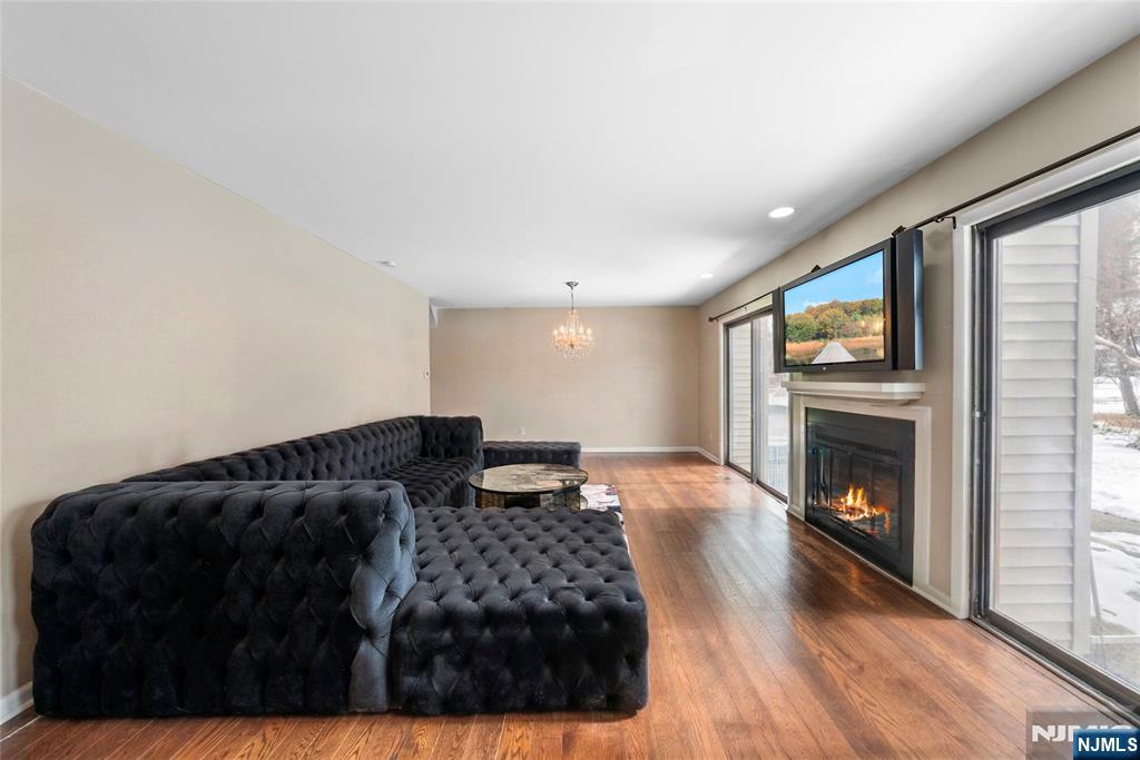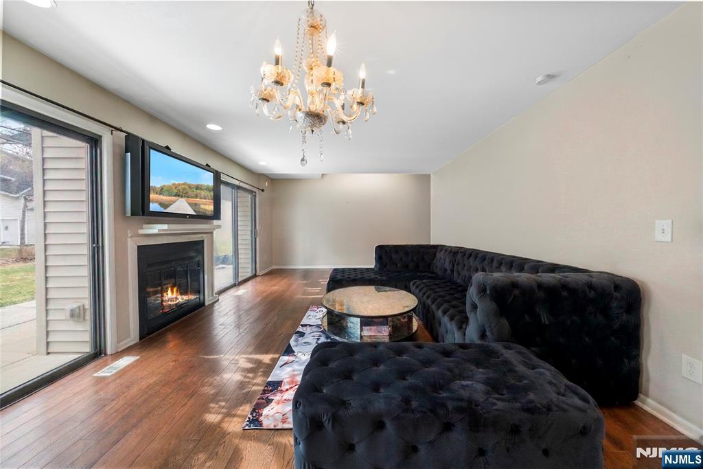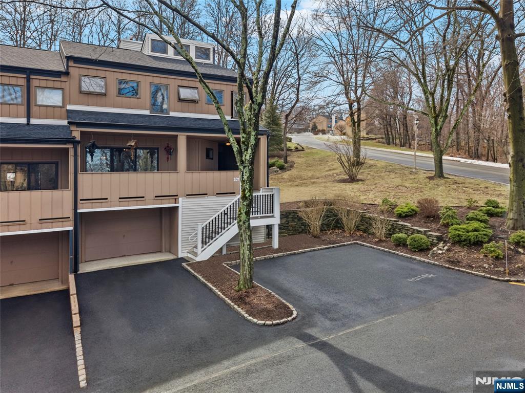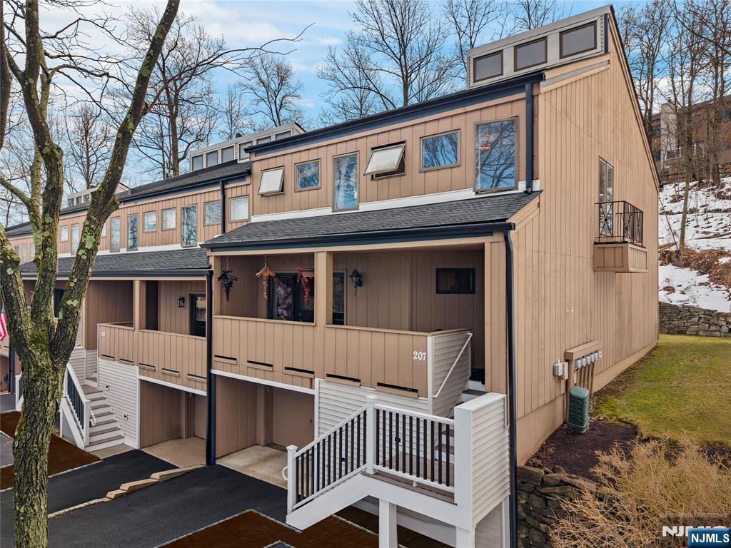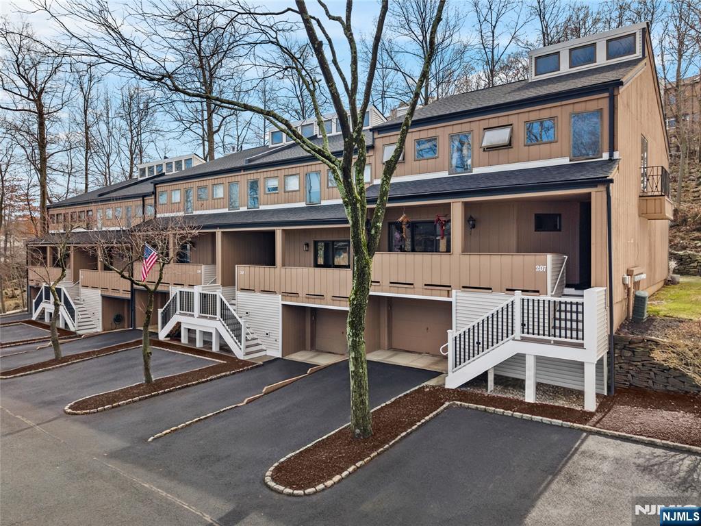 This distinctive corner unit offers approximately 3 bedrooms and 2.5 baths, along with one of the largest private outdoor spaces in the community. The fenced patio features a gazebo, seating areas, and mature plantings ideal for entertaining or unwinding in privacy. Enjoy a front balcony and decorative Juliet balcony, with NYC skyline views on clear days.Inside, a gallery-style entry leads to a formal living room and open kitchen/dining area with a convenient main-level half bath. Upstairs includes a primary suite with en-suite bath, a flexible family room or additional bedroom, and an open loft for storage or creative use. The lower level adds two rooms suited for office, flex, or storage needs.Located in a safe, quiet, and highly desirable neighborhood, close to parks, dining, Willowbrook Mall, and major routes including I-80, Routes 46 & 3, this home delivers privacy, flexibility, and standout outdoor space rarely found in the area.