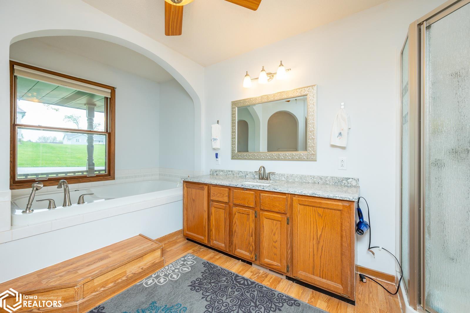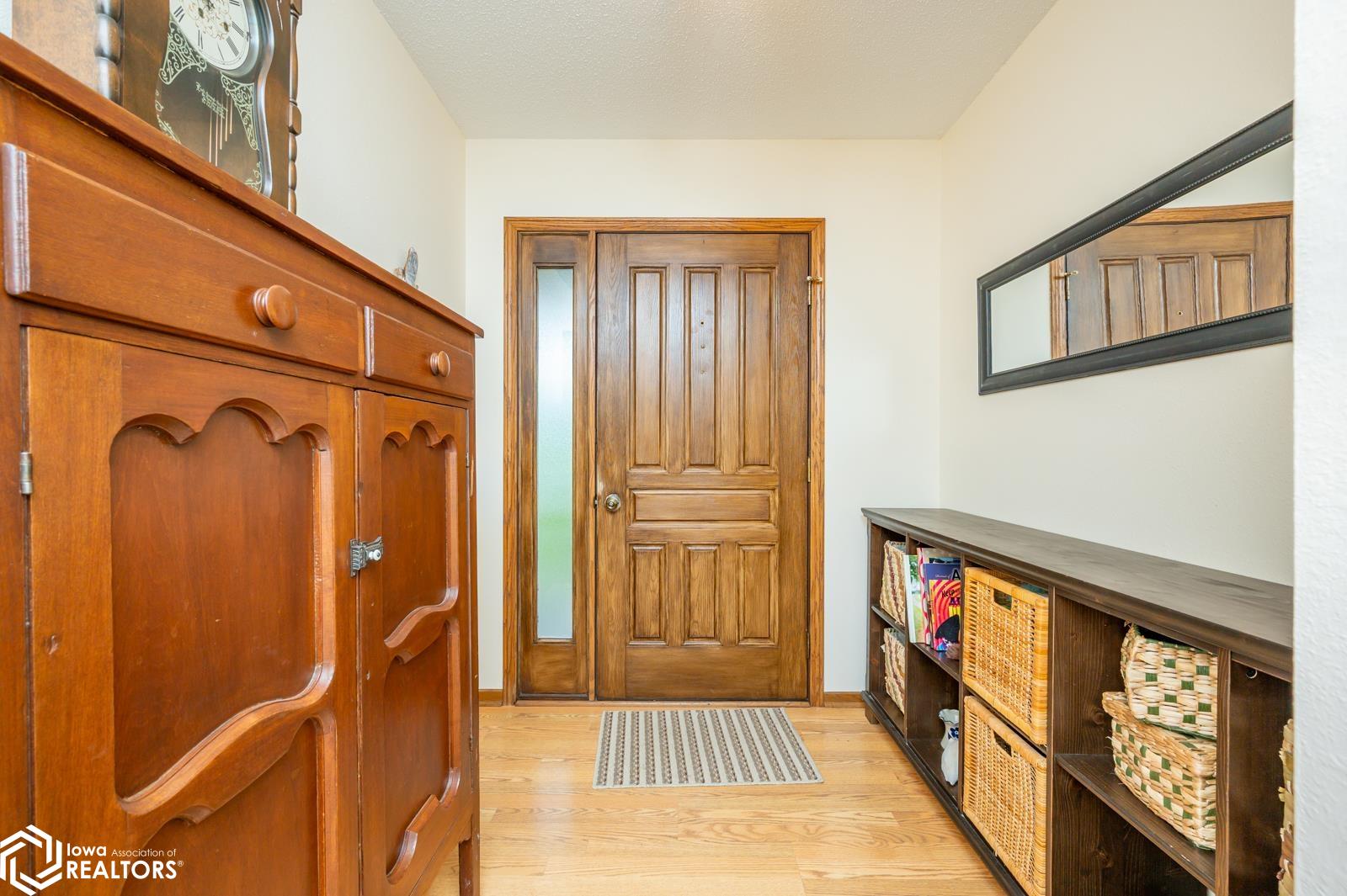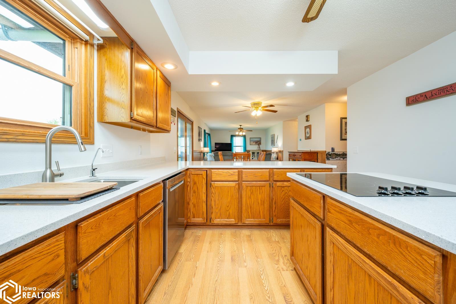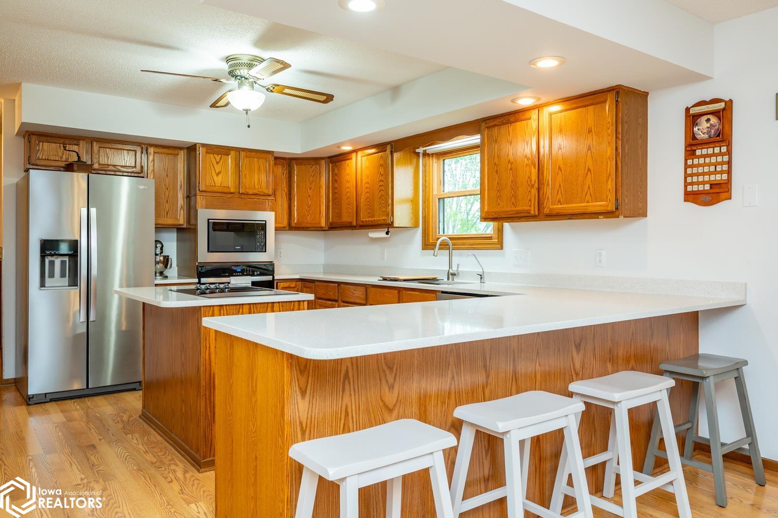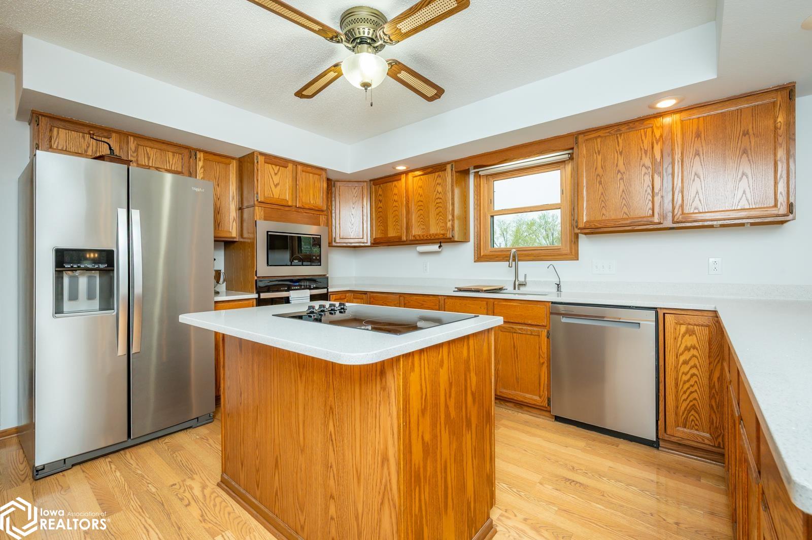 Discover the perfect blend of small town charm and modern updates in this beautifully maintained, move-in ready, 3 bedroom, 2 bath walkout brick ranch in Lacona, IA. Step inside to an inviting open concept layout that seamlessly connects the kitchen, dining area, and living room- ideal for hosting family and friends. The updated kitchen is a true highlight, featuring elegant quartzite countertops, a center island, new appliances, and extra storage with two pantries conveniently located in the mudroom, with 3 bedrooms, an updated full bath with a relaxing jacuzzi tub and shower all on the main floor. Enjoy outdoor living on two newly updated decks, front and back, offering peaceful spaces to unwind and take in the spacious 0.70 acre (3 city lots) in town yard. The backyard is a serene retreat with multiple fruit trees (Cherry, apple, peach and apricot), a garden spot, fire pit, and a quaint bridge crossing a small creek. The finished walkout lower level adds valuable living space, complete with a kitchenette, and updated 3/4 bath, a non-conforming 4th bedroom, and a cozy wood-burning fireplace- perfect for fall/winter evenings. Step right out to a large covered patio, ideal for entertaining or enjoying a quiet cup of coffee. Additional upgrades include a newer on-demand hot water heater, a radon mitigation system, and a reverse osmosis water filtration system. The home has been pre-inspected, offering peace of mind to the next owners.