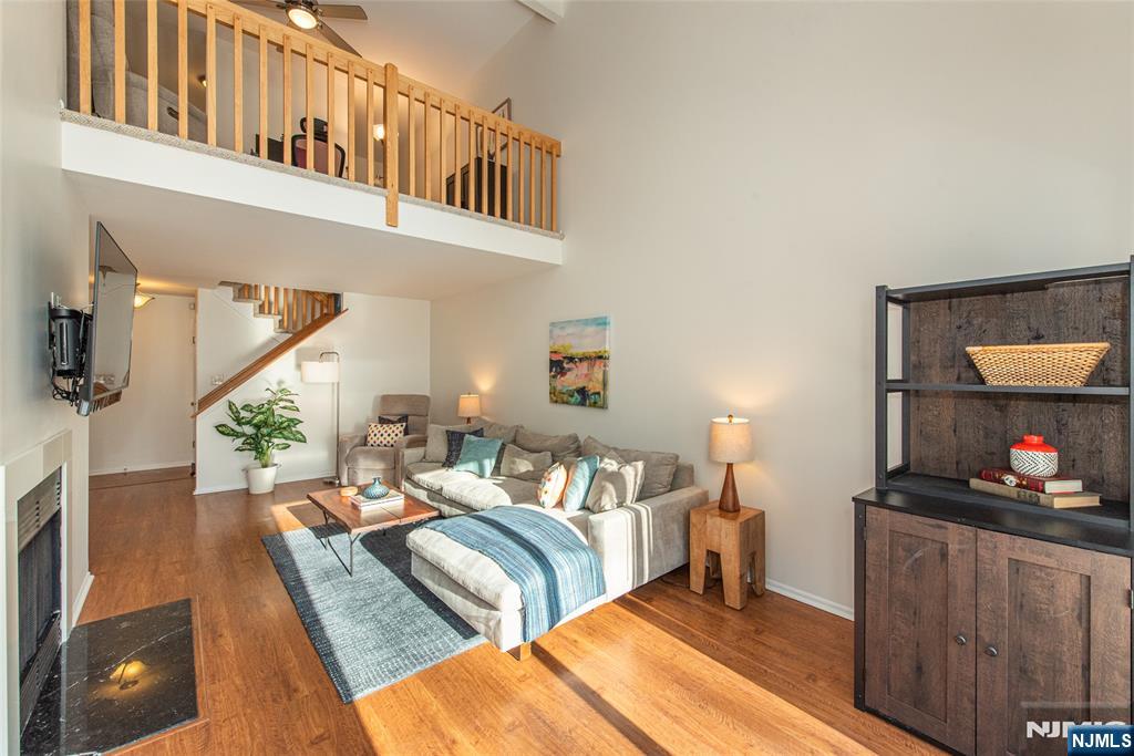 This freshly painted sun-drenched Muirfield model end unit features rare sought after convenient 1st flr en-suite primary w/tub/stall shower/walk-in closet, living room w/cozy wood-burning fireplace, spacious eat-in kitchen (granite counter/stainless appliances/plentiful cabinetry/nook w/sliders out & built-in gas line for alfresco grilling), powder room & vaulted ceiling in the elegant dining room. Upstairs boasts high ceilings in bed 2 (currently office), while top floor charms w/bed 3, generous full bath & bright loft den overlooking room below. Unit also highlights elegant wood floors, new skylights (w/solar shades), 1 car attached garage w/private driveway, new HVAC/central air, storage galore, 3 new decks, new siding/gutters/windows/sliders/garage door/insulation, unfinished dry full height expansive basement (ideal for gym/play room/den/office), guest parking/clubhouse/pool/tennis courts/playground! Near jitney to NYC train/shops/houses of worship/schools/parks/restaurants.