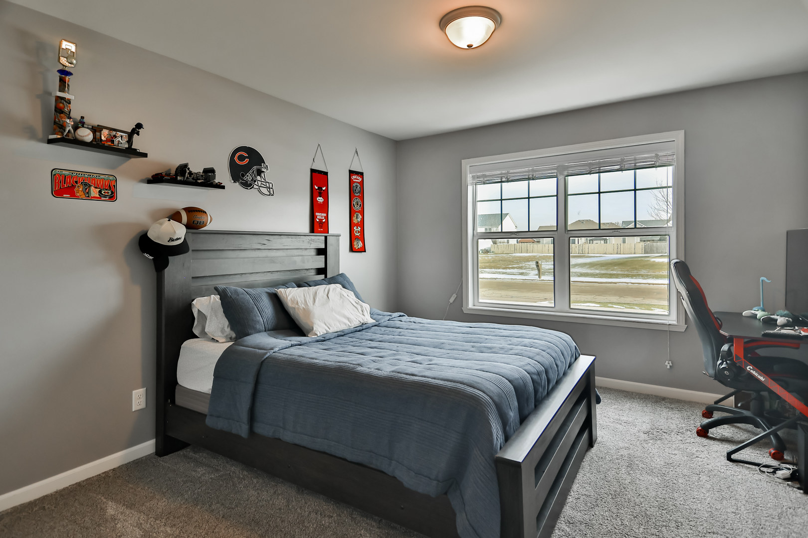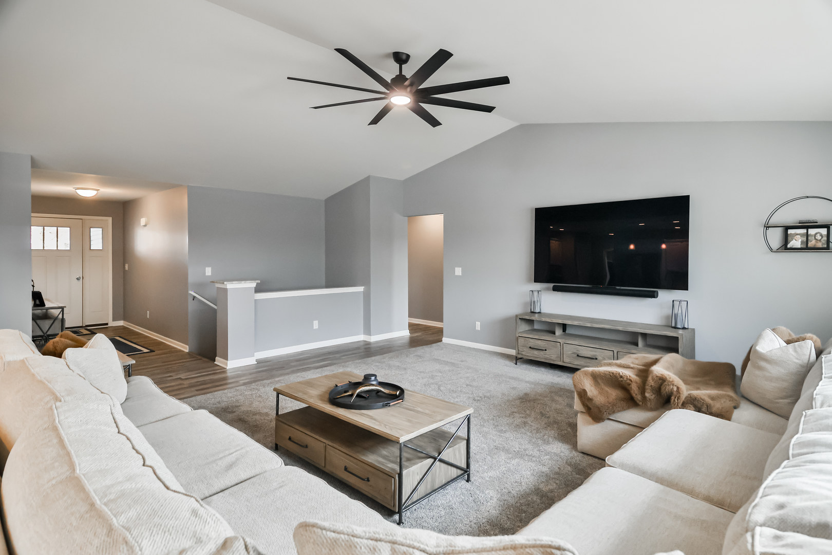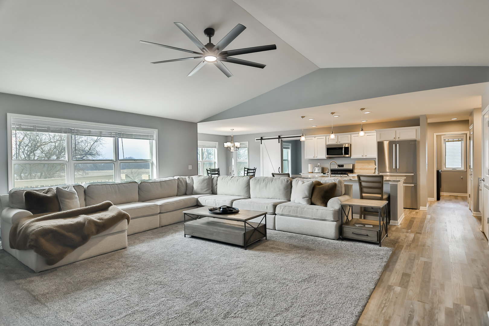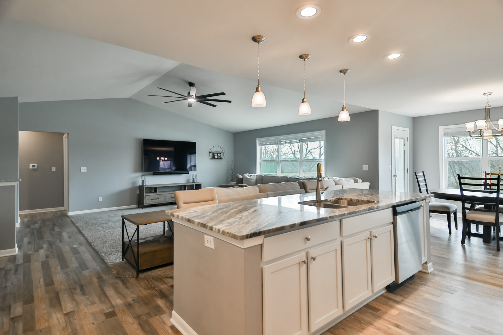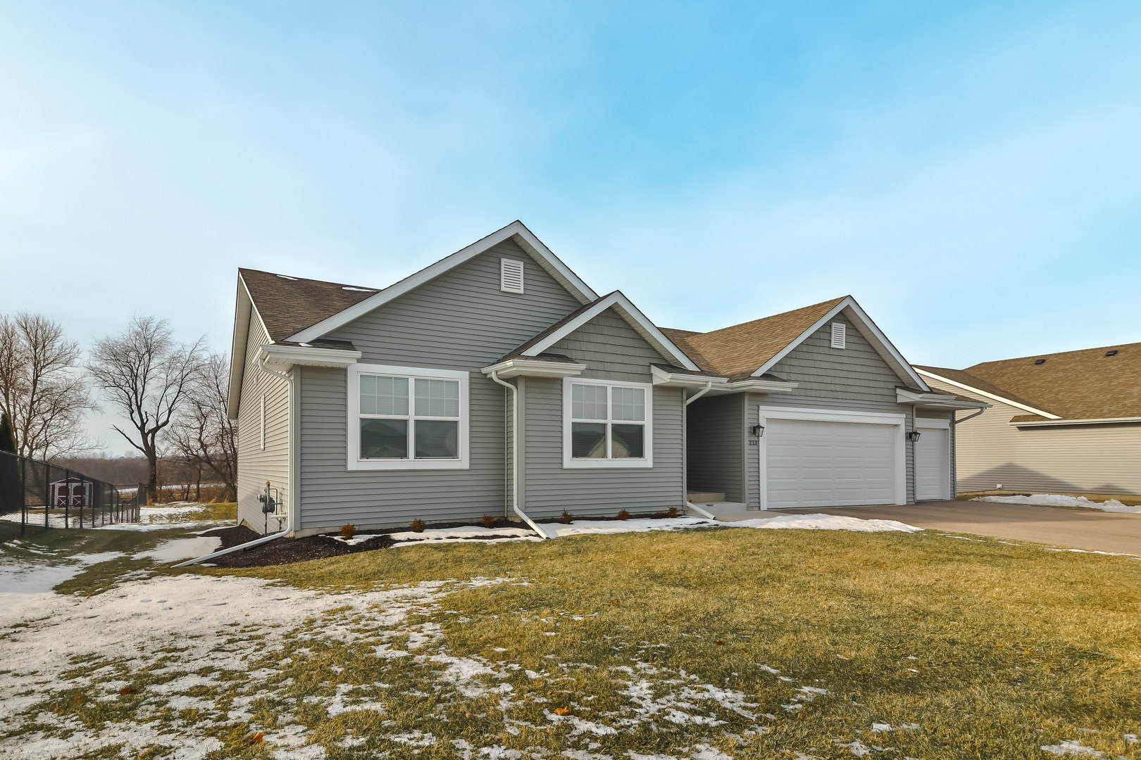 Welcome to this beautifully designed ranch-style home where comfort meets contemporary living. The open concept great room features impressive cathedral ceilings that flood the space with natural light and create an inviting atmosphere for everyday life and entertaining. The heart of this home is the spacious eat-in kitchen, complete with a generous island featuring a breakfast bar, ample pantry storage, and gleaming stainless steel appliances. A dedicated office with an adjacent half bath provides the ideal work-from-home setup. The primary bedroom serves as a true retreat, offering double closets, open shelving, and a private bath. Thoughtful details include main floor laundry and a convenient drop zone at the garage entrance. Step outside to discover your private backyard that backs up to a large farm. Additional highlights include a three-car garage, deck, and full unfinished basement waiting for your vision.