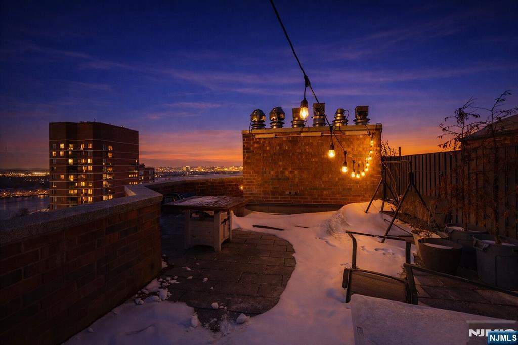 Stunning High-End Penthouse Condo with Private Rooftop Terrace and another terrace off dining room. Experience luxury living in this fully renovated 3 br (or 2-bedroom + den), 2-bathroom simplex spanning 1,508 sq. ft. Perched atop an exclusive property with only two units on the floor, this home offers unmatched privacy and a breathtaking rooftop terrace with panoramic views of partial NYC, American Dream and the Hackensack River. Inside, you'll find a beautifully designed space featuring gleaming hardwood floors throughout, a spacious living and dining area and a top-of-the-line kitchen. The denperfect as a home office, library, or third bedroomboasts custom built-in bookshelves. The primary suite features a California closet, radiant heated floors, and a spa-like bathroom with a Jacuzzi tub. Step outside to your private rooftop retreatideal for lounging, sunbathing, gardening, or hosting BBQs while enjoying spectacular skyline views. This full-service building offers 24/7 doorman, gym, Sauna, community room, playground, tennis court, swimming pool, and effortless NYC commuting with a bus and shuttle to the train station right at your doorstep.