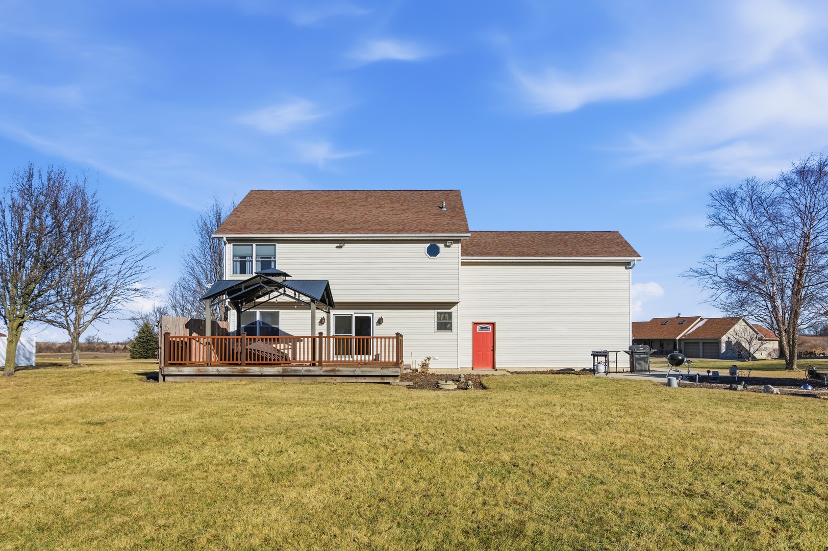 Welcome to 2216 N 2929th Rd, a beautifully maintained 4-bedroom, 2.5-bath home situated on a 0.91 acre lot with room to live, work, and entertain. This property offers the perfect blend of country living, modern features, and functional space, just minutes from town. The main level features a welcoming layout with a formal dining room, living room with built-ins, a cozy family room, and a well-appointed kitchen with granite countertops, newer appliances, and ample cabinetry. A convenient powder room completes the first floor, ideal for guests and everyday living. Upstairs, you'll find three spacious bedrooms, a full hallway bathroom, and a private primary suite featuring a walk-in closet and a full en-suite bath with double vanity, jetted tub, and separate shower. A versatile bonus room above the garage offers endless possibilities, think home office or playroom. The partially finished basement provides extra living or recreational space, perfect for a home gym, media room, or storage. Outside enjoy the expansive outdoor amenities, including a large backyard, composite deck, gazebo, back patio with fire pit, and a charming covered front porch. A long driveway, 2-car attached garage, and an additional detached garage in the backyard make this property ideal for car enthusiasts, hobbyists, or anyone needing extra storage or workshop space. If you're searching for a home with a yard, multiple garages, outdoor entertaining space, and room to grow, this property checks every box. Water Heater: 2020, Furnace and A/C: 2017, Well Pump: 2021. Also included is a hydrogen peroxide well water system and a water softener system! Schedule your private showing today and experience everything this exceptional home has to offer.