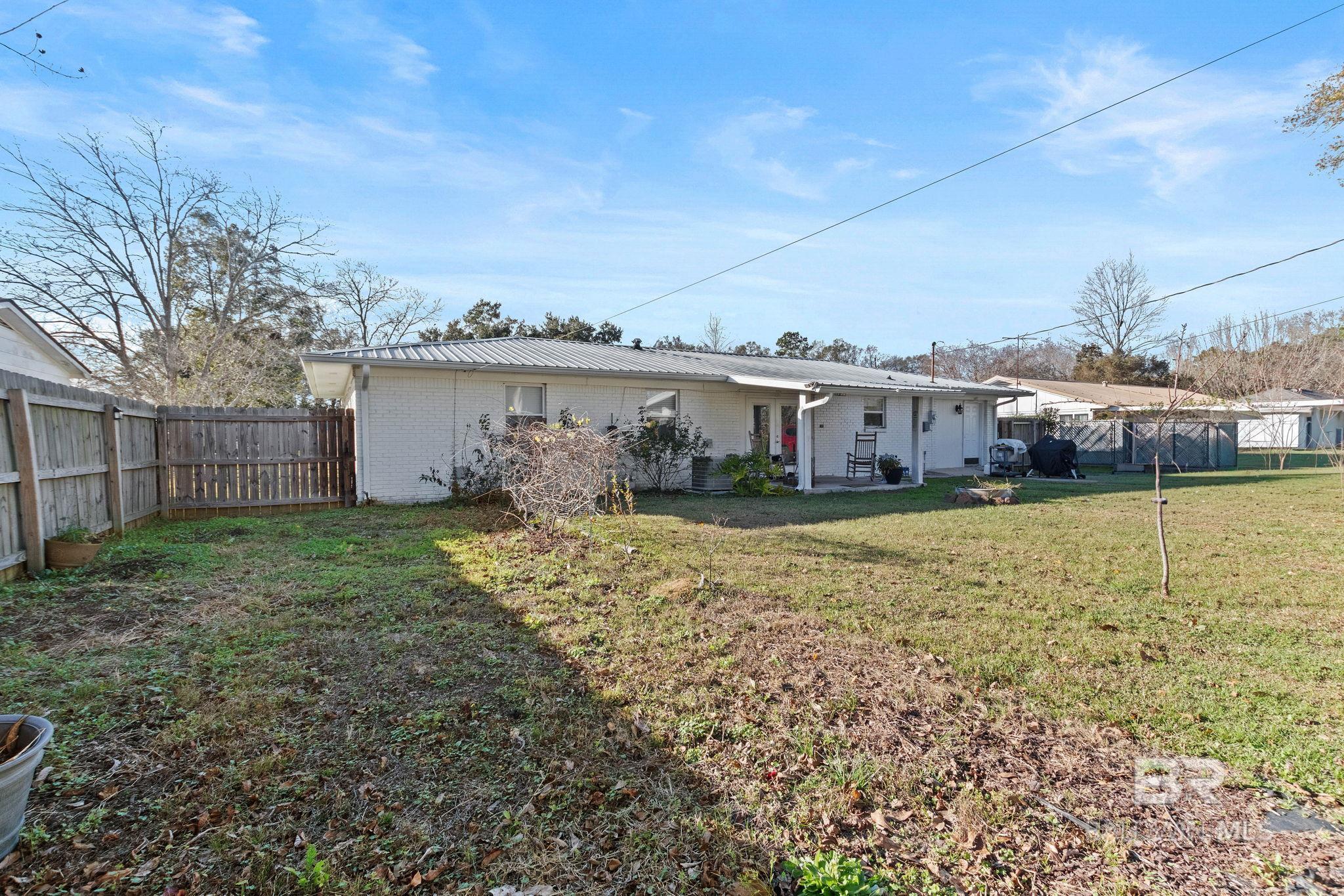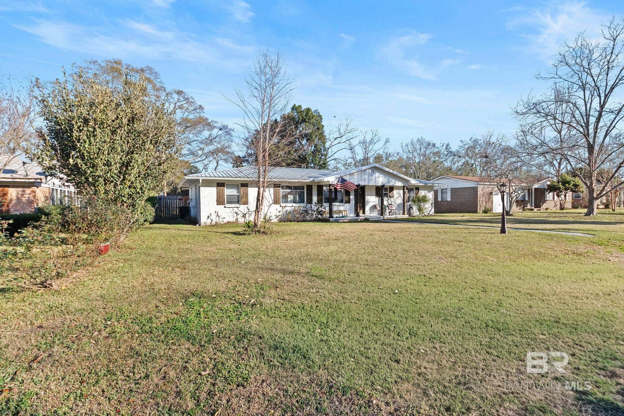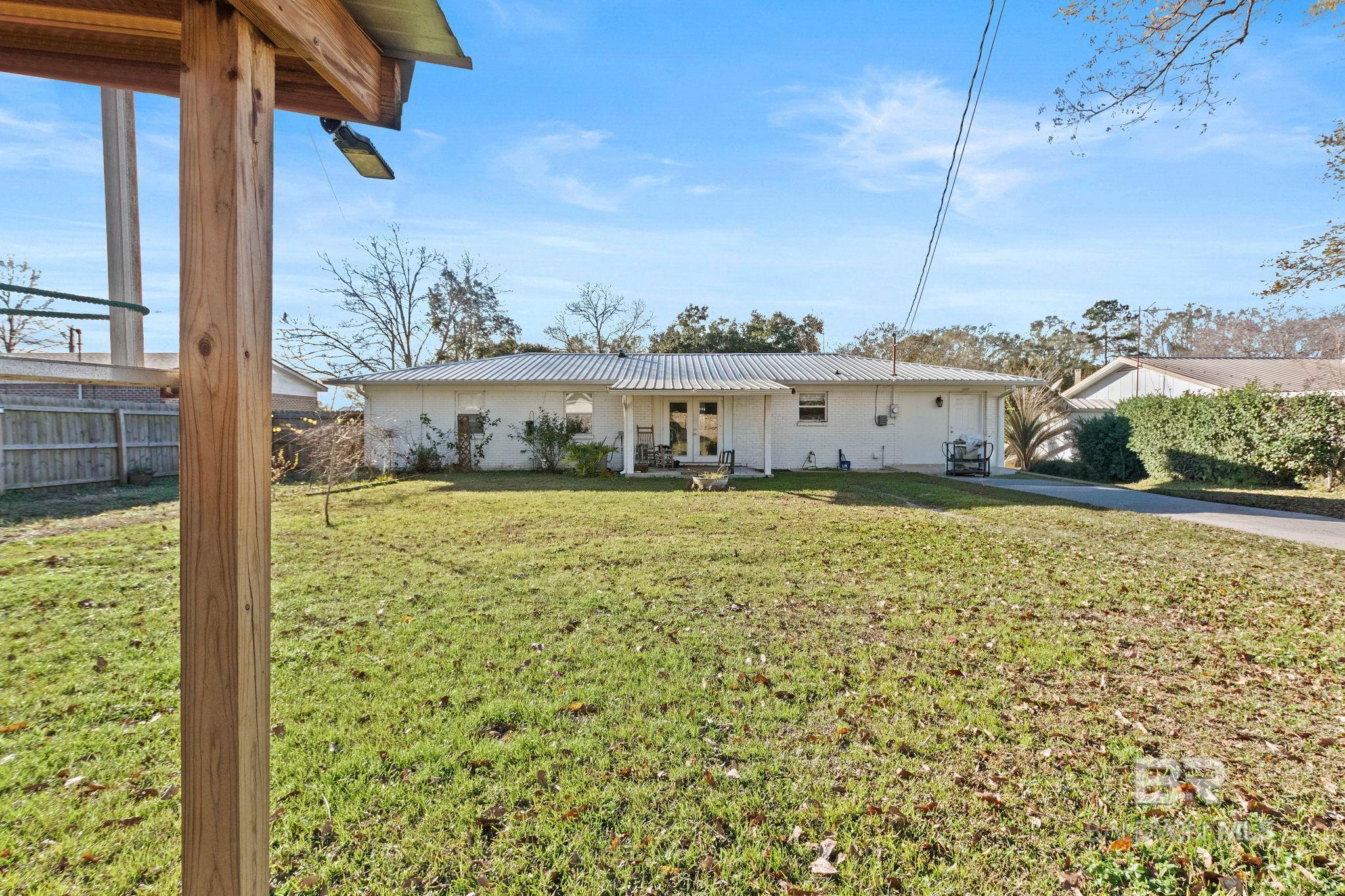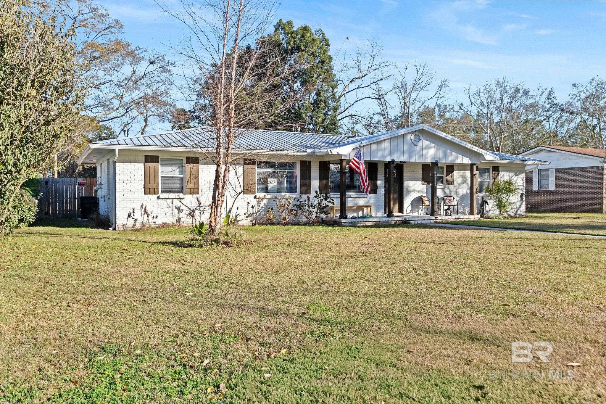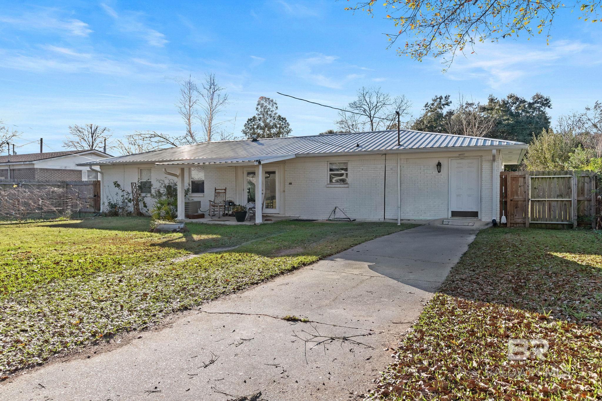 Welcome home to this 3 bed/2 bath Ranch style home, close to the park, town, interstate, and the beautiful, sandy white beaches of South Alabama. Home was remodeled in 2017 to include a new metal roof, new windows, granite countertops and Wood Laminate Flooring. Enter the home to a large open floor plan with 12' x 17' bonus room. Kitchen features black granite countertops, undermount sink, beautiful glass tile back splash, stainless appliances, and breakfast.Bar with plenty of cabinet space. French doors lead from dining area to 10' x 12' covered back porch with beautiful wood ceiling. Master bedroom with walk-in closet, en suite bath with double vanity, and shower/tub combo. Ceiling fans in all bedrooms as well as common areas. Backyard is partially fenced with 8' x 10' storage building. - Small Metal Shed does not convey with sale. Driveway is on BACK side of property. BUYER OR BUYER'S AGENT to verify all measurements as well as any information deemed important. - Home Sold AS IS Buyer to verify all information during due diligence.
