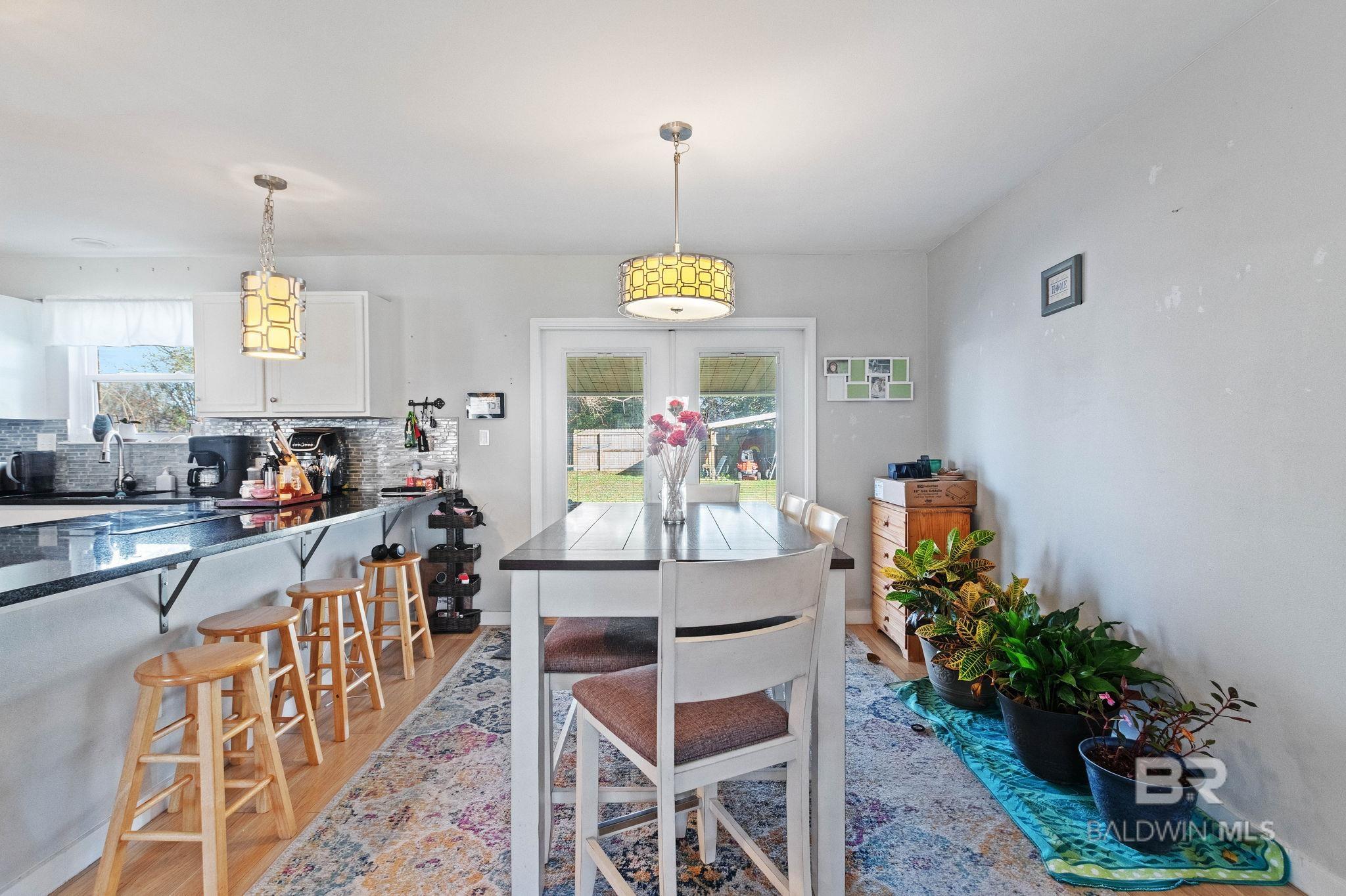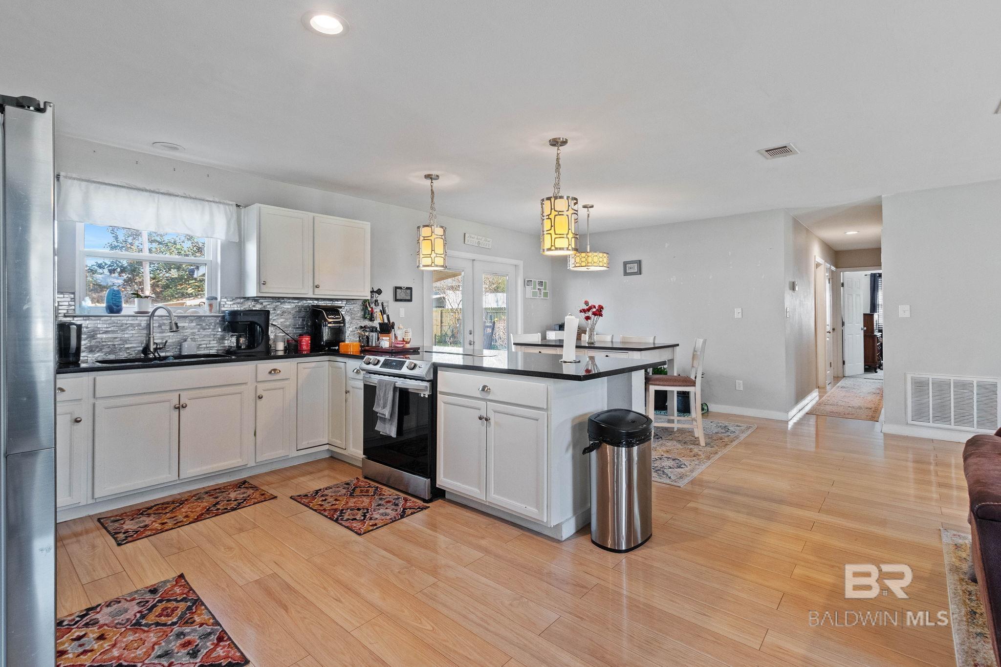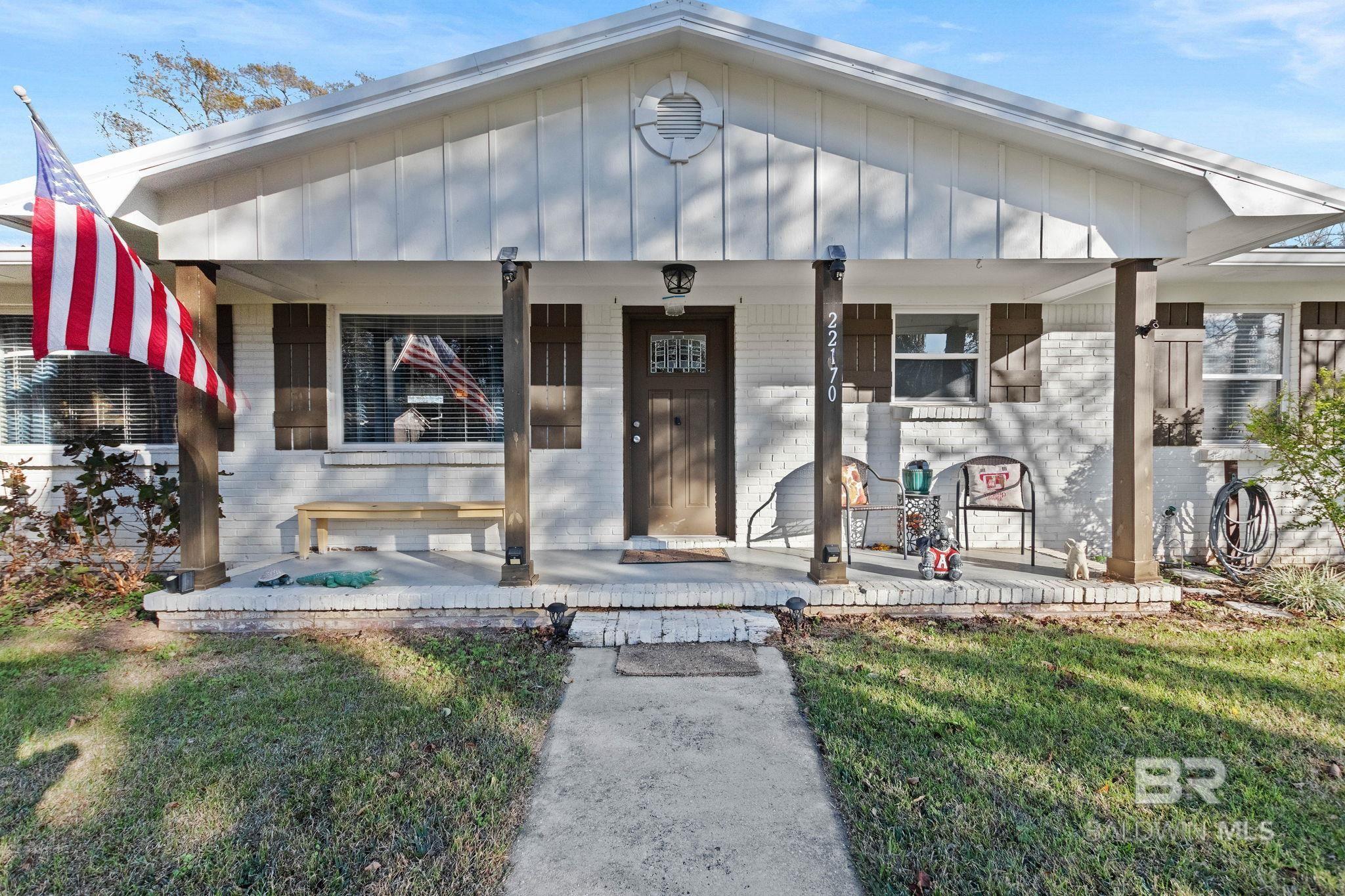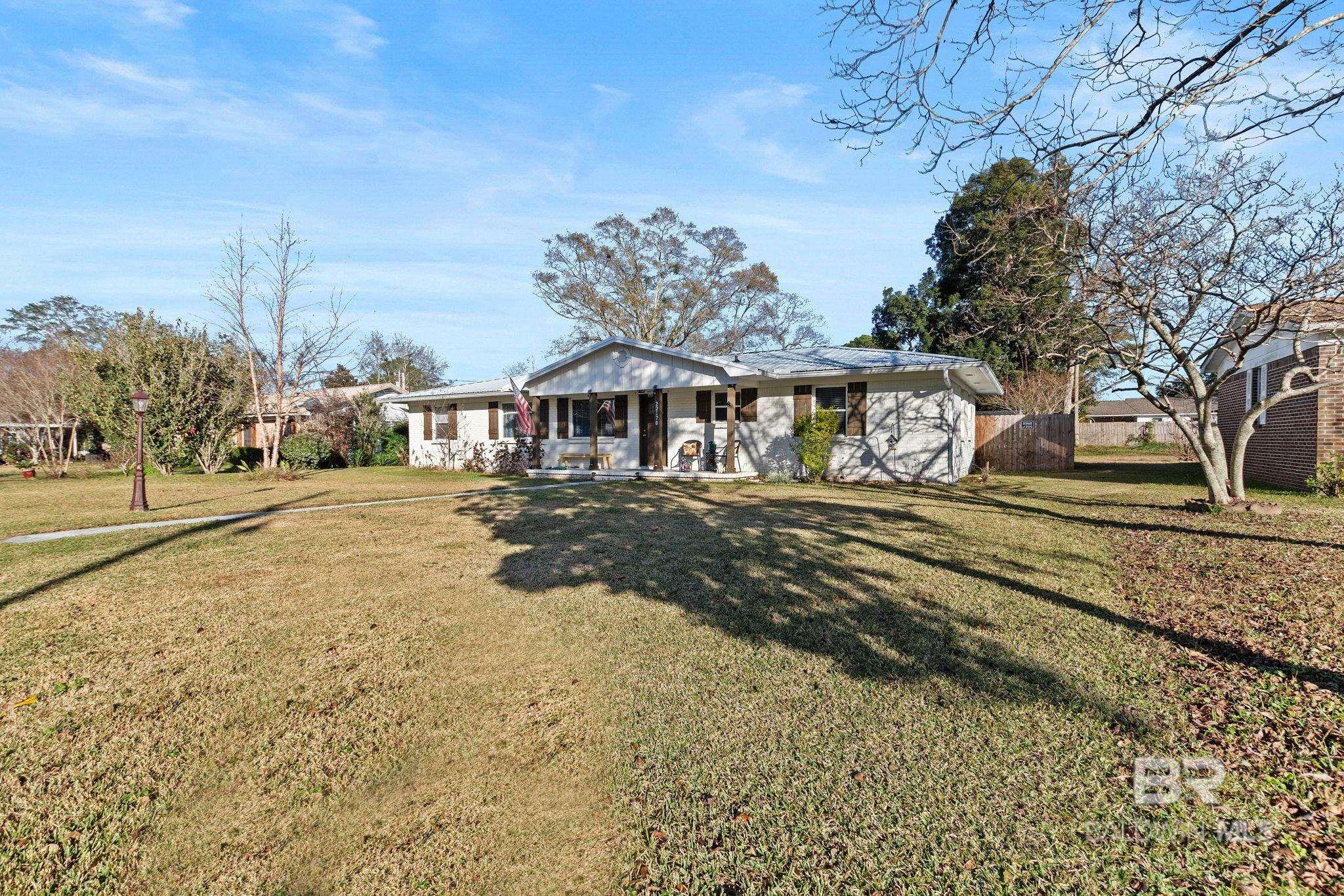 Welcome home to this 3 bed/2 bath Ranch style home, close to the park, town, interstate, and the beautiful, sandy white beaches of South Alabama. Home was remodeled in 2017 to include a new metal roof, new windows, granite countertops and Wood Laminate Flooring. Enter the home to a large open floor plan with 12' x 17' bonus room. Kitchen features black granite countertops, undermount sink, beautiful glass tile back splash, stainless appliances, and breakfast.Bar with plenty of cabinet space. French doors lead from dining area to 10' x 12' covered back porch with beautiful wood ceiling. Master bedroom with walk-in closet, en suite bath with double vanity, and shower/tub combo. Ceiling fans in all bedrooms as well as common areas. Backyard is partially fenced with 8' x 10' storage building. - Small Metal Shed does not convey with sale. Driveway is on BACK side of property. BUYER OR BUYER'S AGENT to verify all measurements as well as any information deemed important. - Home Sold AS IS Buyer to verify all information during due diligence.
