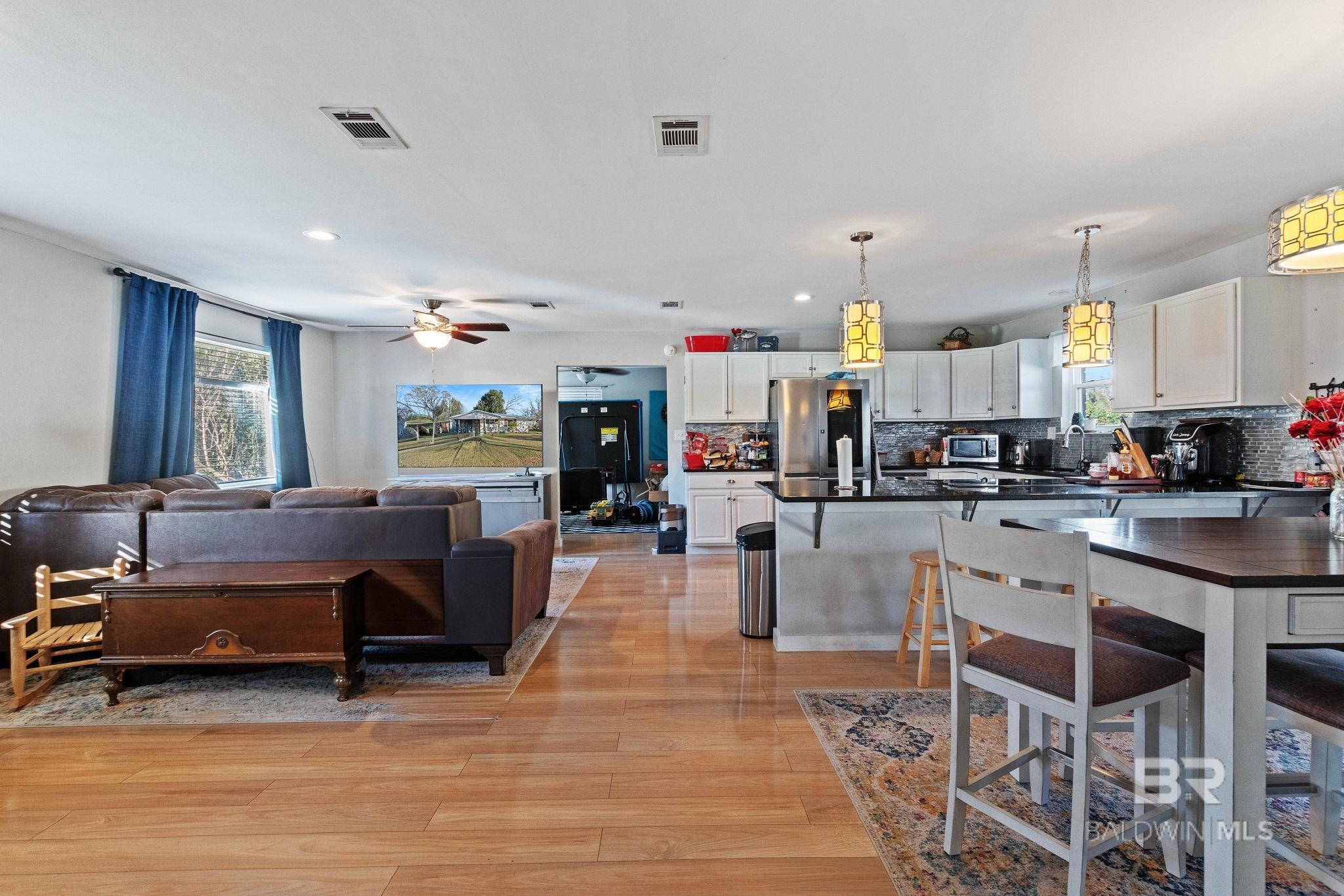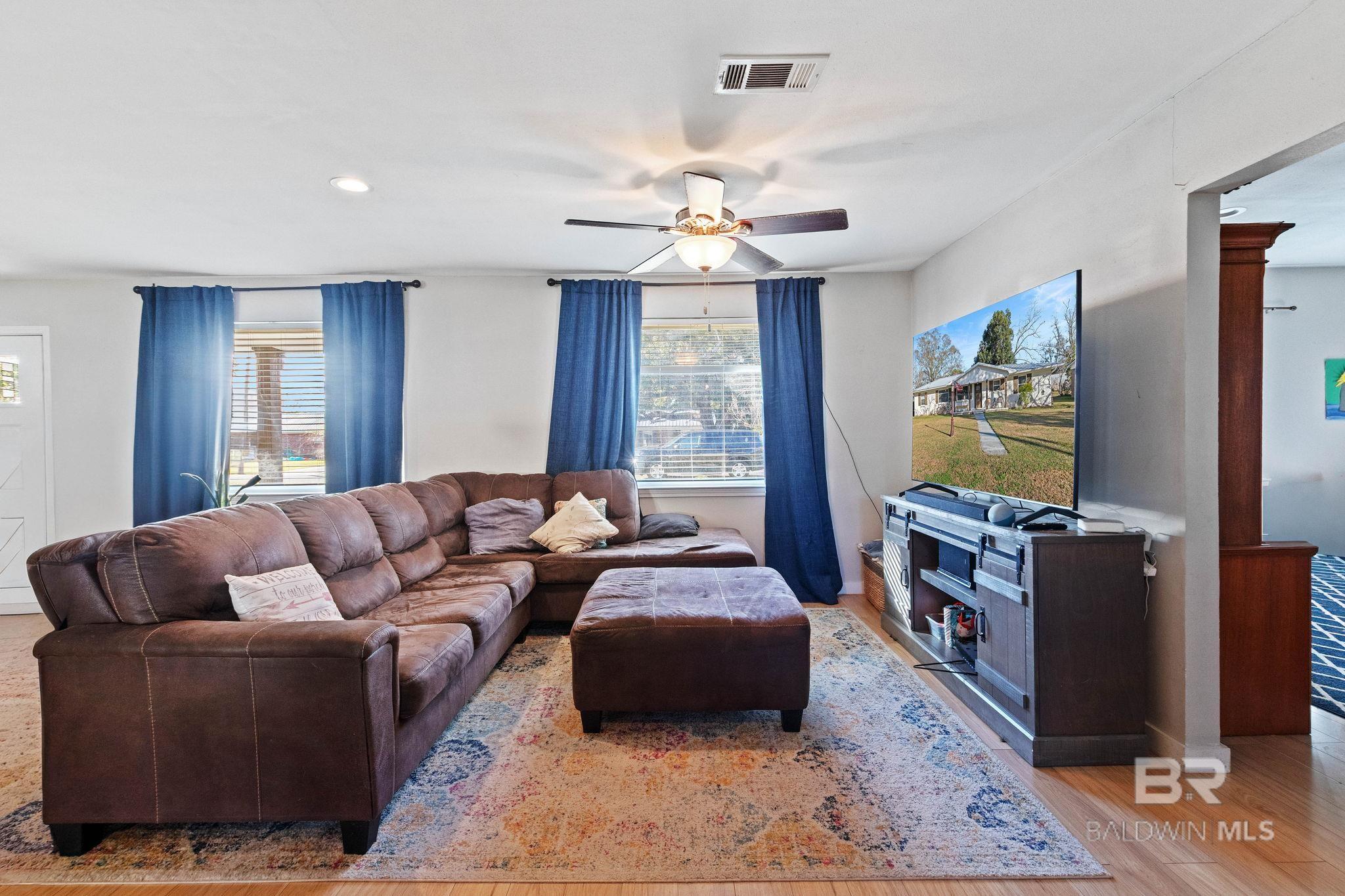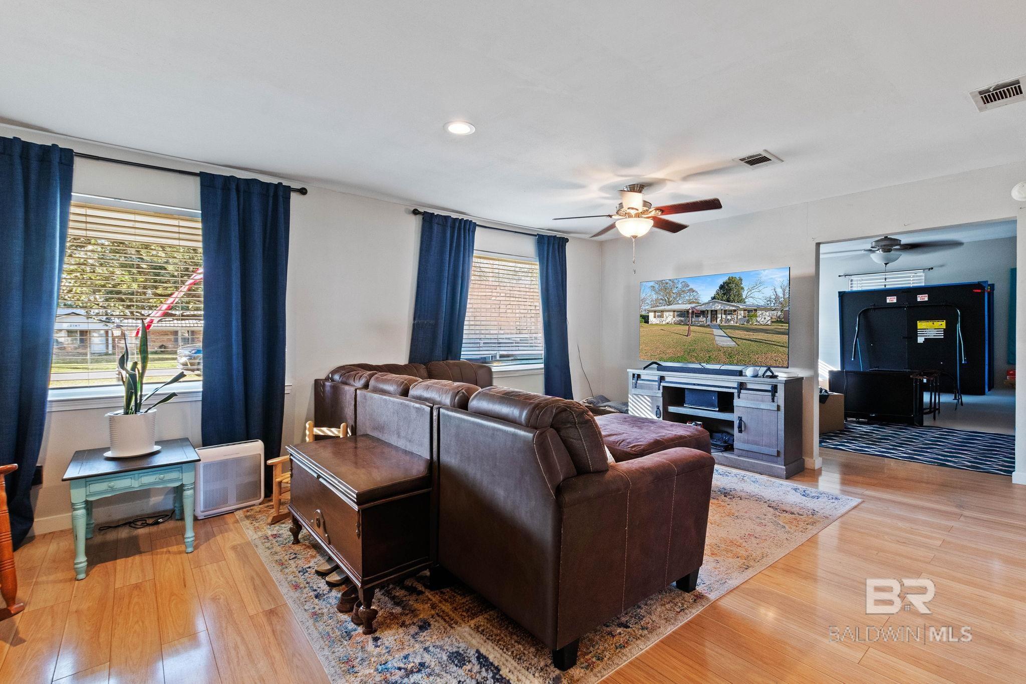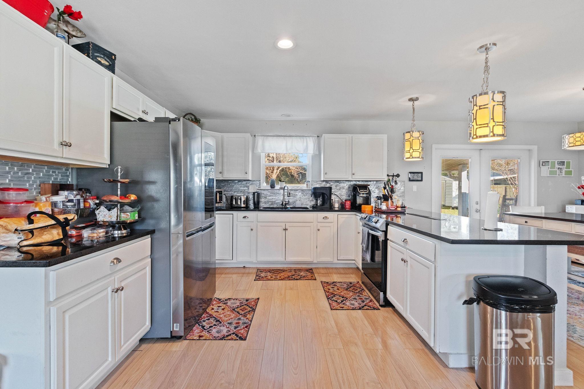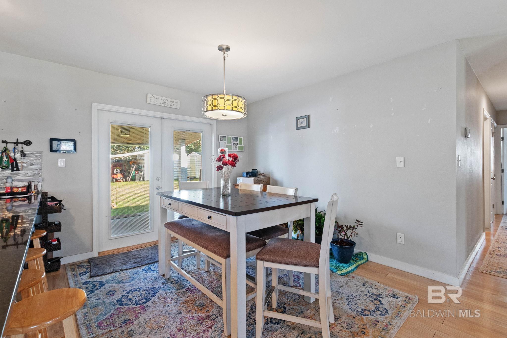 Welcome home to this 3 bed/2 bath Ranch style home, close to the park, town, interstate, and the beautiful, sandy white beaches of South Alabama. Home was remodeled in 2017 to include a new metal roof, new windows, granite countertops and Wood Laminate Flooring. Enter the home to a large open floor plan with 12' x 17' bonus room. Kitchen features black granite countertops, undermount sink, beautiful glass tile back splash, stainless appliances, and breakfast.Bar with plenty of cabinet space. French doors lead from dining area to 10' x 12' covered back porch with beautiful wood ceiling. Master bedroom with walk-in closet, en suite bath with double vanity, and shower/tub combo. Ceiling fans in all bedrooms as well as common areas. Backyard is partially fenced with 8' x 10' storage building. - Small Metal Shed does not convey with sale. Driveway is on BACK side of property. BUYER OR BUYER'S AGENT to verify all measurements as well as any information deemed important. - Home Sold AS IS Buyer to verify all information during due diligence.