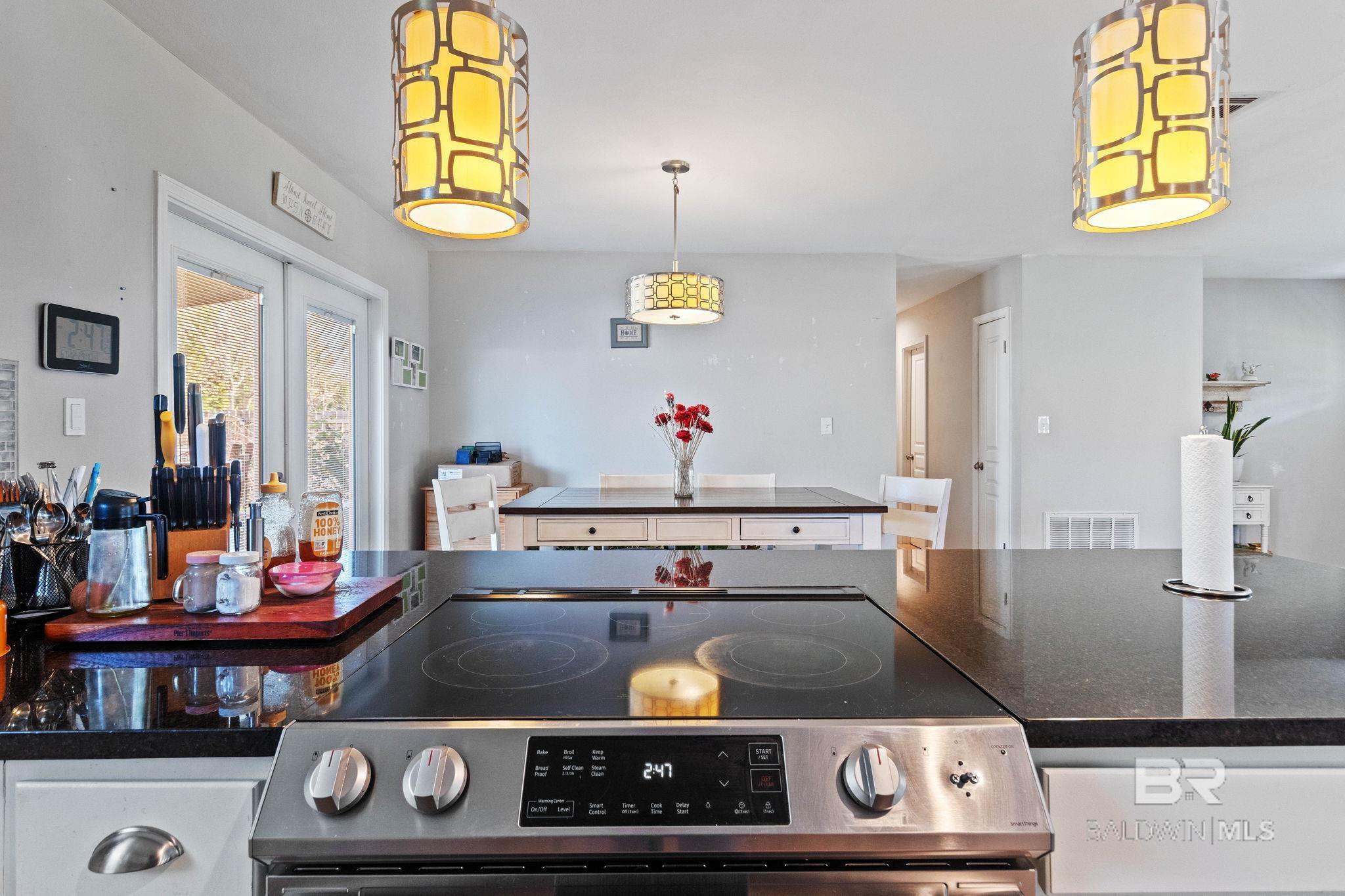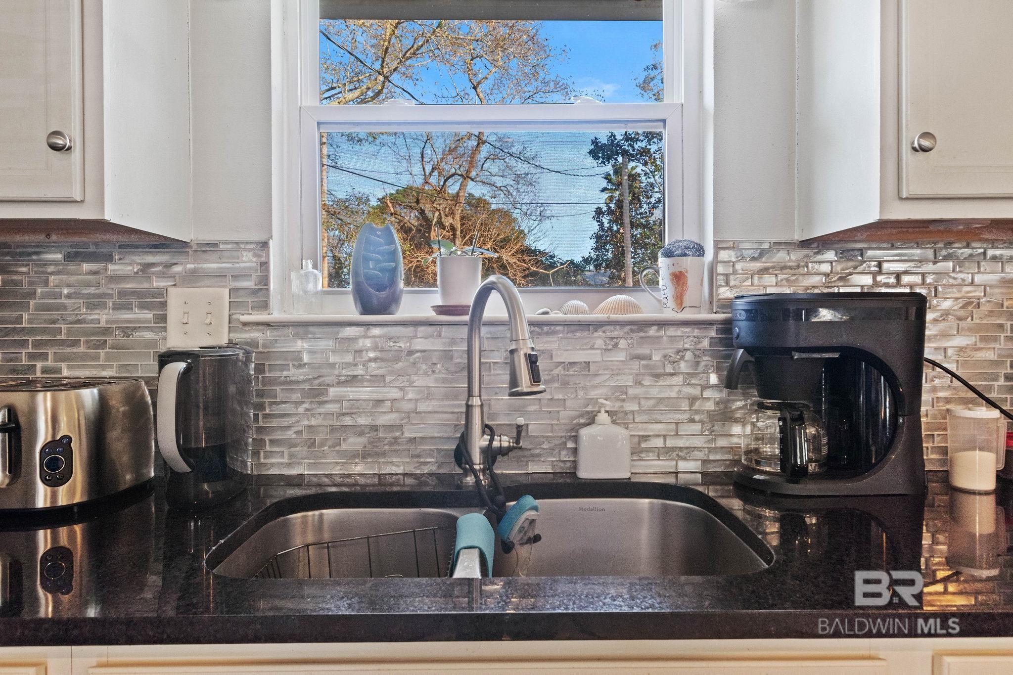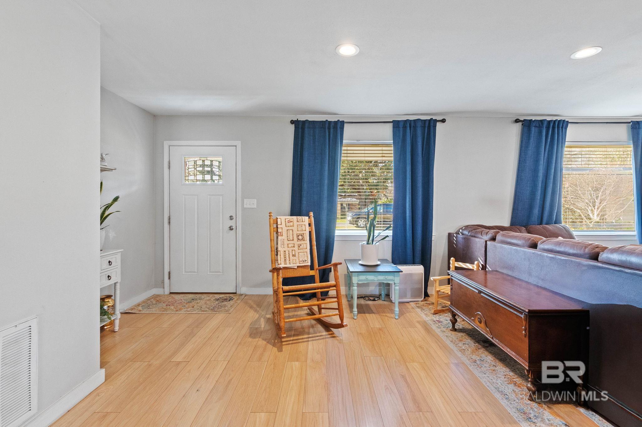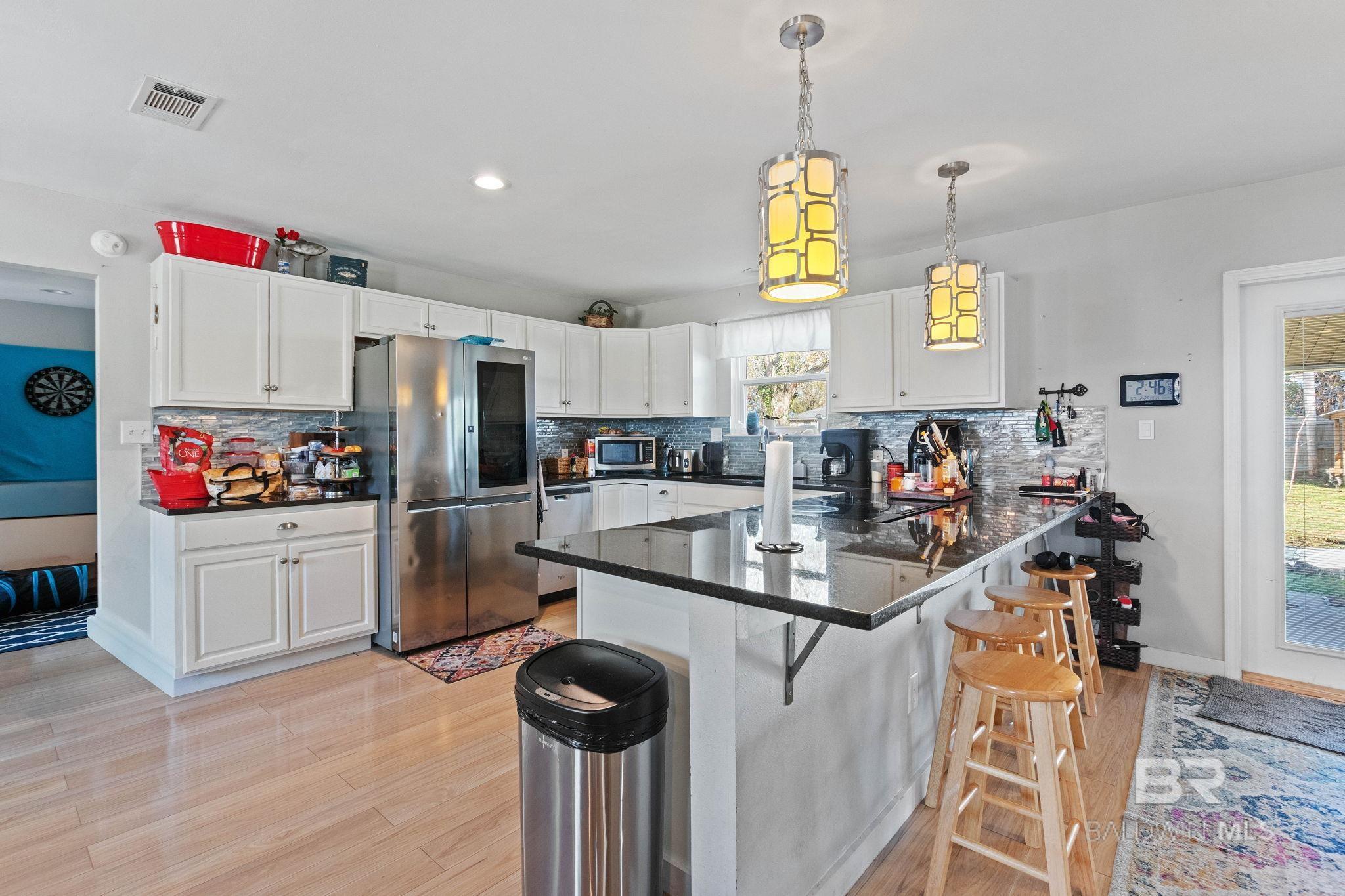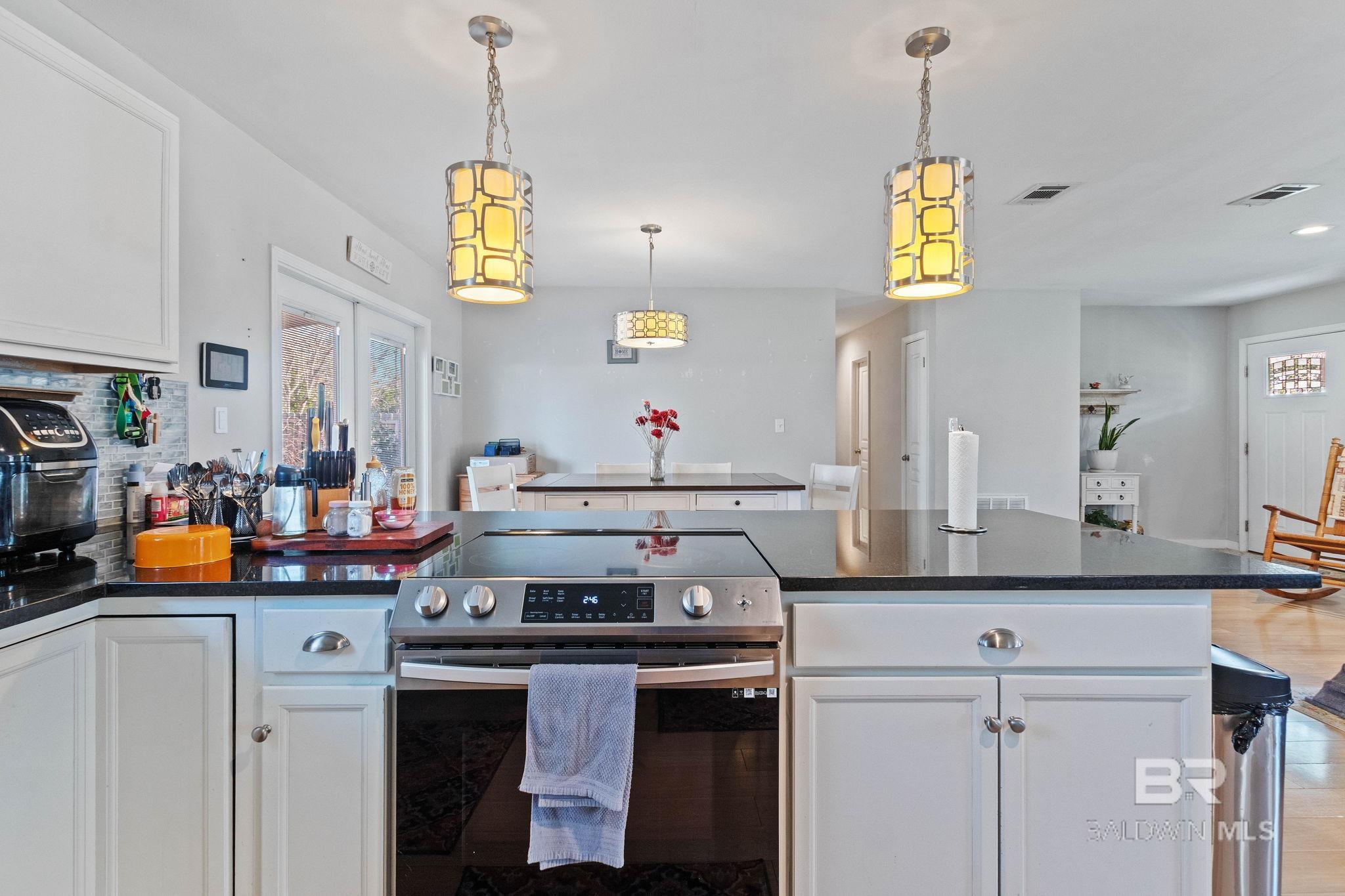 Welcome home to this 3 bed/2 bath Ranch style home, close to the park, town, interstate, and the beautiful, sandy white beaches of South Alabama. Home was remodeled in 2017 to include a new metal roof, new windows, granite countertops and Wood Laminate Flooring. Enter the home to a large open floor plan with 12' x 17' bonus room. Kitchen features black granite countertops, undermount sink, beautiful glass tile back splash, stainless appliances, and breakfast.Bar with plenty of cabinet space. French doors lead from dining area to 10' x 12' covered back porch with beautiful wood ceiling. Master bedroom with walk-in closet, en suite bath with double vanity, and shower/tub combo. Ceiling fans in all bedrooms as well as common areas. Backyard is partially fenced with 8' x 10' storage building. - Small Metal Shed does not convey with sale. Driveway is on BACK side of property. BUYER OR BUYER'S AGENT to verify all measurements as well as any information deemed important. - Home Sold AS IS Buyer to verify all information during due diligence.