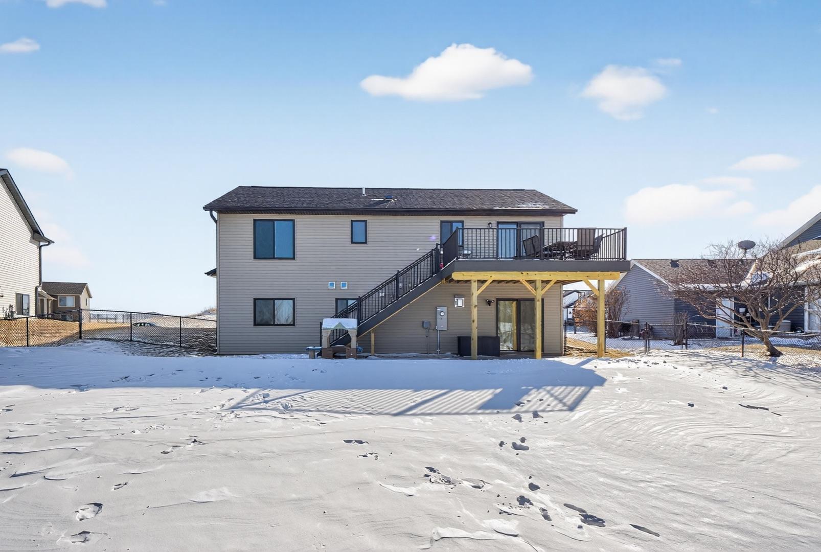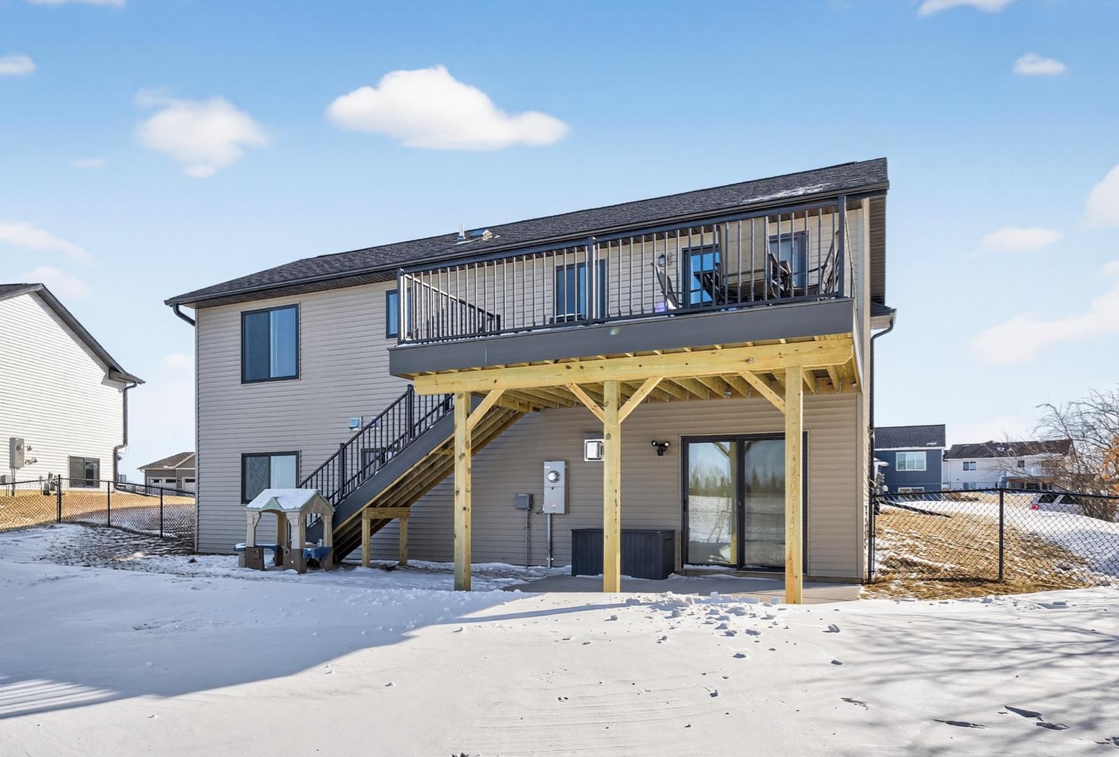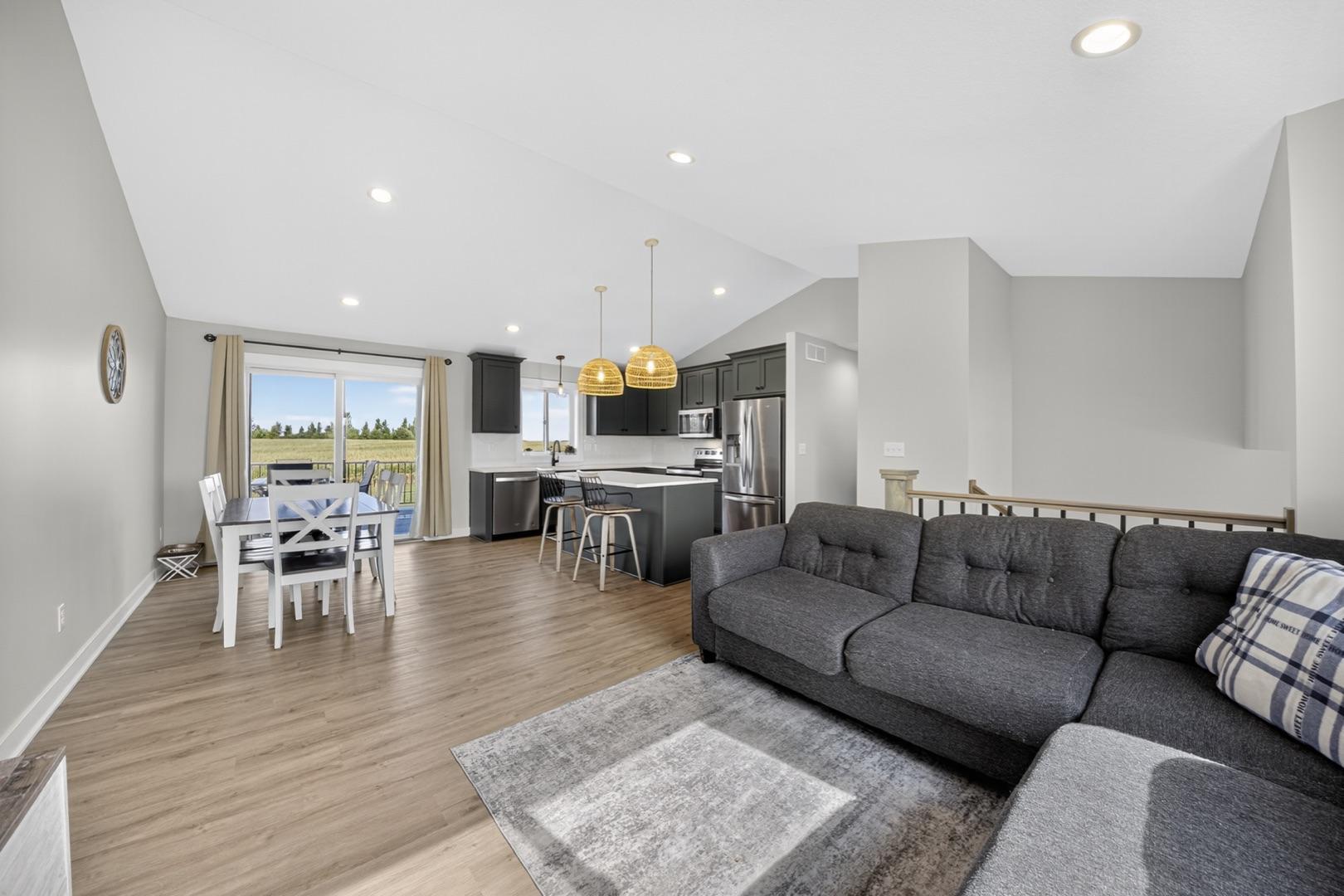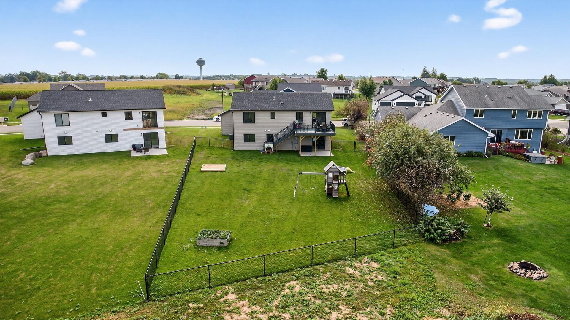 Built in 2023, this 4-bedroom, 3-bath home combines modern design with everyday comfort. The open main level features a bright, open concept living area and a spacious kitchen with sleek countertops, stainless steel appliances, and a center island, plus a dining area that opens to a maintenance-free deck. The primary suite offers a walk-in closet and private bath. The finished lower level adds a large walk-out family room with a beautiful corner fireplace, 2 bedrooms, full bath, and laundry room with storage. The washer, dryer, and water softener are also included. Outside, the fully fenced backyard backs up to open fields with no rear neighbors and includes a garden bed, play set (negotiable), and plenty of space to enjoy. Builder warranties are still in effect, offering peace of mind. Located in a desirable NW neighborhood, this thoughtfully finished home provides quick access to Rochester and I-90 and is the perfect place to call home.