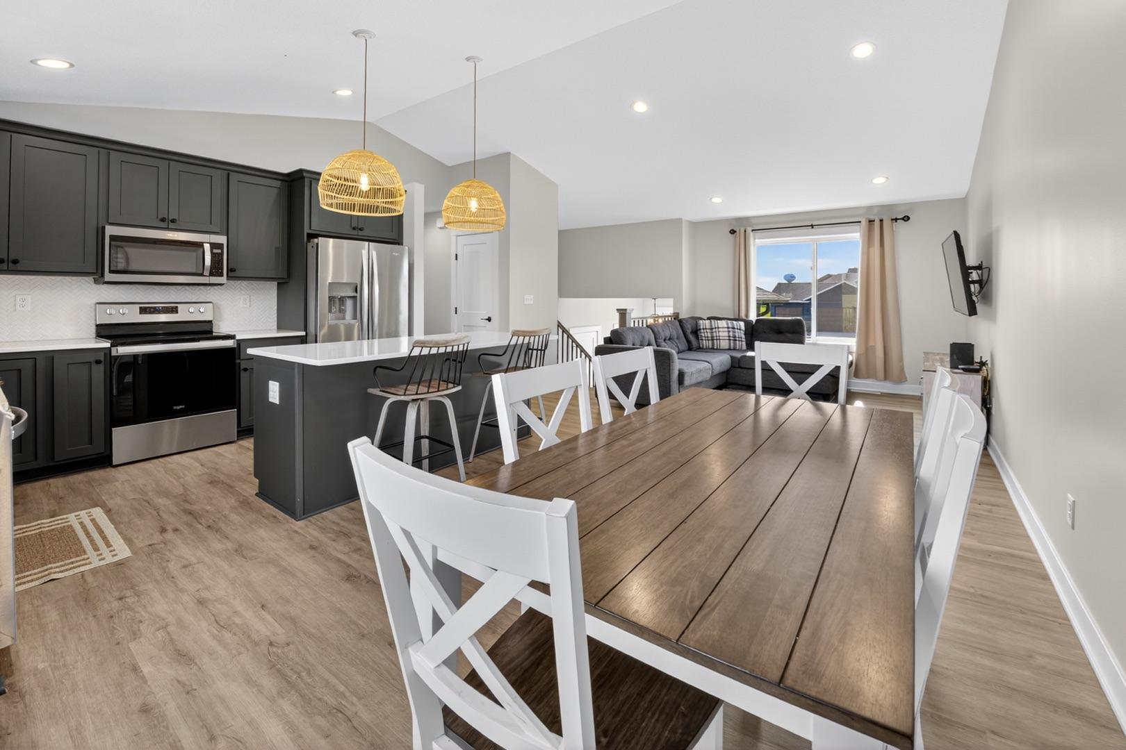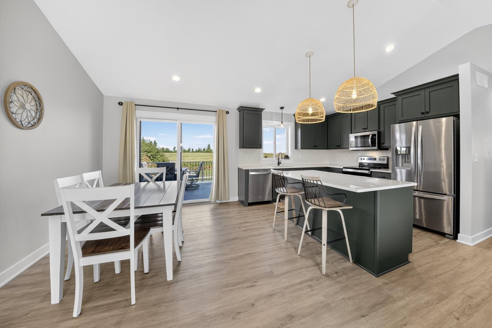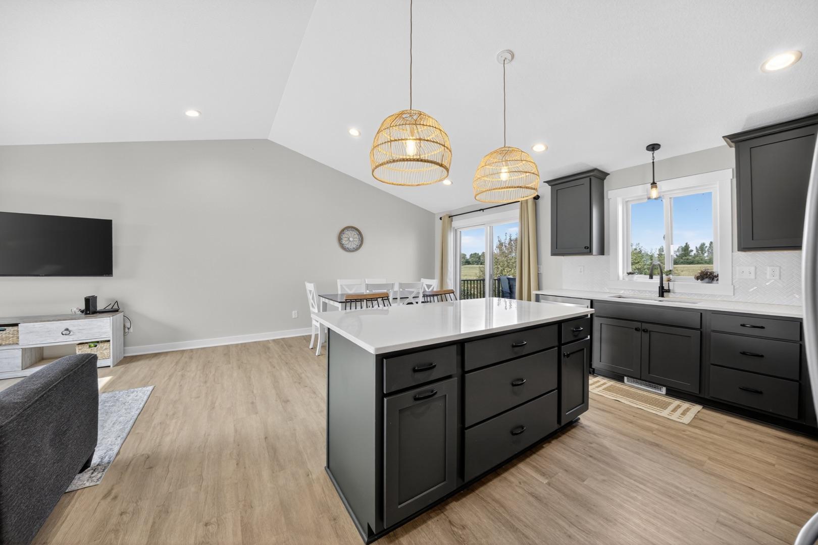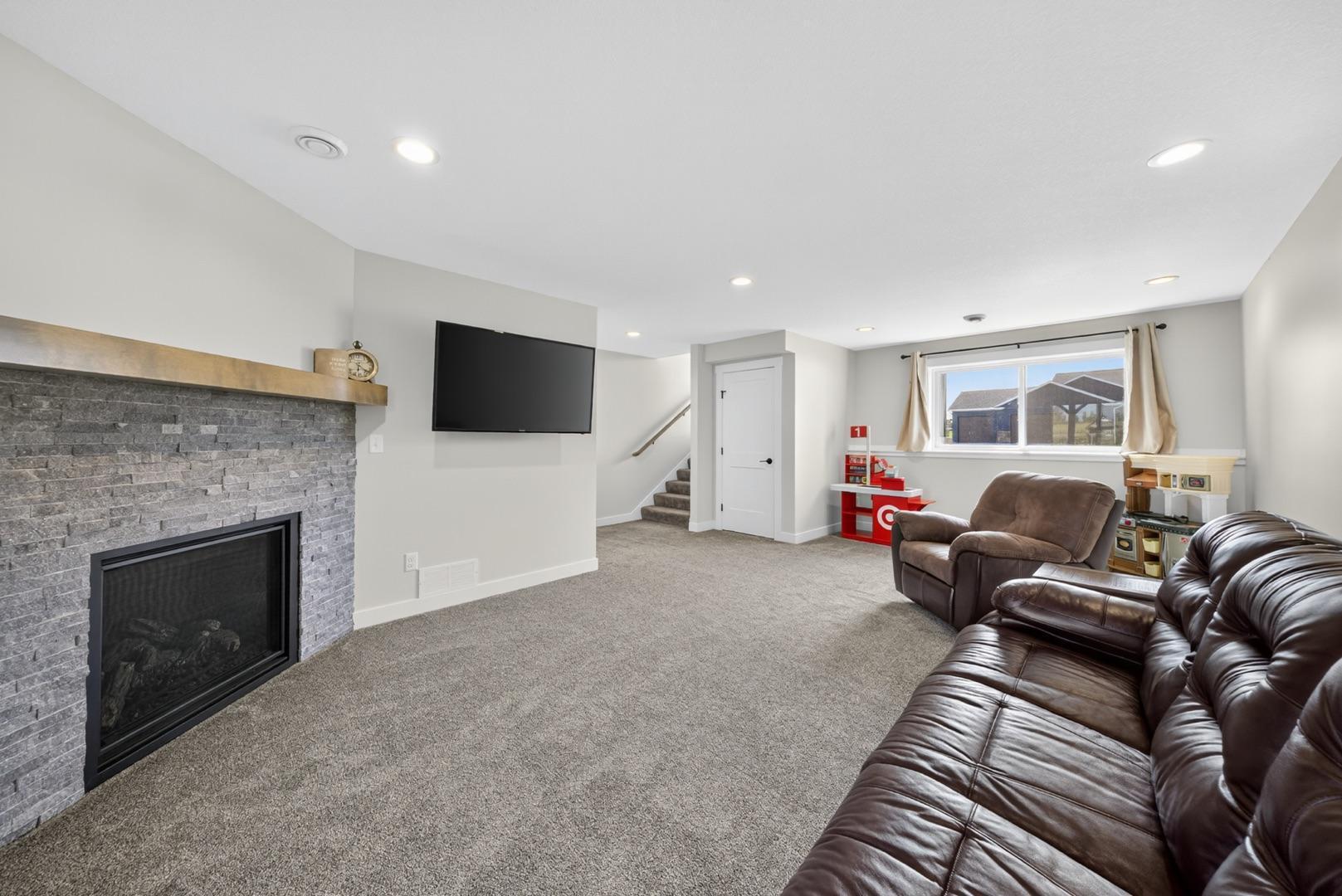 Built in 2023, this 4-bedroom, 3-bath home combines modern design with everyday comfort. The open main level features a bright, open concept living area and a spacious kitchen with sleek countertops, stainless steel appliances, and a center island, plus a dining area that opens to a maintenance-free deck. The primary suite offers a walk-in closet and private bath. The finished lower level adds a large walk-out family room with a beautiful corner fireplace, 2 bedrooms, full bath, and laundry room with storage. The washer, dryer, and water softener are also included. Outside, the fully fenced backyard backs up to open fields with no rear neighbors and includes a garden bed, play set (negotiable), and plenty of space to enjoy. Builder warranties are still in effect, offering peace of mind. Located in a desirable NW neighborhood, this thoughtfully finished home provides quick access to Rochester and I-90 and is the perfect place to call home.
