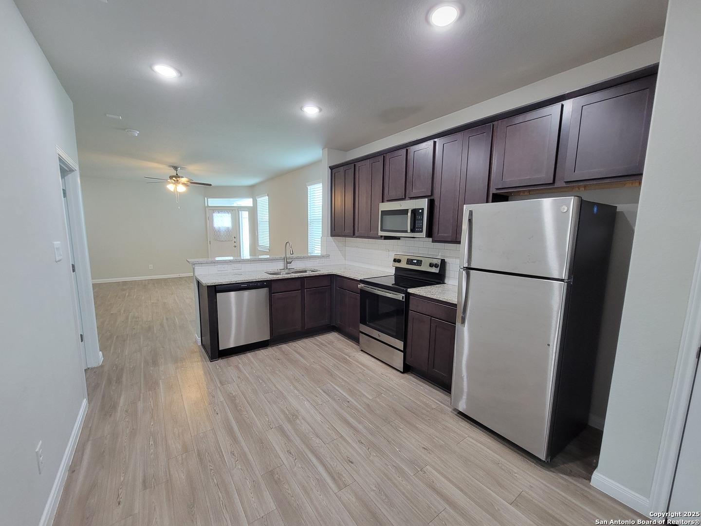 Beautiful duplex in Sydney Cove subdivision! This 3 bed/2bath home has an open floor plan with no carpet throughout, making maintenance easy! The kitchen features stainless-steel appliances and marble countertops. The primary bedroom is spacious, and the primary bath features double vanities, walk-in shower, and a large walk-in closet. The backyard boasts a covered patio area, perfect for staying out of the sun, and is fully fenced in for privacy and lawn maintenance is included in the rent! The home is conveniently located just 7 miles from Randolph Air Force Base, 13 miles from New Braunfels, and is a short drive to Interstate 35, Loop 1604, and Interstate 10.