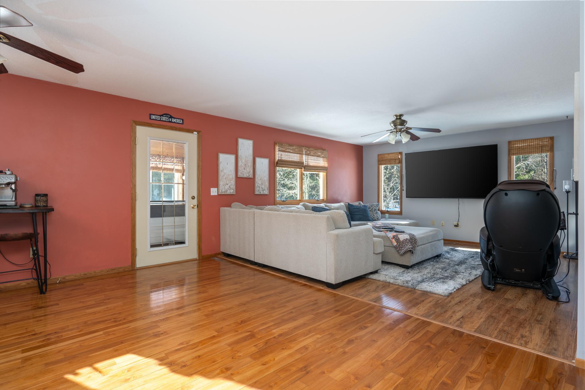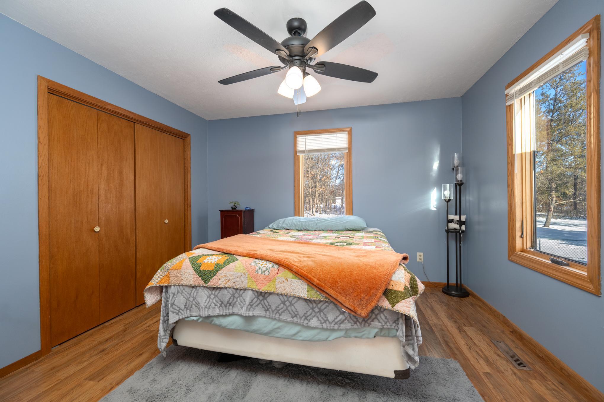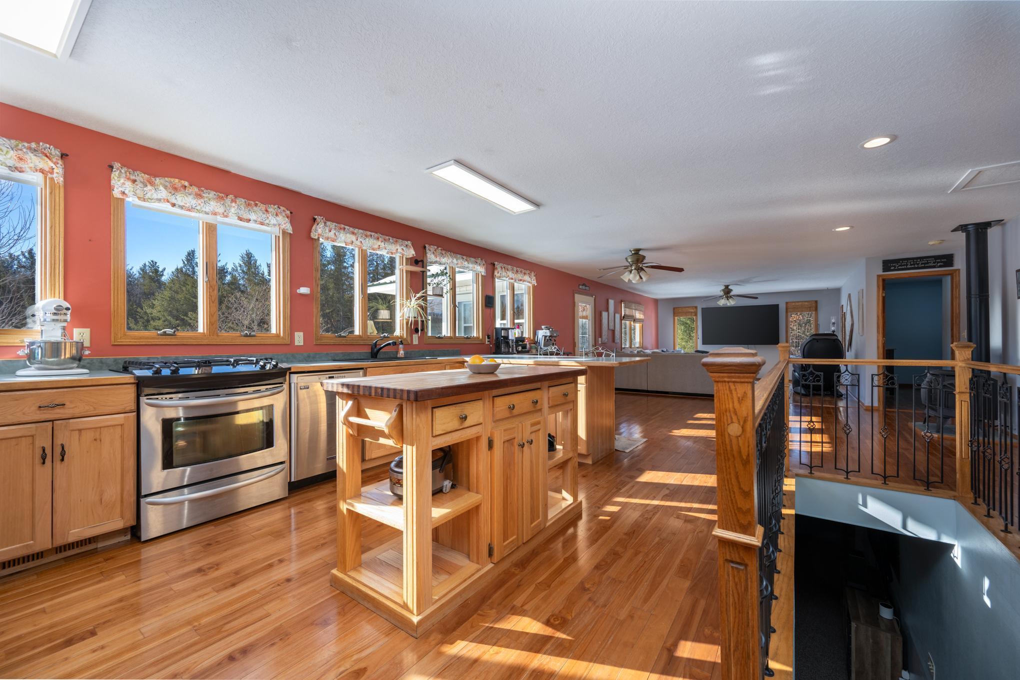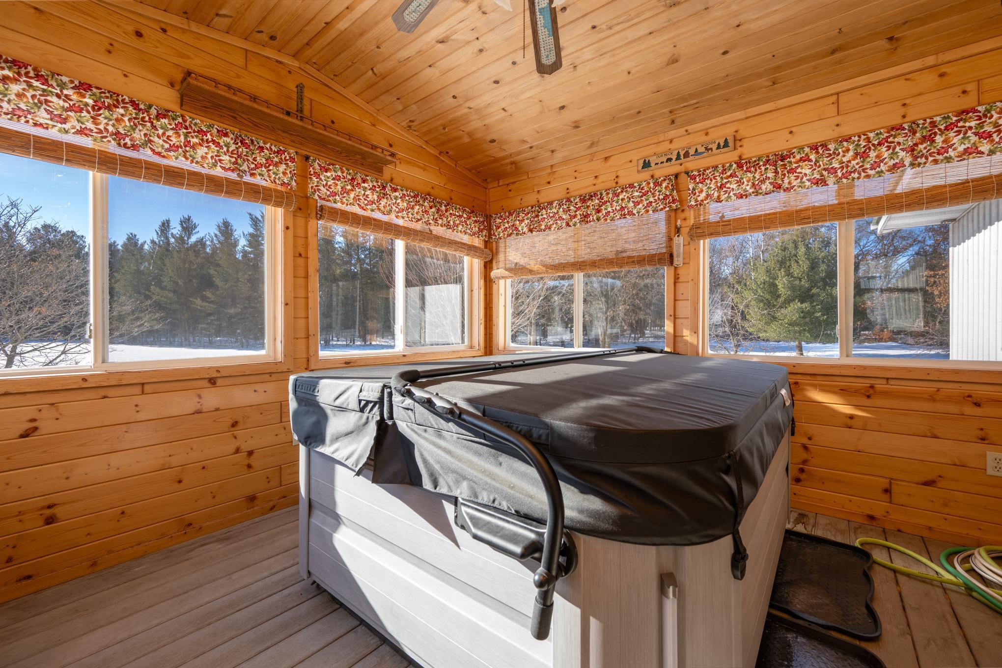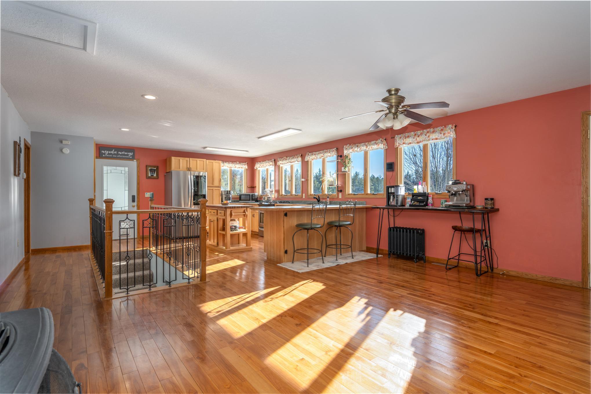Beautiful and peaceful country retreat, a short drive to the Twin Cities and very near the lovely St Croix River and Governor Knowles State Park! This 4 bd/3ba ranch is beautifully done inside with newerflooring and fresh paint. The open floor plan makes the most of expansive views of the gorgeous 9 acre parcel. Outside there are mature fruit trees including apple, crabapple and plum, along with wildblueberries and raspberries. The fenced raised-bed garden area also has a healthy clump of asparagus, and has water available piped over from the sand point well inside the outbuilding. Next to the garden area is a chicken coop, currently used for garden tools but easily re-converted into an active coop if that'syour heart's desire. About half the acreage is wooded with mature pines and hardwoods, and the view is just spectacular. Then there's the HUGE outbuilding! At 30 x 83 ft long, it's quite a work space, readyto go with water (includes a 1/4 bath), electricity, and it's own gas heater. Behind the outbuilding is the footing for what had been a quonset hut...the seller thought it a spectacular place to install a ground-mounted solar system. The single car garage is attached to the house via a breezeway, through which you can also access a fenced back yard area. The lower level of this ranch style home has a largefamily room space, 2 bd/1 ba and a very large equipment room that includes a cold pantry area. And then, let's not miss the enclosed 4-season front porch. Currently there's a hot tub in there, which mayincluded with the right offer. So much here to see and enjoy - space, quiet, solitude, and the potential to create your own hobby farm! Adjacent 5-acre parcel also for sale under separate listing. Hurry for your chance to create your own northern escape!