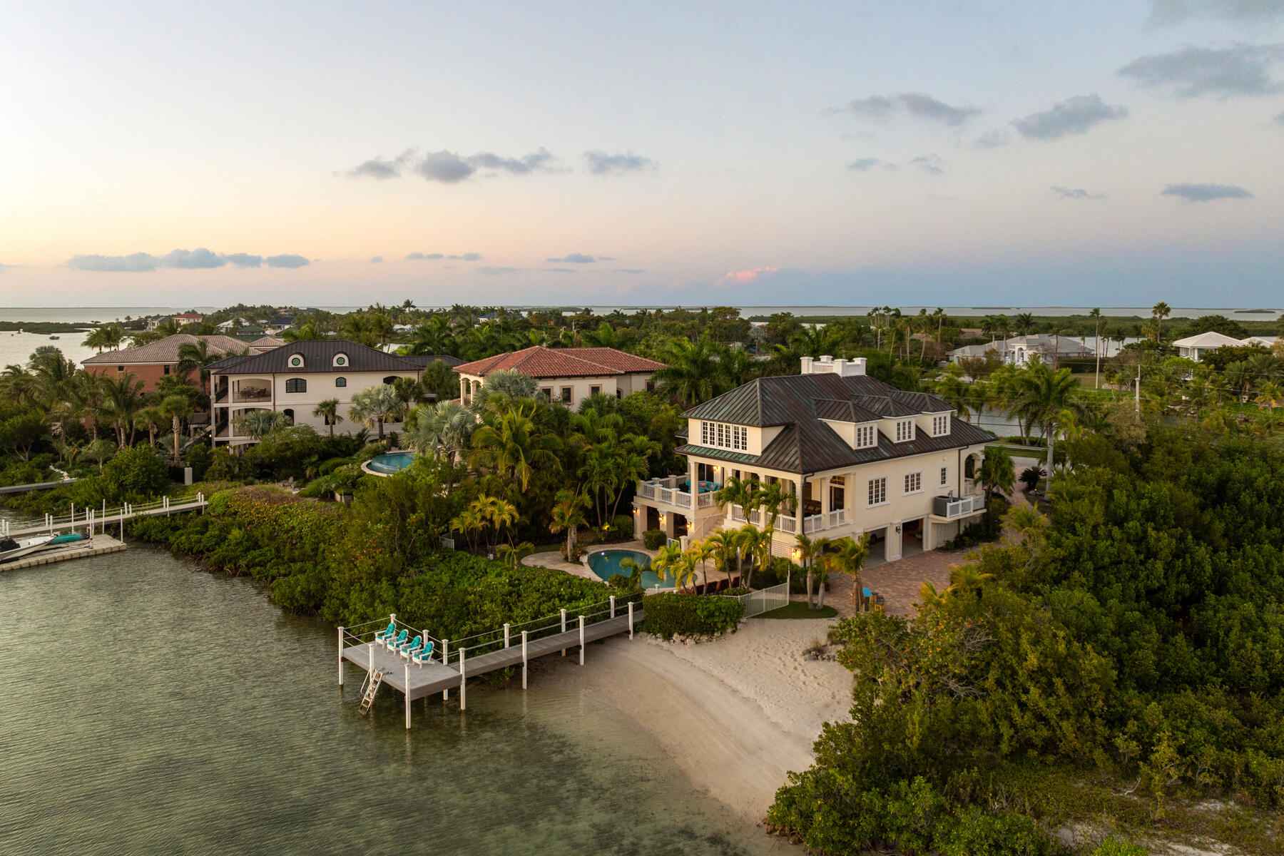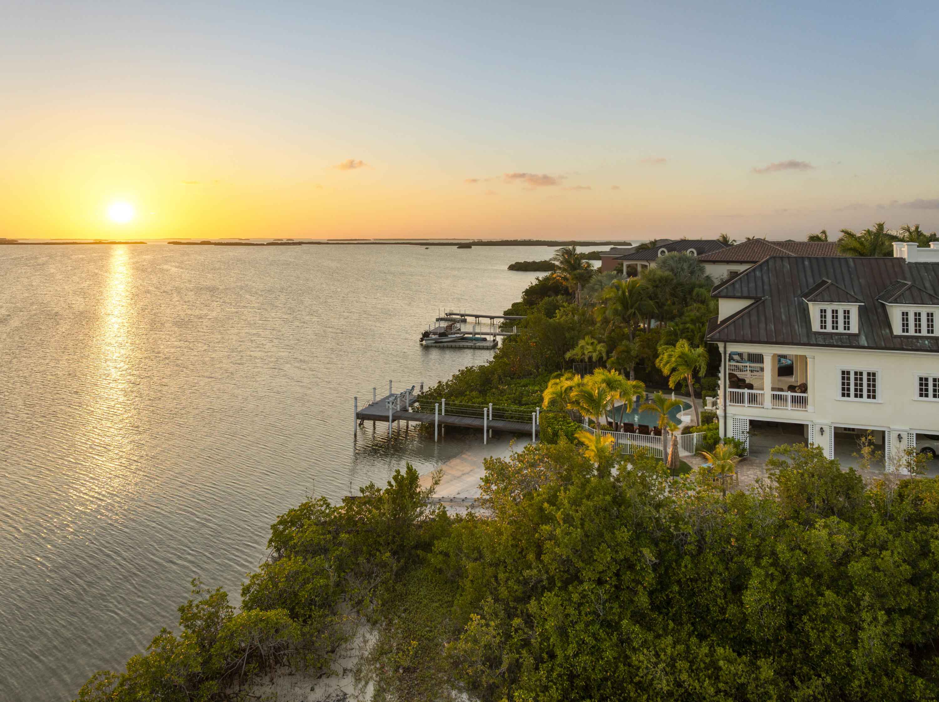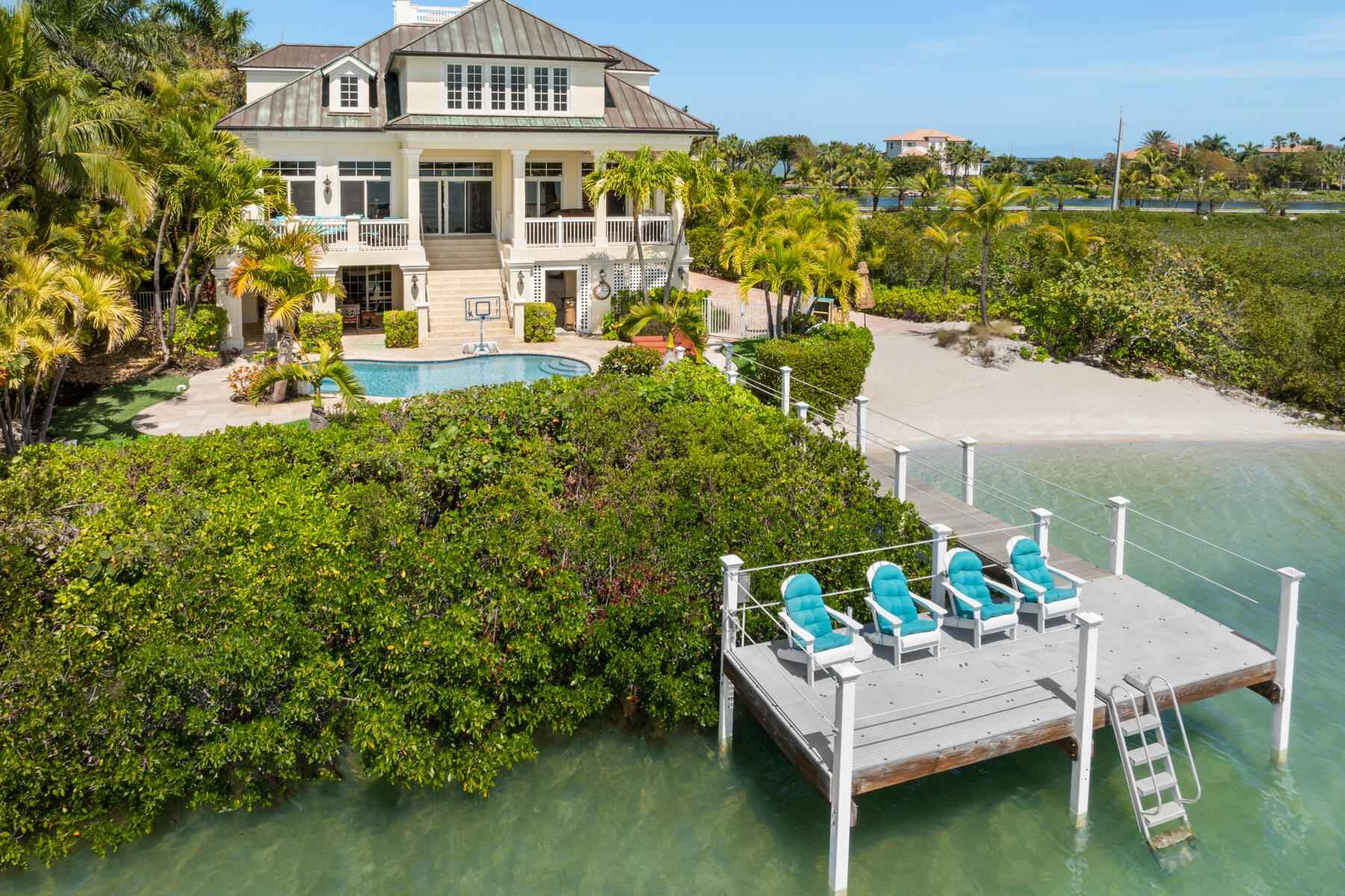 Tucked behind swaying palms and lush tropical landscaping, this elegant waterfront estate captures the very best of Florida Keys living. From breathtaking sunset views to exceptional outdoor spaces, every moment here feels like a true escape.Whether you are relaxing on your private beach or entertaining poolside, the setting is unforgettable. It is the kind of home that reminds you exactly why you chose island life.Inside, sun filled living spaces open to sweeping Gulf views and an abundance of natural light. The gourmet kitchen is beautifully appointed with custom cabinetry, high end appliances, and an oversized island designed for gathering, hosting, and everyday living.Upstairs, the primary suite is a retreat of its own, offering panoramic water views and a spacious walk in closet. Three additional bedrooms are located on the upper level, while a fifth bedroom and full bath on the main level provide flexibility for guests or extended stays.Designed for seamless indoor-outdoor living, the home flows effortlessly to a private deck, sparkling pool, and observation dock. It is a front row seat to some of the most spectacular sunsets in the Keys.Additional highlights include a copper patina roof, a three-car covered carport, full house generator, generous storage, and a wave runner lift.Located within the prestigious gated community of Shark Key, just minutes from Key West, residents enjoy resort style amenities including a clubhouse, inland swimming lagoon and beach, as well as pickleball and tennis courts.24 Cannon Royal Drive is more than a home. It is a lifestyle defined by privacy, beauty, and the magic of the Florida Keys.
