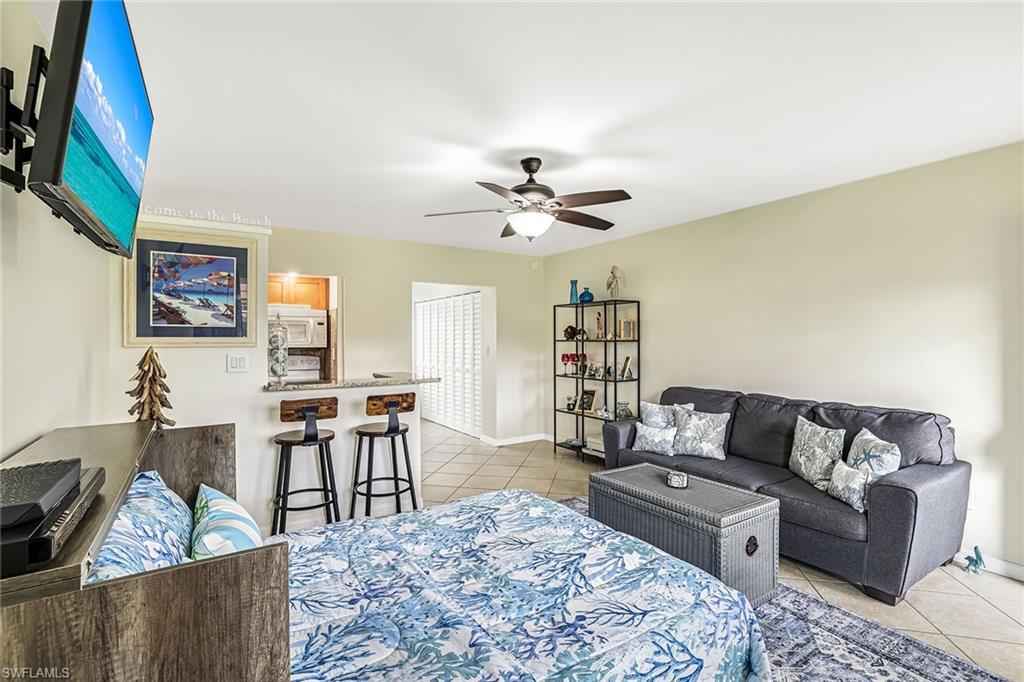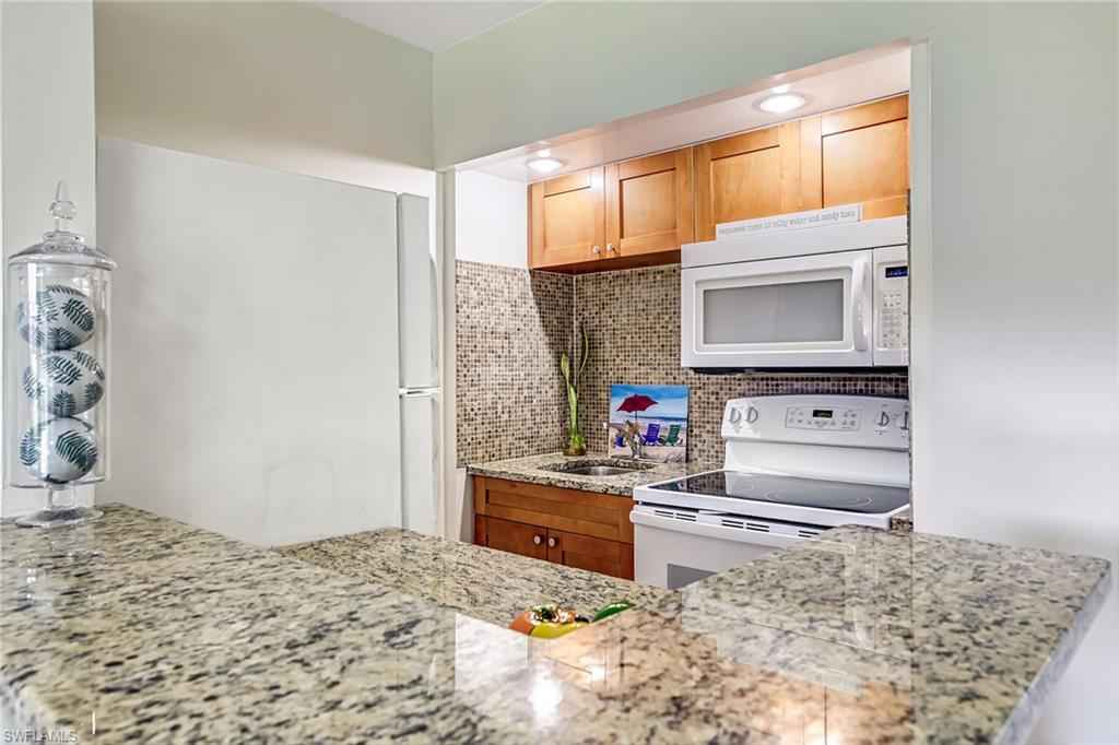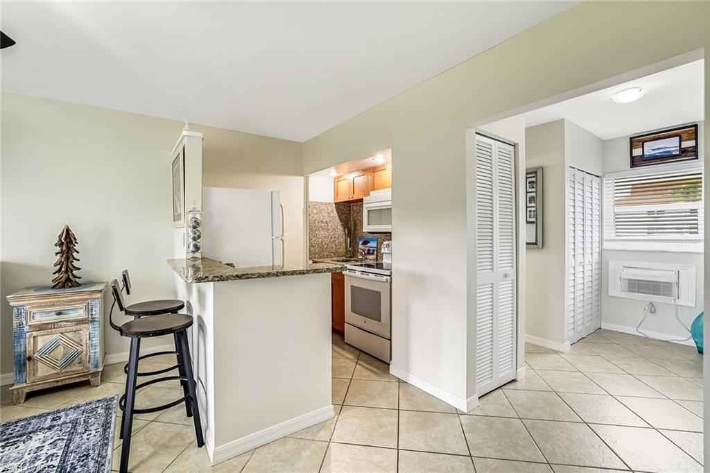Don't miss this well-maintained and updated first-floor studio condominium in the Seabreeze complex. In a popular Collier Boulevard location with proximity to Marco Island's Residents Beach entrance and across from many restaurant's, it's the ideal Island getaway. Kitchen has granite bar countertop, tile backsplash, wood cabinets, and GE range and refrigerator. The bath has marble vanity and walk-in tile shower with large rain showerhead. This west-facing unit is bright and inviting. Unit is freshly painted and has neutral tile flooring throughout. Air conditioner is one year old. HWH is approximately five years old. The buildings were recently painted, impact doors and windows installed and new roofs completed. Amenities include heated community pool, clubhouse, laundry facilities with new impact windows, bike racks and grills. Parking space behind the building, assigned G3 and guest spots available. Quiet unit, no noise from Collier Boulevard. No water intrusion during storms, according to the owner. Extra storage available. Locker G3 assigned.