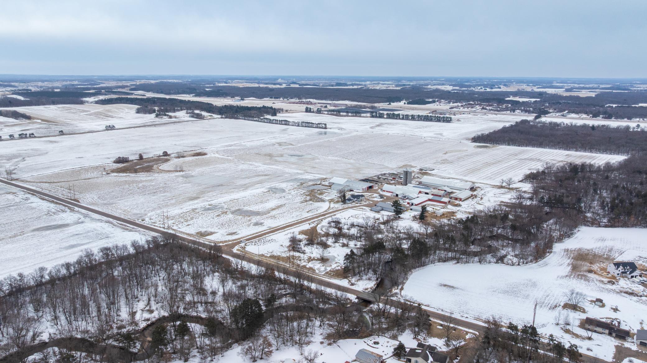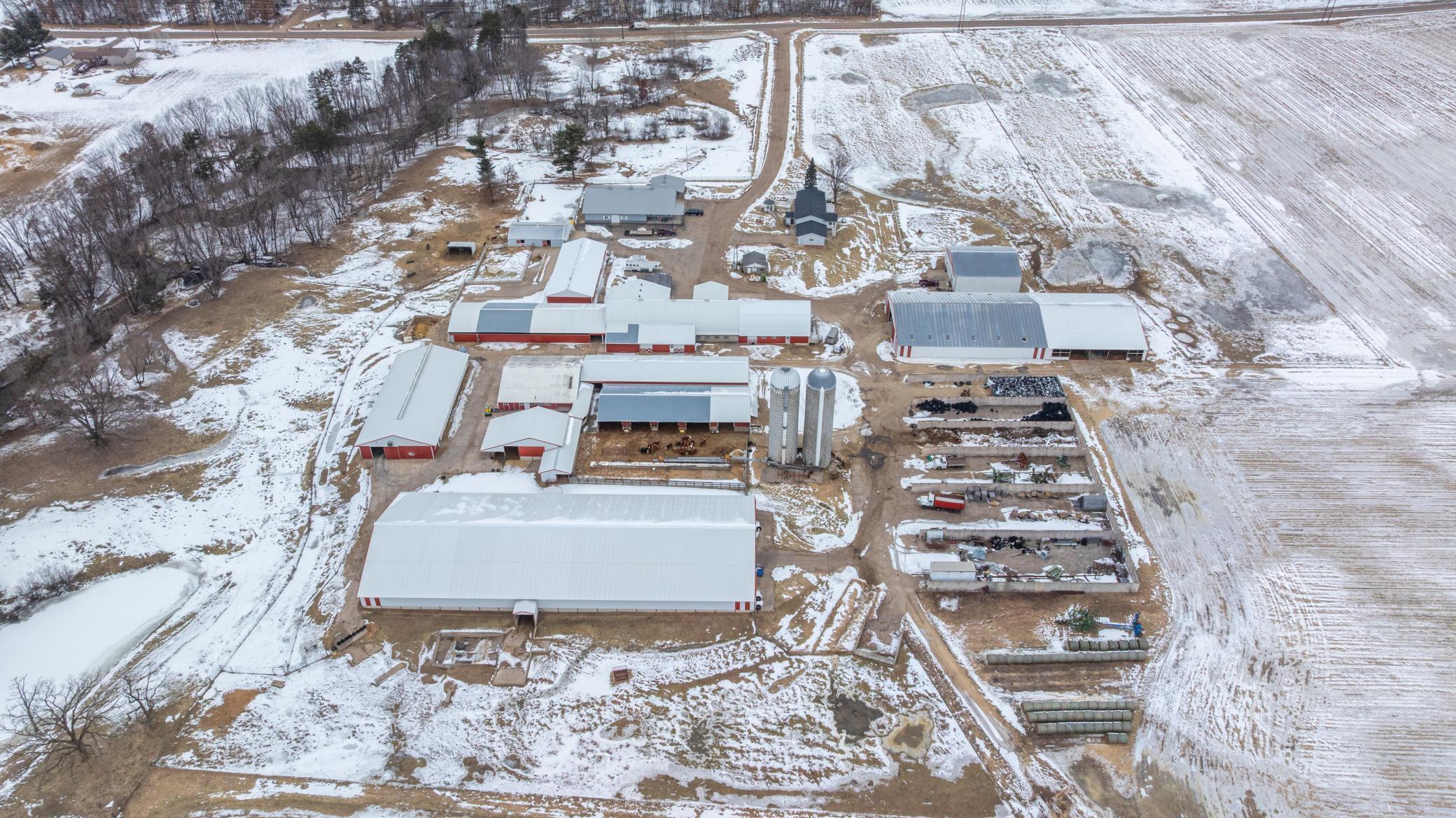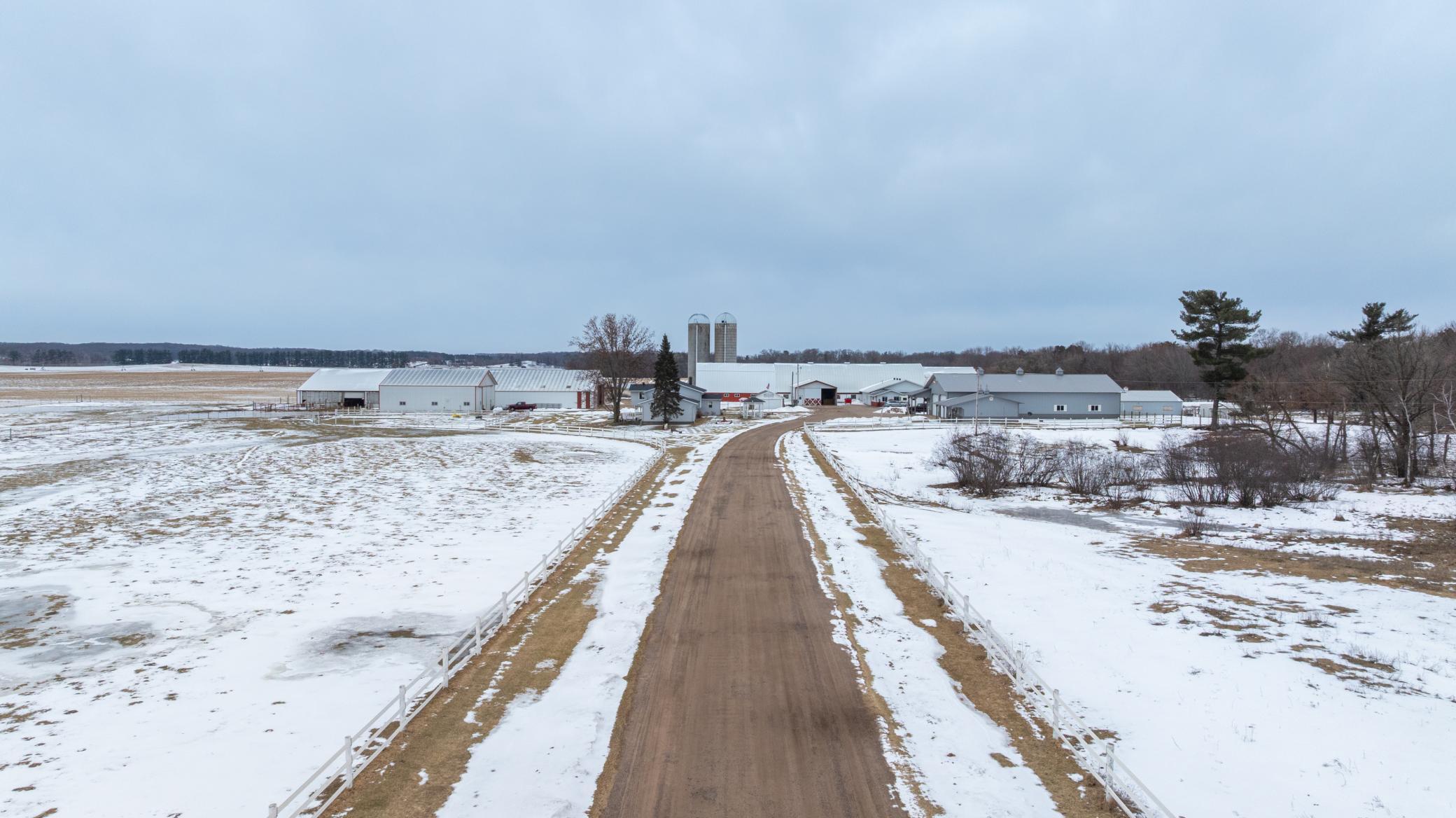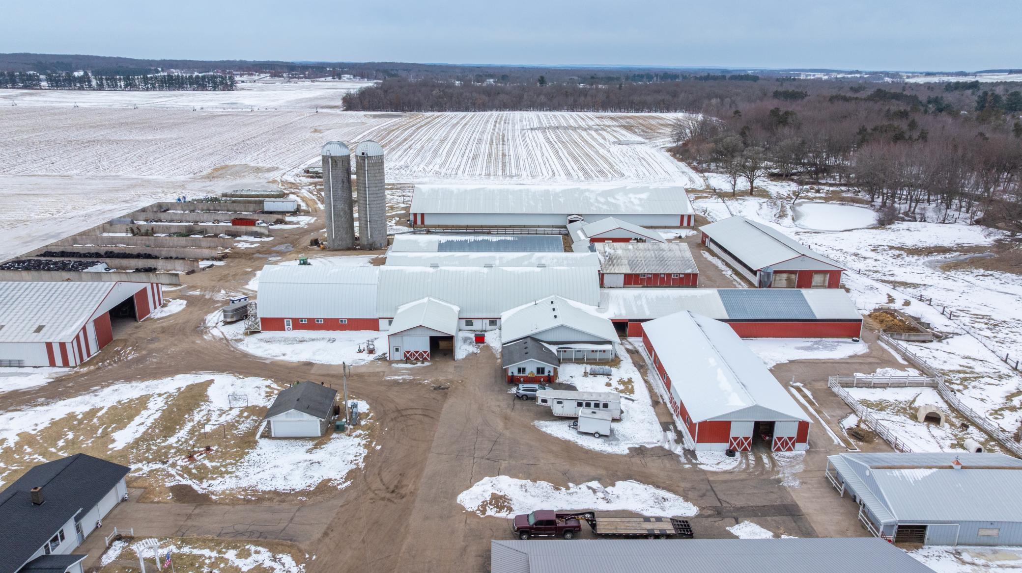 Welcome to the incredible estate of Sandy Acres! This pristine farm is located just minutes north of Eau Claire in the town of Elk Mound. Spanning approximately 136 +/- acres, the property features extremely productive tillable ground, wooded acreage and beautifully maintained buildings and sheds perfect for housing livestock and equipment. The farmhouse consists of 5 bedrooms, 3 baths and boasts incredible views in all directions! Two furnaces and air conditioning units serve the home along with heated floors within the newest addition built in 2004. The main shop situated directly across from the home includes multiple impressive improvements such as a large bar area, half bath and large heated storage area perfect for storing equipment or conducting business. The main barn also includes an large office, breakroom and bathroom. The additional sheds and barns throughout the property offer expansive areas for housing livestock and farming equipment including gates and stalls. Two separate wells serve the property providing water to the barns and home. The property also includes two silos and multiple large feed bunkers. Included in the power shed is a 150 kw John Deere diesel generator ready to power all buildings and home in the event of a power outage!As an added bonus, enjoy approximately 1300 ft of owned frontage along the coveted class I trout stream of Elk Creek! True legacy farms like this do not become available often. Whether you are looking to begin a generational hobby farm or operate a large scale farming operation, this property has something to offer everyone!