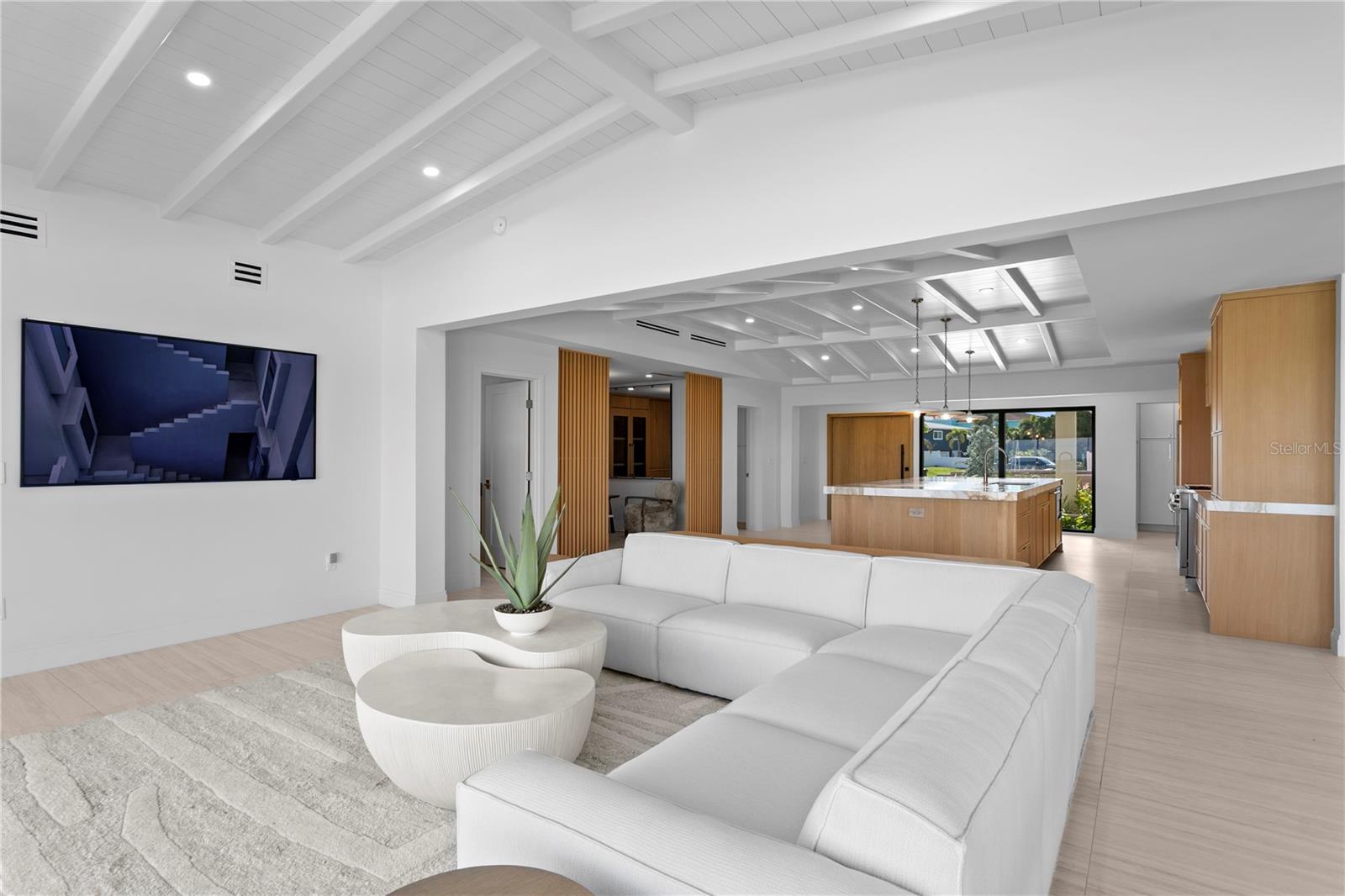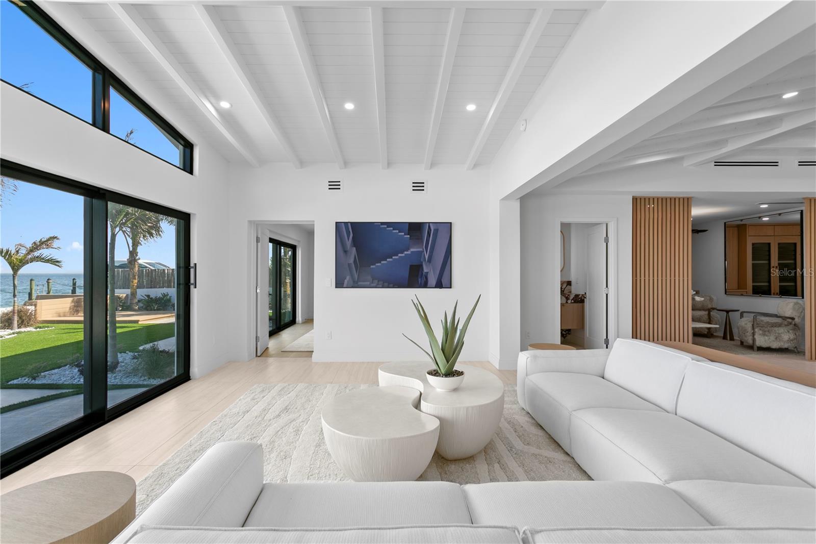 On the open water of Tampa Bay in a quaint neighborhood called Tropical Shores, this fully renovated custom waterfront residence offers refined coastal luxury just one mile from vibrant Downtown St. Petersburg and steps from the waterfront Lassing Park. Completely transformed with no expense spared, the home showcases high-end designer finishes throughout, blending modern elegance with warm coastal sophistication. Expansive living spaces feature vaulted beamed ceilings, wide-plank flooring, custom millwork, and walls of glass that frame breathtaking open water views and fill the home with natural light. The kitchen is anchored by dramatic natural stone countertops and backsplash, custom cabinetry, premium appliances, and an oversized island designed for entertaining. Living and dining spaces flow seamlessly to the waterfront, creating an effortless indoor-outdoor lifestyle. Luxurious bathrooms feature statement marble, custom vanities, and spa-quality fixtures, while curated lighting and architectural details elevate every space. The backyard is truly the showpiece of this property with a gorgeous pool and expansive outdoor living space designed for both entertaining and relaxation. Enjoy direct boating access to Tampa Bay with a 20,000-lb boat lift, new seawall, and beautifully designed outdoor living areas overlooking the water. Completely updated and move-in ready, (could be sold furnished) the home experienced no flooding, offering peace of mind along with exceptional design and craftsmanship. Tropical Shores offers a rare combination of privacy, open water and downtown St Pete views and a true waterfront lifestyle hard to match.