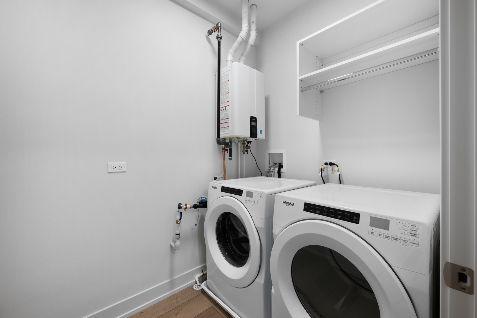 This new apartment features an open floor plan with a full kitchen, complete with an eat-in island, stainless steel sink with pull-out faucet, dishwasher, refrigerator, gas range, and microwave. The living area includes an in-unit full size washer and dryer and opens to a large private balcony. The bedroom offers a custom shelving closet, and all windows are outfitted with custom shades throughout the home. Includes its own furnace and hot water heater.