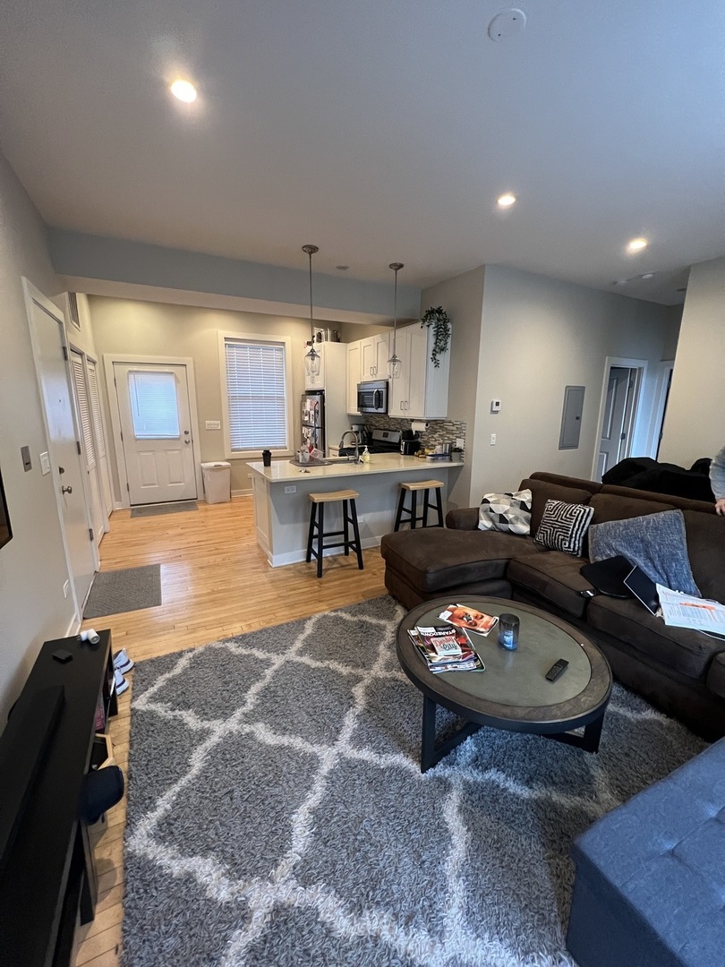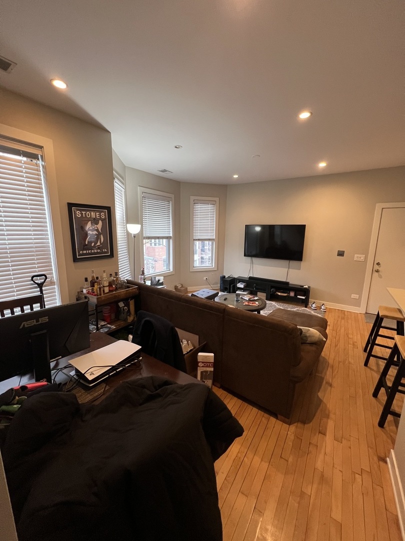 Hardwood floors, large open concept living room and kitchen, SS appliances with dishwasher and microwave, good sized bedrooms, outdoor patio space, quartz countertops, 42" cabinets, laundry in unit, 2 blocks away from Diversey Red Line. Cats are welcome ($25/pet/month fee and $100 one time fee). $500 move in fee. Resident pays cooking gas, heat, and electricity. $25 utility reimbursement fee that covers water, trash, and sewer.