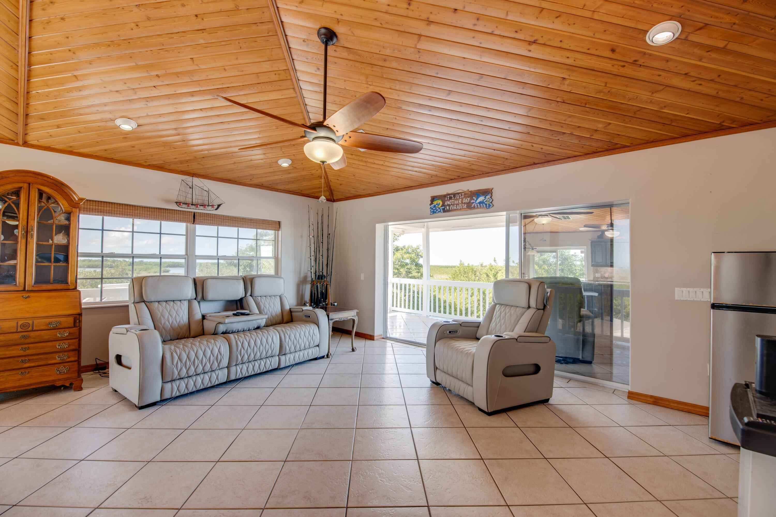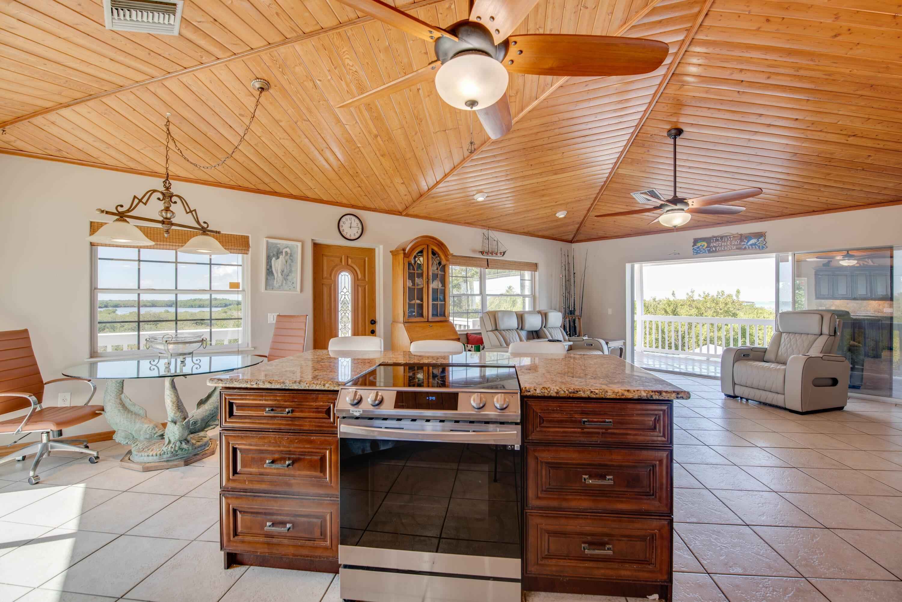 Location Location Location! This property offers lots of space, tons of privacy and stunning views. This home is situated on 2.38 acres of land with breathtaking open water views. Walk on to your newly refinished composite stairs to a walk around porch. Making access to the exterior of the home super easy. Interior layout is a large open floor plan living room with an abundance of space for entertaining or just relaxing. The lovely kitchen boasts plenty of cabinets, an eat in island, stainless steel appliances and granite countertops. The main living area seamlessly flows to large sliding glass pocket doors onto your 50' covered tiled porch. Where you can experience the open water view. Just a few paces down the hall the master suite shares the same spectacular view. Additional highlights include the laundry room on the porch with space for extra storage. Downstairs, a storage enclosure provides ample space for fishing gear, bicycles and all your extras. There is also plenty of covered parking beneath the house keeping vehicles cool and shaded. The yard provides more than enough room for your RV, boat and all your other toys. Add a pool and tiki hut to make this your tropical oasis. RV hookup is also available on the property. Located on a very quiet road with only one neighbor. You are just minutes from a public boat ramp, local restaurants, and a shopping center. Don't miss out on this rare opportunity to own your own generous amount of private property in the Florida Keys.