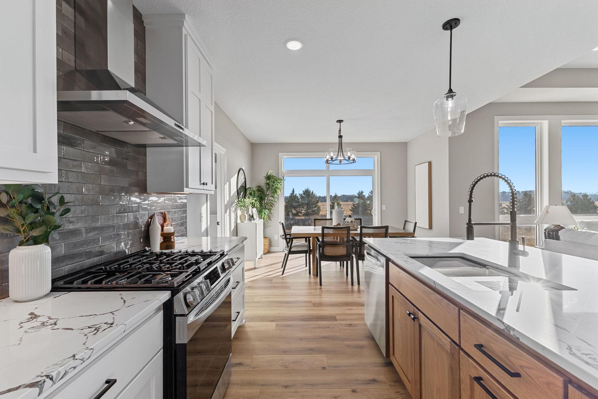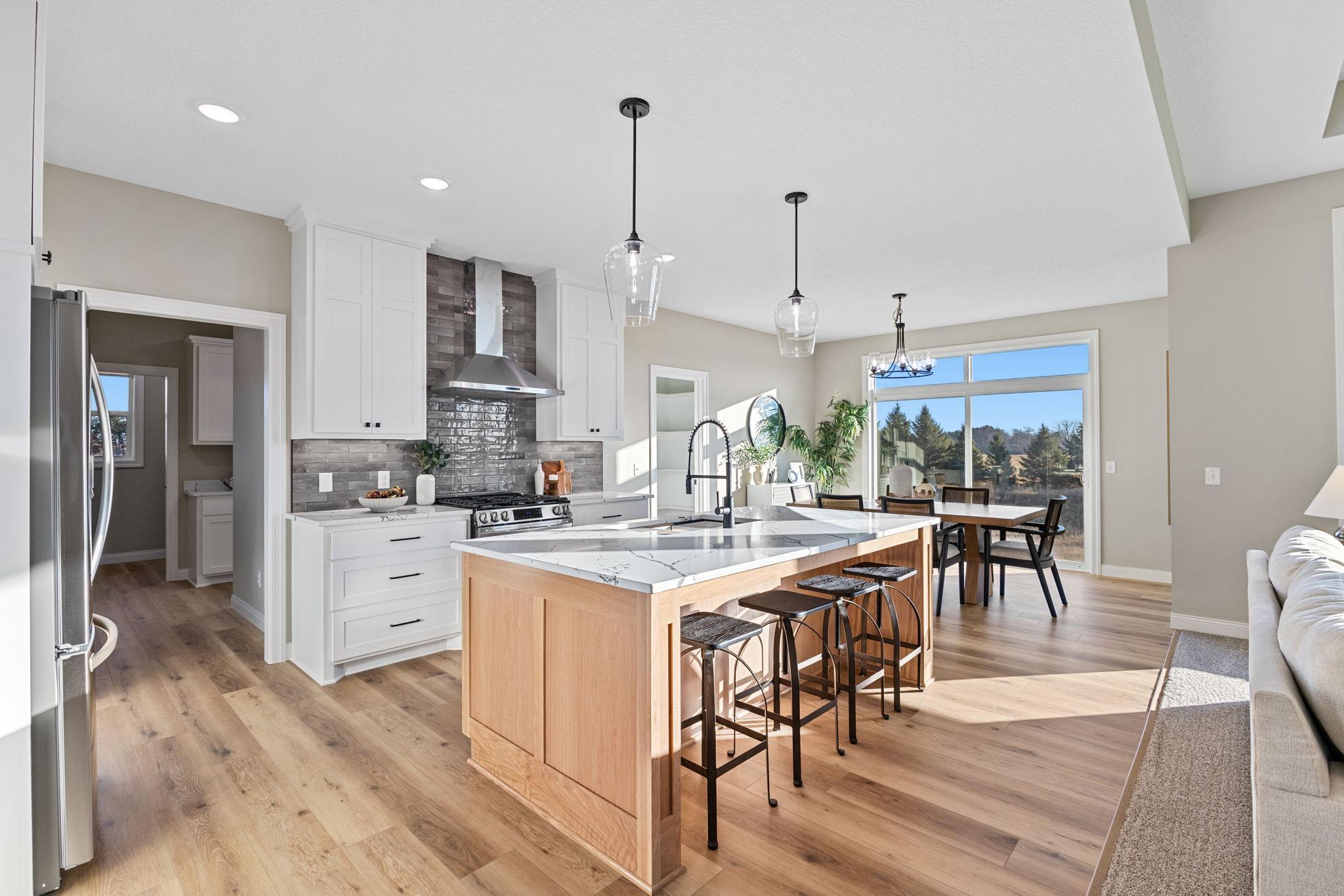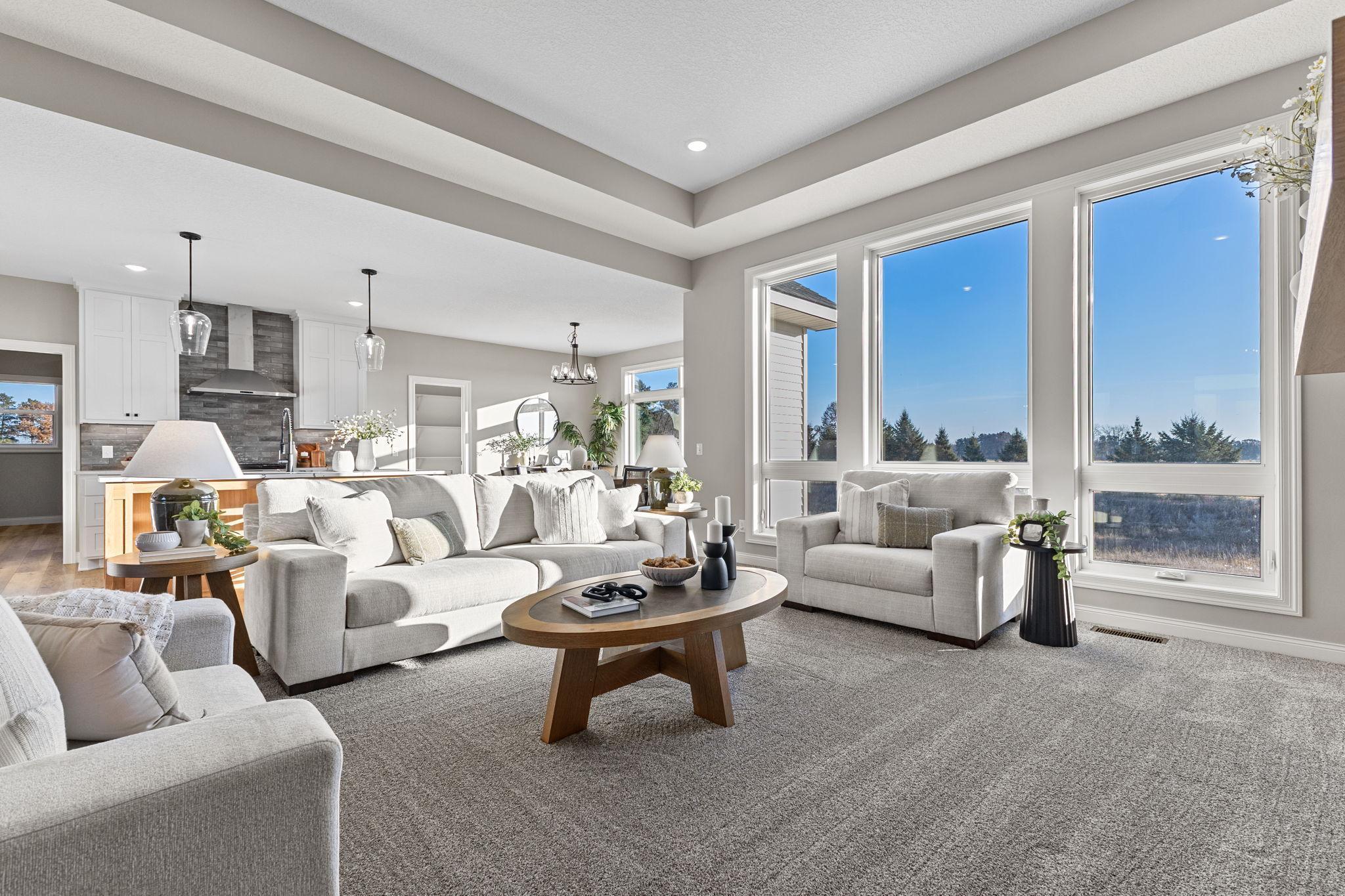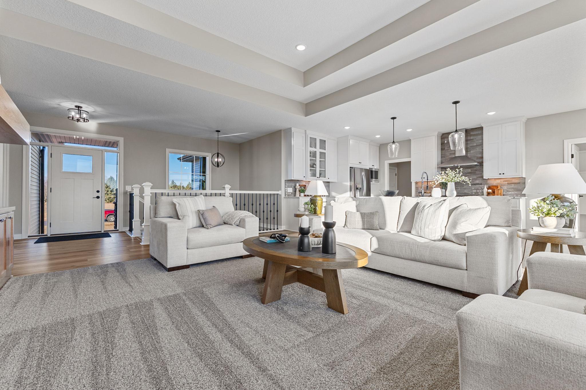 Welcome Home to the Tuscany rambler built by TH Construction of Anoka, to be greeted by a large open concept kitchen with custom built cabinets, large center island all finished with beautiful quartz tops. Offering plenty of space this kitchen also includes a walk in pantry and large dining room. The living room is one to remember with a double box vaulted ceiling to really open up the area alongside the large windows. Living room is finished with a gas fireplace, stone surround along with built in cabinets along each side of the fireplace. The primary bedroom is a homeowners dream offering vaulted ceilings, private bath with a dual bowl vanity, walk in tile shower, and walk in closet. The main floor also offers another bedroom, full bath, a large den/office, and a laundry room. Don't let me forget about the large 42x26-4 stall garage! The basement is also finished, adding a 3rd and 4th bedroom, and 3rd bathroom. The large family room also finished, with large windows, a second gas fireplace with stone surround, and an extra large patio door to walk right out to your yard! The family room also consists of a large wet bar,finished with granite tops! Yard and sprinklers included in the price! Interior pictures are of similar home.