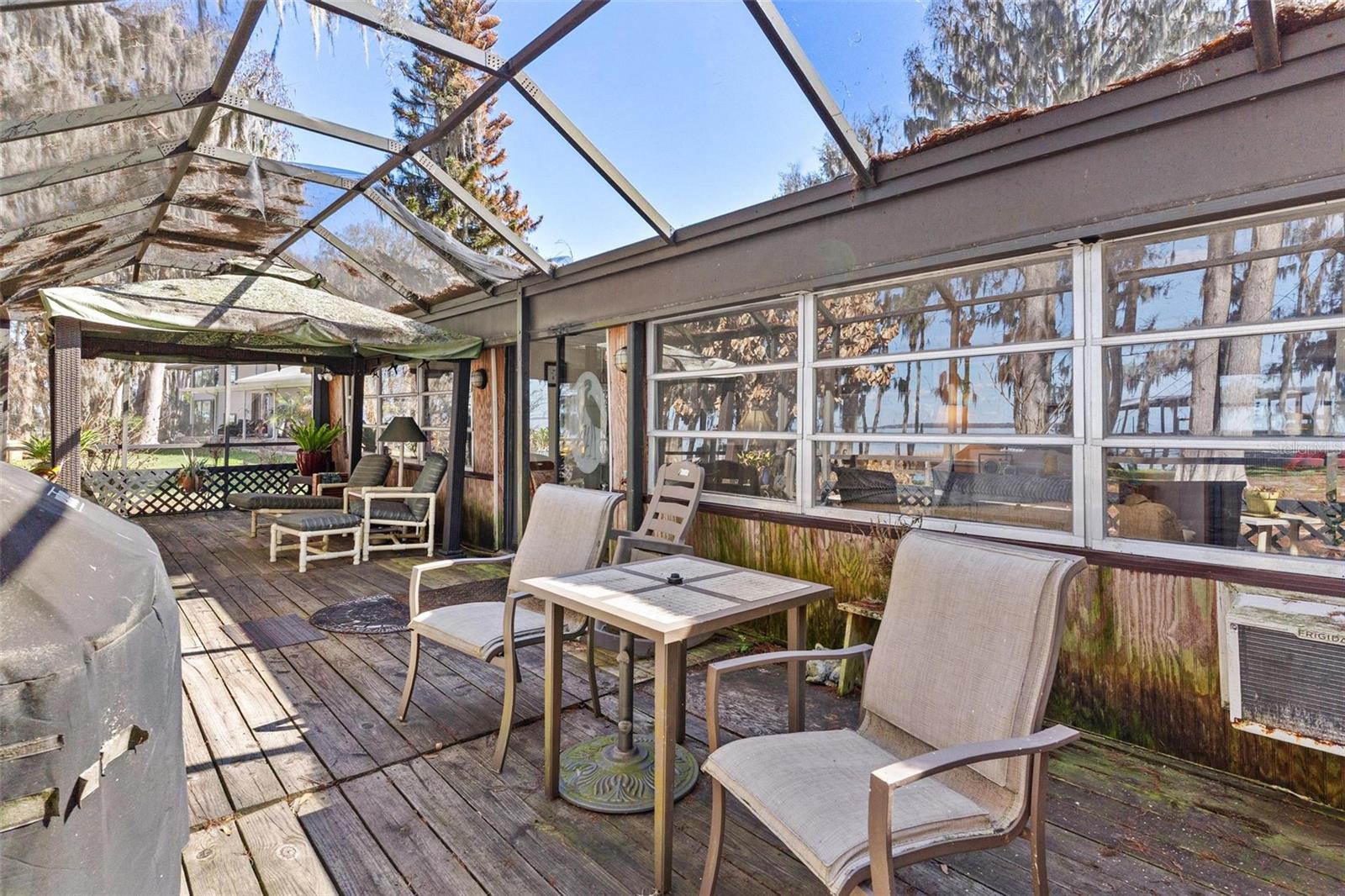 Affordable Chain of Lakes Living Private Lake Harris Waterfront with Endless Possibilities. If youve ever imagined what Old Florida truly feels like, this property brings that vision to life. As you turn onto the quiet road leading to the home, youre welcomed by a natural canopy of towering cypress & oak trees draped in Spanish moss, the sunlight filtering gently through the branches. The drive sets the tone for what awaits aheada hidden waterfront retreat where the pace slows down & nature takes center stage. With only 3 homes on the street, privacy and tranquility surround you from the moment you arrive. Situated on just under an acre of land, this property captures the charm & authenticity of classic Fl lakefront living. The shoreline is lined w/ majestic cypress trees rising from the waters edge, their reflections dancing across the lake, while birds glide overhead & the gentle breeze carries the sound of nature around you. Its the kind of place where mornings begin w/ coffee by the water & evenings end w/ lakefront sunsets. The best partyou own the land & there is NO HOA! Located directly on Lake Harris, part of the renowned Harris Chain of Lakes, youll have access to miles of interconnected waterways perfect for boating, fishing, sunset cruises, & exploring waterfront restaurants across the chain. Walk down toward the lake-a perfect starting point for days spent out on the water. Shaded by mature trees that create the perfect blend of privacy & natural beauty. Whether enjoying the peaceful backyard, relaxing in a hammock under the trees, or hosting friends for a lakeside gathering, the outdoor setting truly defines the lifestyle this home offers. Inside, this 2/2 provides a comfortable & welcoming layout. A 2-car carport greets you as you arrive & leads you into the kitchen & breakfast nook. Down the hall youll find the guest bedroom & guest bath featuring a tub/shower combination, while the primary bedroom suite offers 2 closetsincluding a walk-in& a private bathroom w/ walk-in shower. The oversized family rm flows seamlessly into the dining area, creating an open & inviting space for gathering w/ family & friends. Large windows allow natural light to fill the home, while offering glimpses of the beautiful outdoor setting. One of the most enjoyable spaces is the Fl Room, where large windows & sliding doors frame views of the backyard & Lake Harris beyond. While not under heat & air, it could be the perfect place to relax w/ a book, watch the wildlife, or enjoy peaceful waterfront scenery year-round. Need extra storage? Youll love the huge utility room, providing plenty of space for hobbies or additional storage. Did I mention there is also 2 sheds in the front yard. The property also features a large screened lanai, offering the perfect place to sit back, enjoy the breeze off the lake, and take in the peaceful surroundings. Recent updates include: Roof approx 8 years old A/C approx 3 years old Hot Water Heater approx 4 years old Newer appliances. This property offers the flexibility & opportunity that so many buyers are searching for. Whether youre looking for a weekend lake escape, a seasonal Fl retreat to leave the snow behind, or a place to enjoy now while planning your future custom waterfront dream home, this property delivers.Opportunities like thisare becoming increasingly rare. Come experience the charm, privacy, & timeless beauty of Old Fl lakefront living. Your waterfront dream begins here.