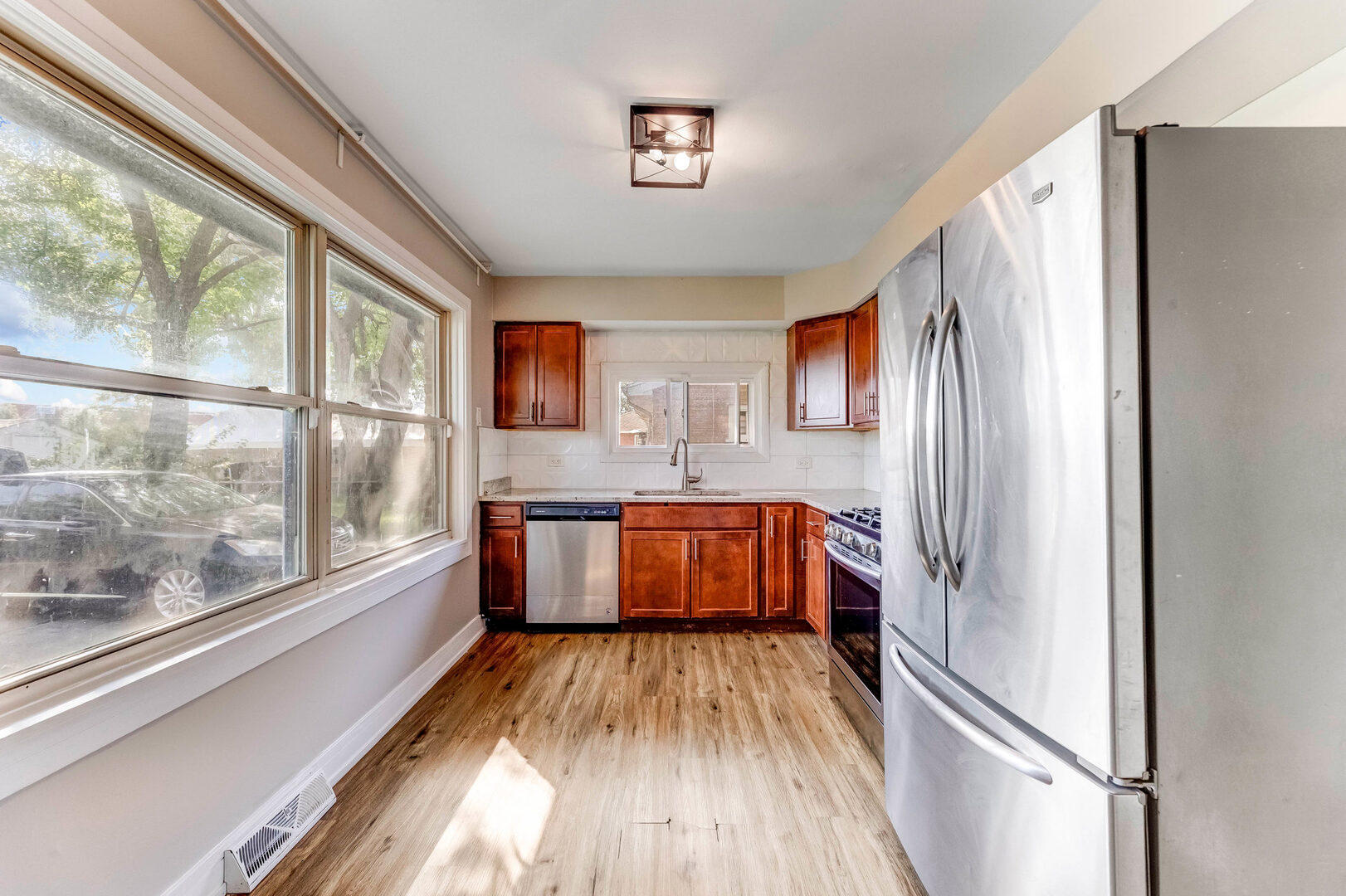 Beautifully updated ranch offering style and comfort throughout. Step inside to find gleaming new floors leading into a bright and spacious living room filled with natural light and highlighted by a cozy electric fireplace. The home features three generous bedrooms with ample closet space and a stunningly updated full bath. The eat-in kitchen impresses with shaker cabinets, granite countertops, stainless steel appliances, and a subway tile backsplash. Freshly painted with new light fixtures throughout, this home is truly move-in ready. Outside, enjoy a fully fenced yard perfect for entertaining, plus a driveway for convenient off-street parking. Ideally located near schools and I-294. Home is Section 8 approved. Applicants with a 3-bedroom Housing Choice Voucher will be considered.