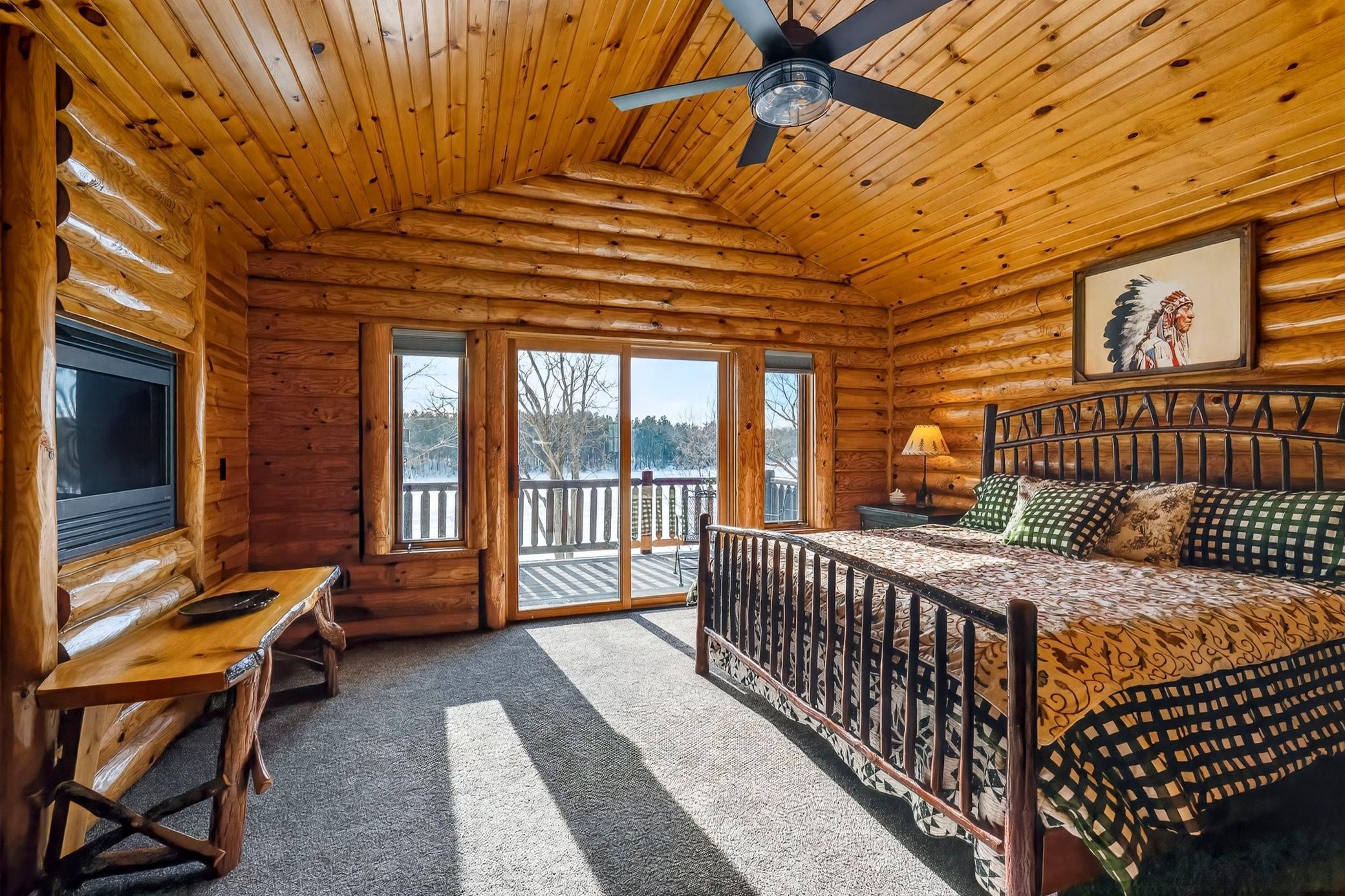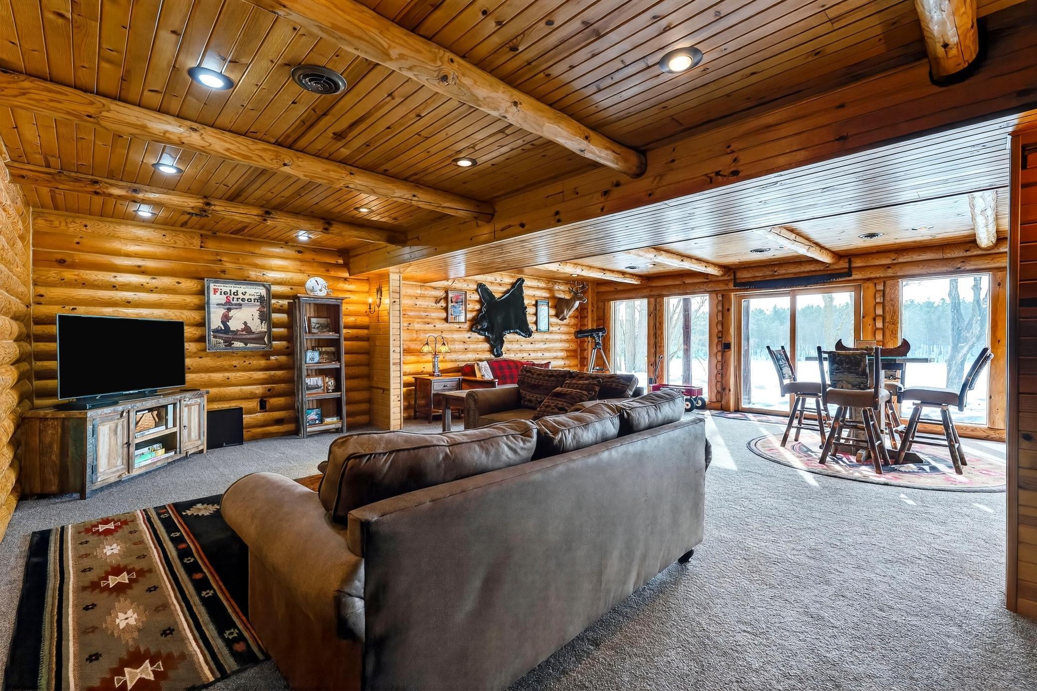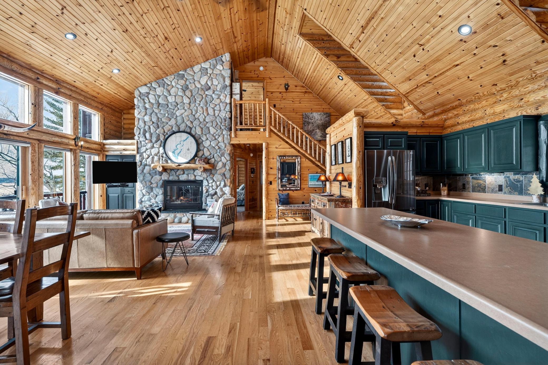 Stunning property on Long Lake! This immaculately cared-for 4-BR, 3-BA chalet-style home offers 3,200 sq ft of open-concept living space with breathtaking lake views on a private lot. Inside, soaring wood ceilings, half-log interior details, hardwood floors, heated tile bathrooms, and a stone fireplace create a cozy yet elegant retreat. The walk-out lower level features a spacious family room with a wet bar, perfect for entertaining. Wake up to lake views from the luxurious owners suite with fireplace. Enjoy outdoor living with a screened porch, decks, a lakeside patio, and a professionally landscaped lot with stone steps to the shoreline and a sandy swimming area. Recent updates include a new 50-year roof, heated garage, stamped concrete sidewalks, circular driveway, new laundry room, new furnace, Generac generator, and more. Long Lake offers 19 miles of exceptional fishing and boating, scenic shoreline, sandbars, a marina, and a boat-up golf course. ATV trails nearby. Sold with some furnishings.