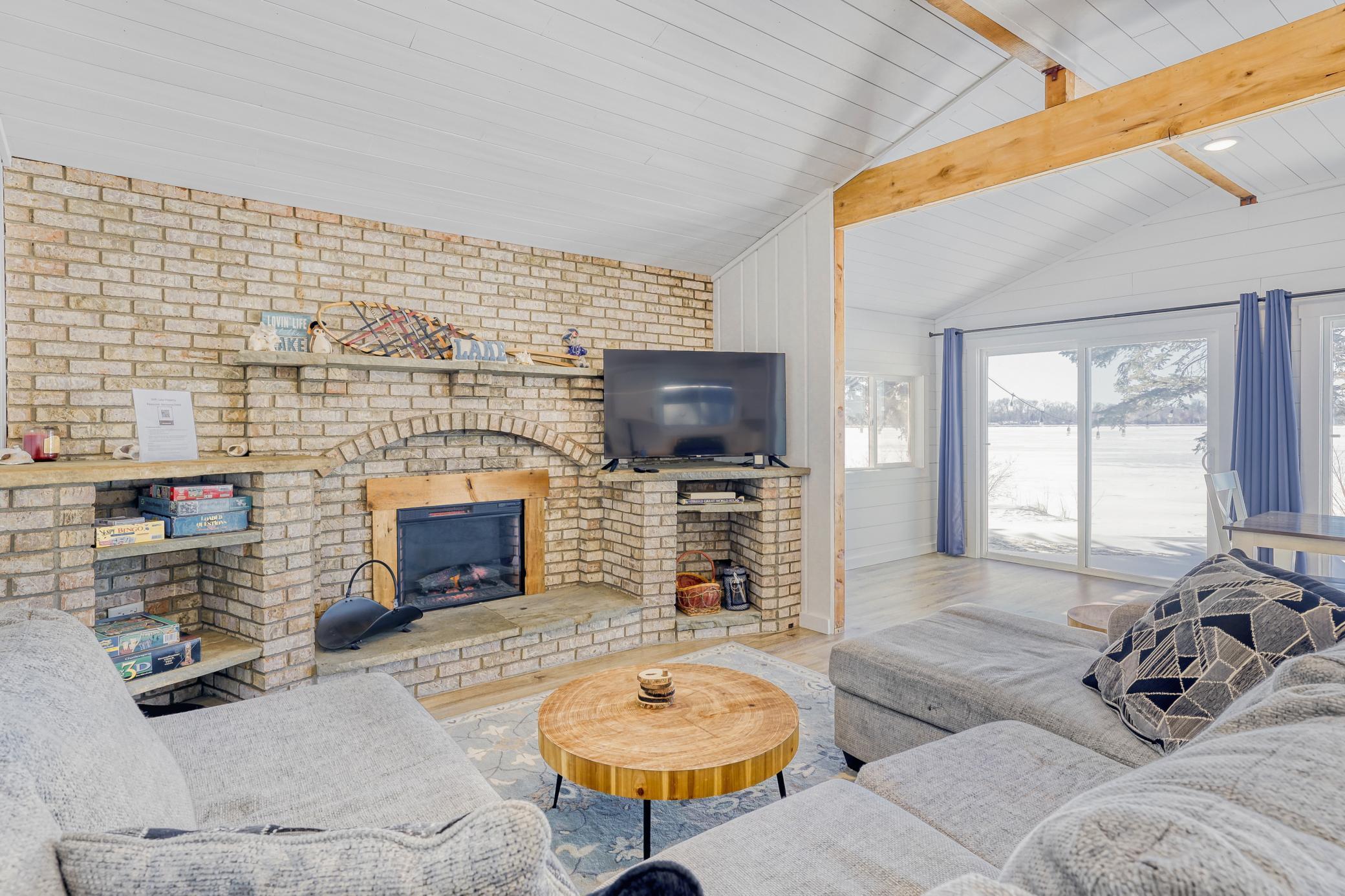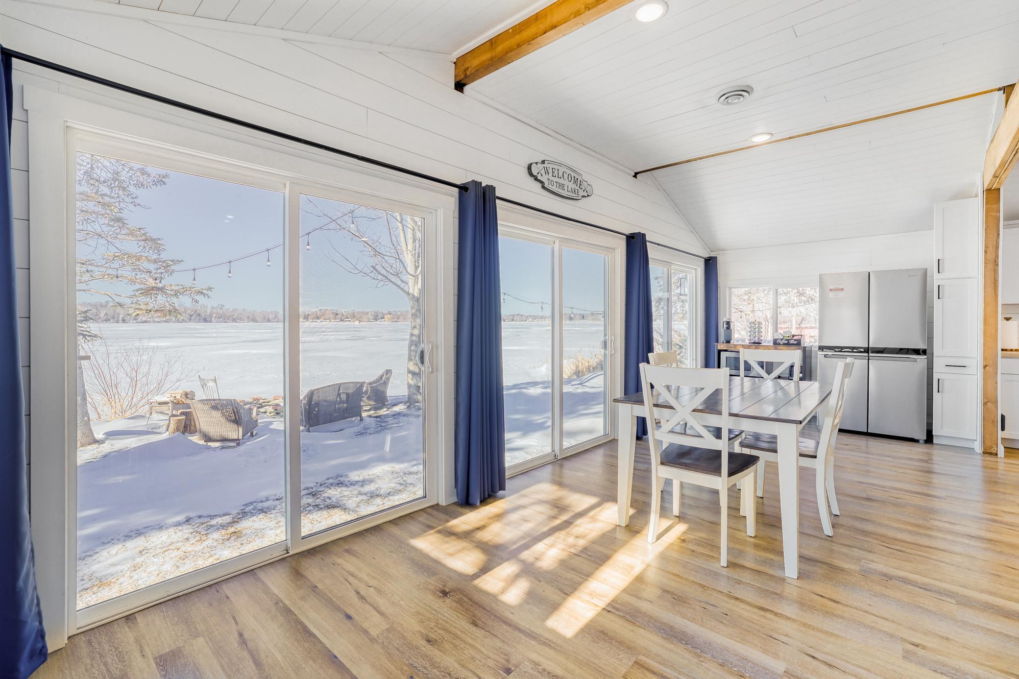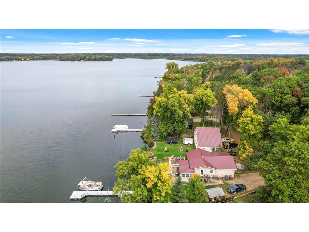 Enjoy lake life in this turnkey lakefront property! Completely renovated inside and out just a few years ago, this fully furnished two-bedroom, two-bath home features an open-concept design with vaulted ceilings and modern updates throughout, including LPV flooring, an updated kitchen with island and stainless steel appliances, updated baths, furnace, central air, and roof (2023). Panoramic lake views from the dining area create a perfect backdrop for everyday living. Step outside to a patio, maintenance-free dock and private lake access just steps away, along with a fire pit near the water for relaxing and entertaining. A storage shed provides convenient space for recreational gear and gardening tools. Located on a great fishing lake just an hour north of the Twin Cities, this property is ideal for a weekend getaway or permanent residence.