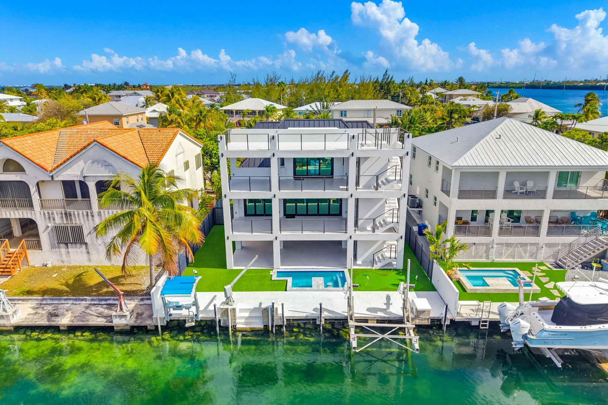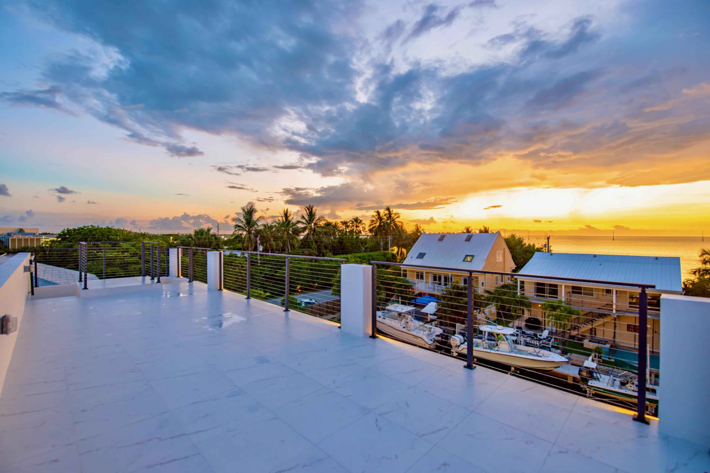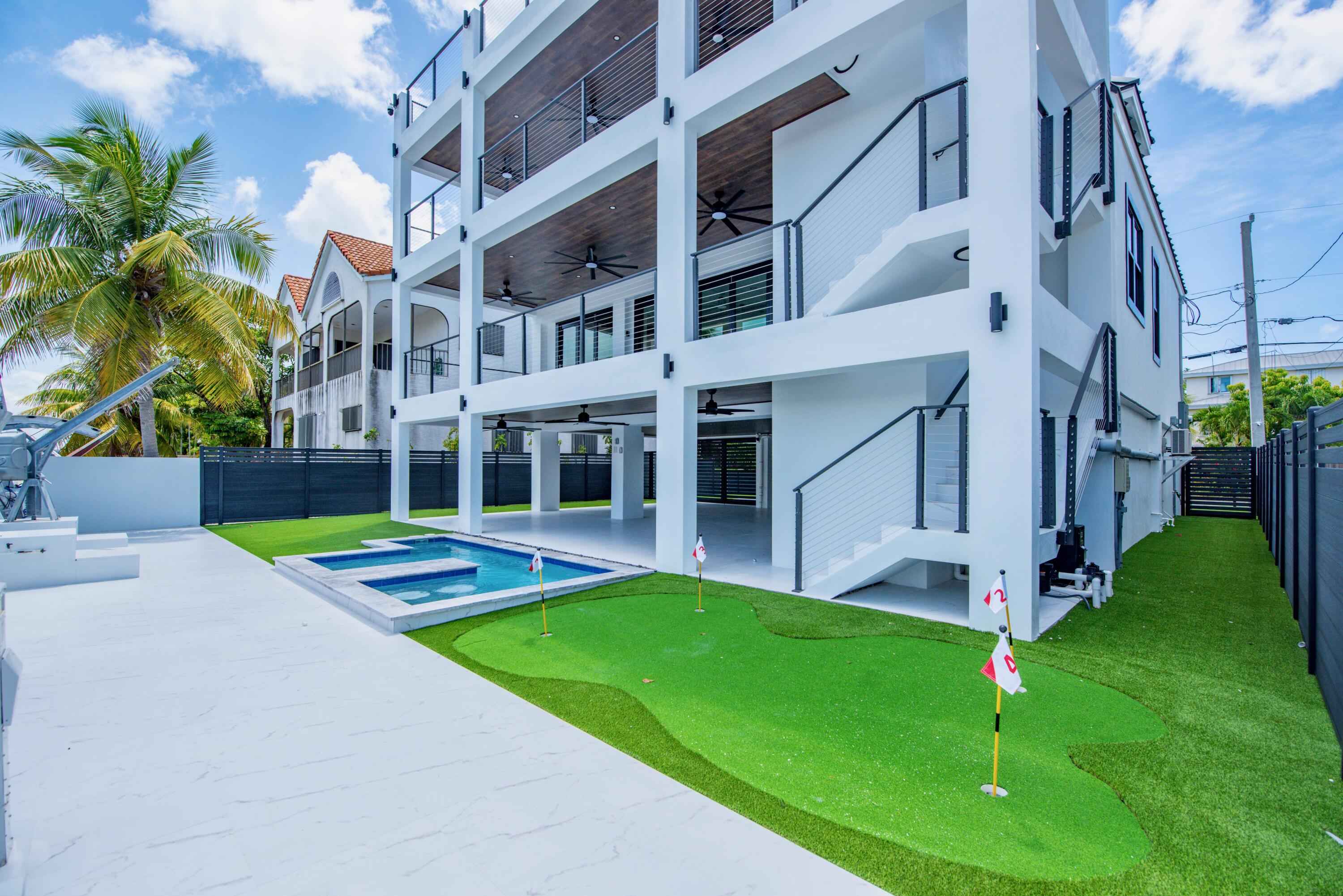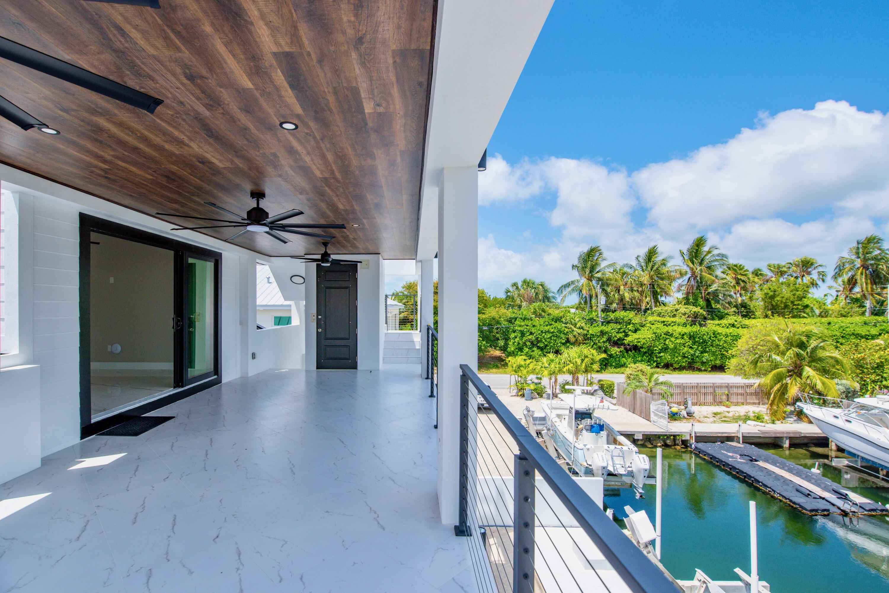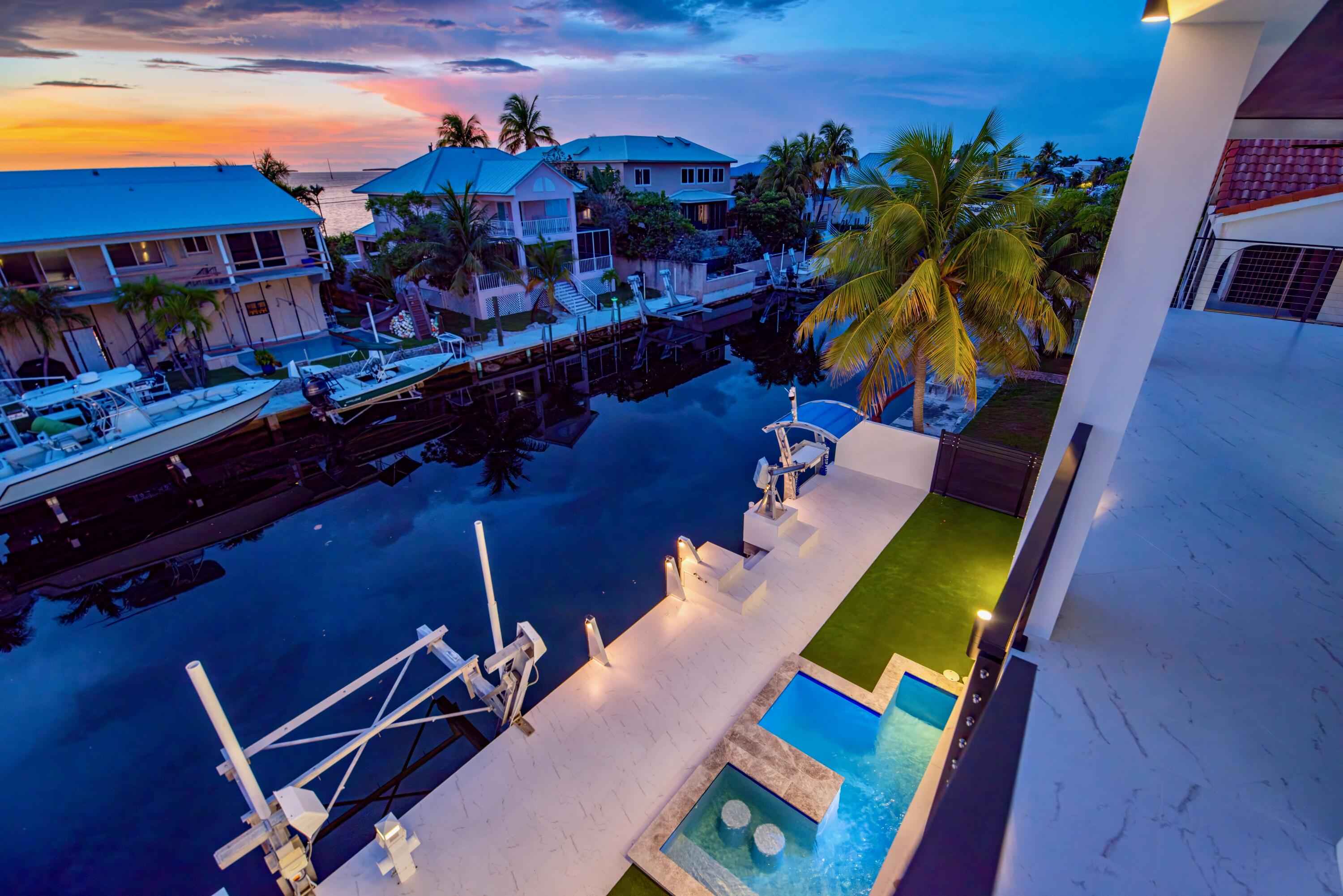 New 2025 waterfront construction on the final canal in Key Haven--an architectural entertainer designed for seamless indoor-outdoor living just 5 minutes from Key West. Unlike typical Keys homes, this residence was designed around outdoor living, offering over 2,400 Sq.Ft. of covered entertaining space seamlessly connected to the interior. Completed in 2025, this striking modern waterfront residence offers 4 bedrooms + office, 4 bathrooms, and 2,458 Sq.Ft. of interior living space. Positioned on the coveted final canal in the exclusive Key Haven community, the home is designed for privacy, entertaining, and exceptional boating access. The layout offers rare flexibility. The entire top level functions as a private guest quarters, ideal as an elevated primary suite, luxury guest retreat, or in-law residence with some of the best water views in the home. This level also features a large covered porch spanning the entire floor, creating an additional private entertaining space. Inside, the architecture emphasizes volume, light, and clean modern lines. Tall ceilings, expansive glass, and large polished porcelain tile flooring create a refined coastal aesthetic. The open living area centers around a gourmet kitchen with Thermador appliances designed for entertaining. Stackable glass doors open the entire main living space onto a wide covered waterfront porch, for seamless indoor-outdoor living. A private elevator with access from ground level.Outdoor spaces include four decks, a rooftop deck with sweeping water views, a pool with swim-up bar, and a private putting green. The rooftop deck is ideal for spectacular sunsets and stargazing.For boating enthusiasts, the property features a 15,000 lb boat lift and davit with quick access to both the Gulf and Atlantic. Additional highlights include solid concrete construction, standing seam metal roof, elevator access, high-end finishes, and a large air-conditioned storage room. Photos include virtually staged furniture layou