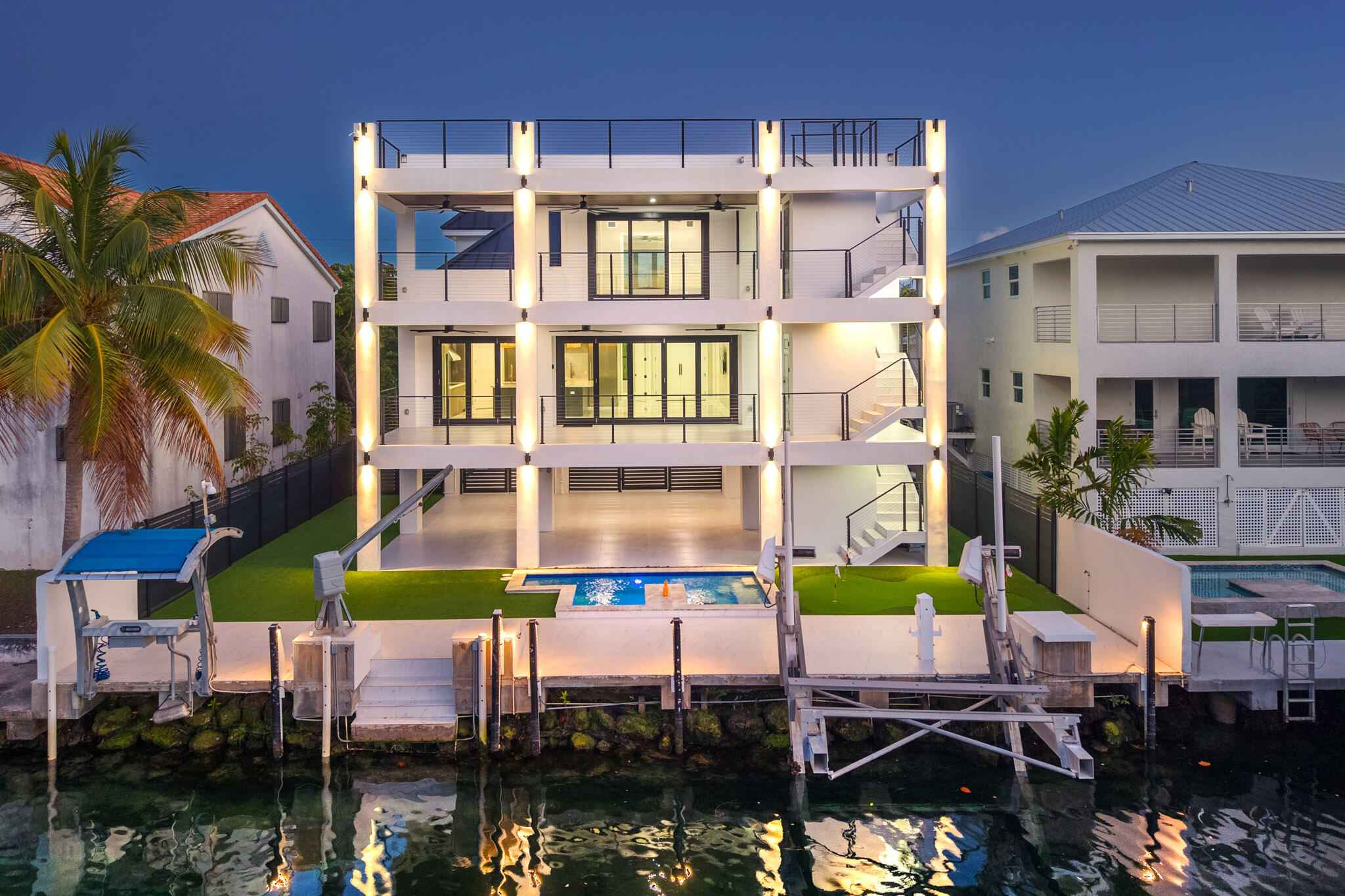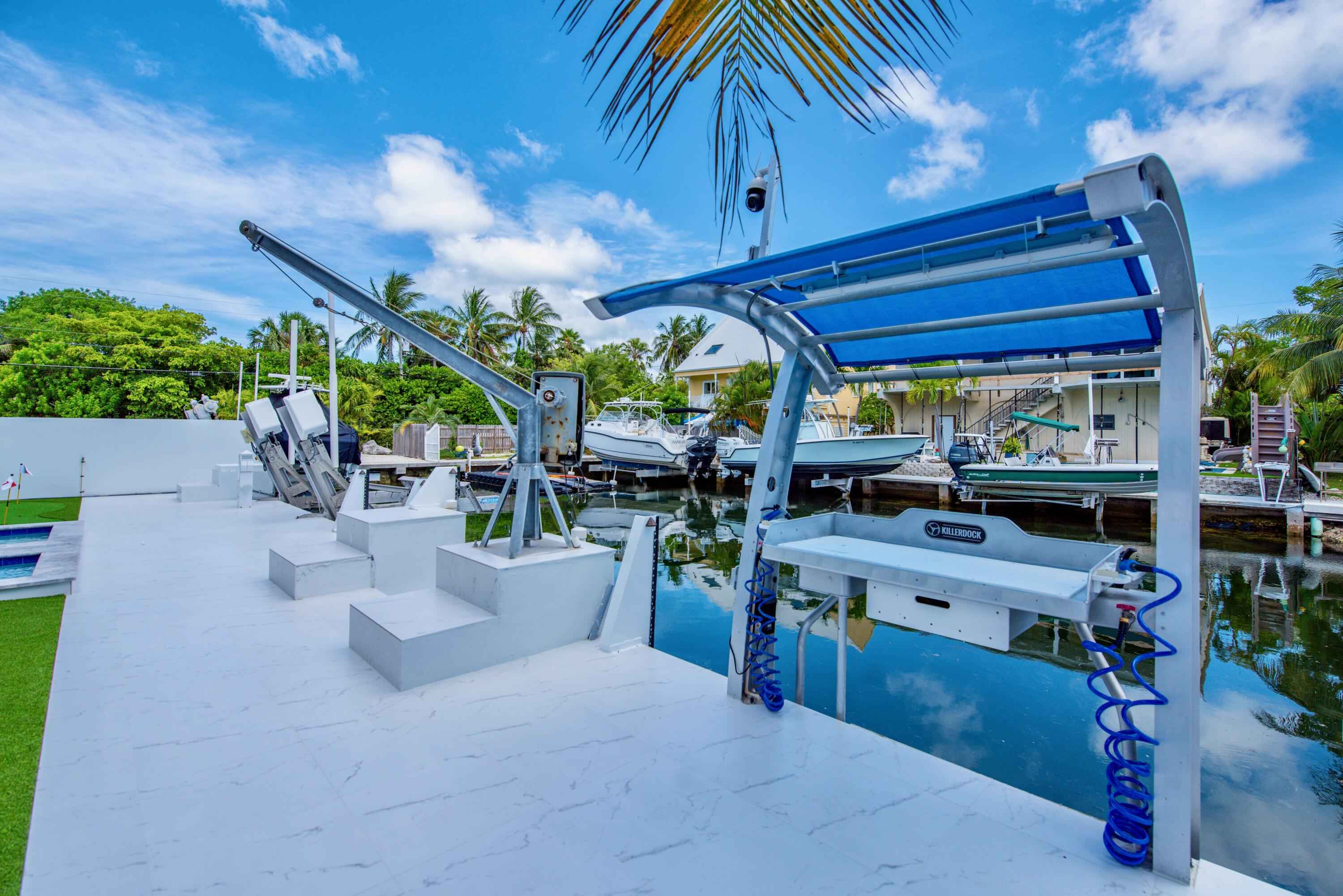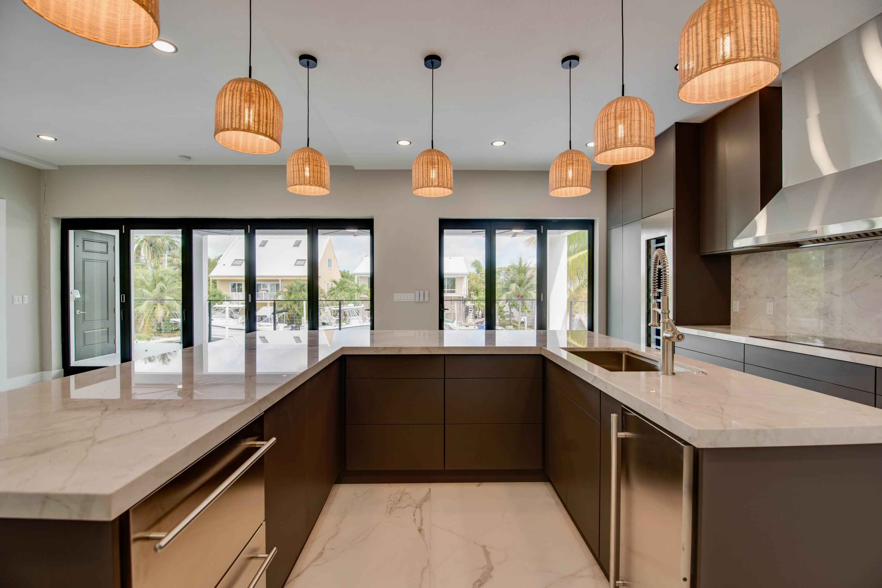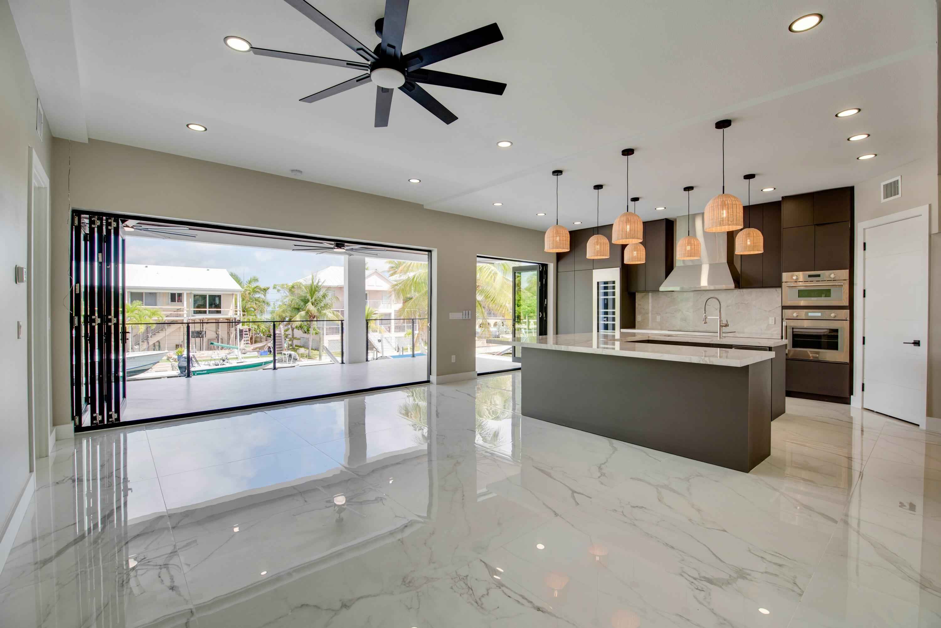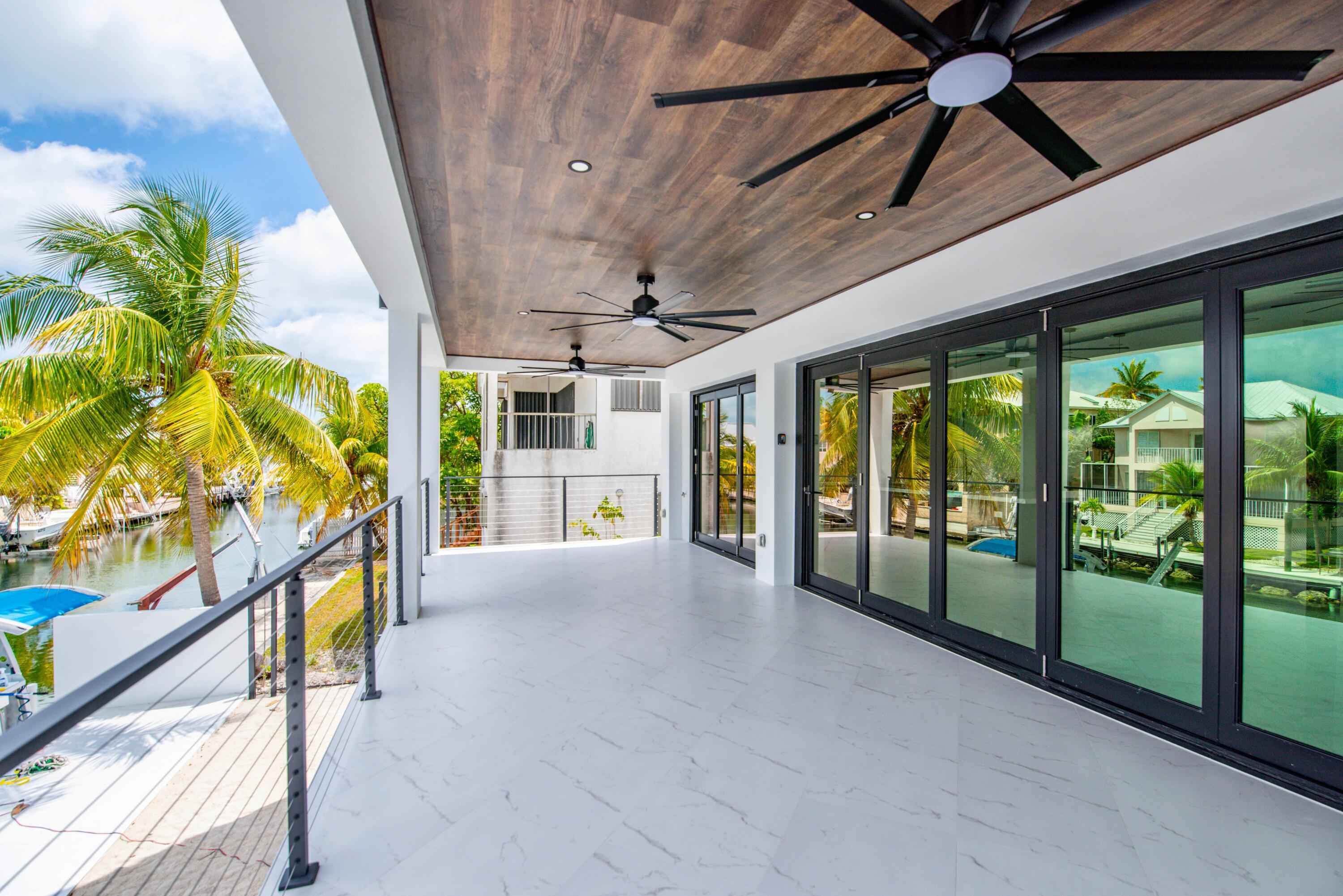 New 2025 waterfront construction on the final canal in Key Haven--an architectural entertainer designed for seamless indoor-outdoor living just 5 minutes from Key West. Unlike typical Keys homes, this residence was designed around outdoor living, offering over 2,400 Sq.Ft. of covered entertaining space seamlessly connected to the interior. Completed in 2025, this striking modern waterfront residence offers 4 bedrooms + office, 4 bathrooms, and 2,458 Sq.Ft. of interior living space. Positioned on the coveted final canal in the exclusive Key Haven community, the home is designed for privacy, entertaining, and exceptional boating access. The layout offers rare flexibility. The entire top level functions as a private guest quarters, ideal as an elevated primary suite, luxury guest retreat, or in-law residence with some of the best water views in the home. This level also features a large covered porch spanning the entire floor, creating an additional private entertaining space. Inside, the architecture emphasizes volume, light, and clean modern lines. Tall ceilings, expansive glass, and large polished porcelain tile flooring create a refined coastal aesthetic. The open living area centers around a gourmet kitchen with Thermador appliances designed for entertaining. Stackable glass doors open the entire main living space onto a wide covered waterfront porch, for seamless indoor-outdoor living. A private elevator with access from ground level.Outdoor spaces include four decks, a rooftop deck with sweeping water views, a pool with swim-up bar, and a private putting green. The rooftop deck is ideal for spectacular sunsets and stargazing.For boating enthusiasts, the property features a 15,000 lb boat lift and davit with quick access to both the Gulf and Atlantic. Additional highlights include solid concrete construction, standing seam metal roof, elevator access, high-end finishes, and a large air-conditioned storage room. Photos include virtually staged furniture layou