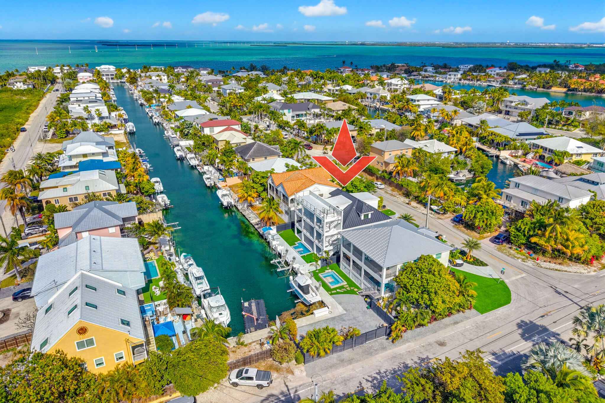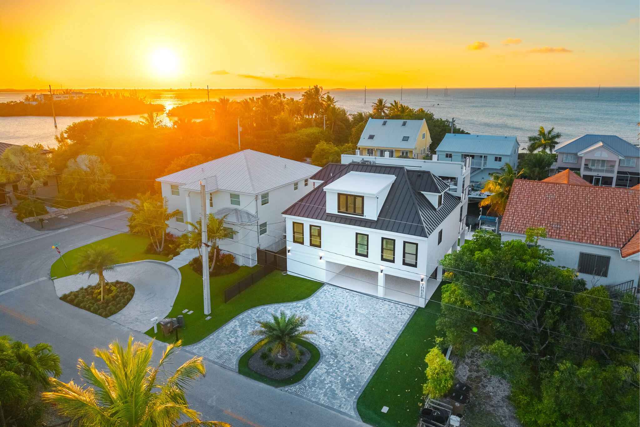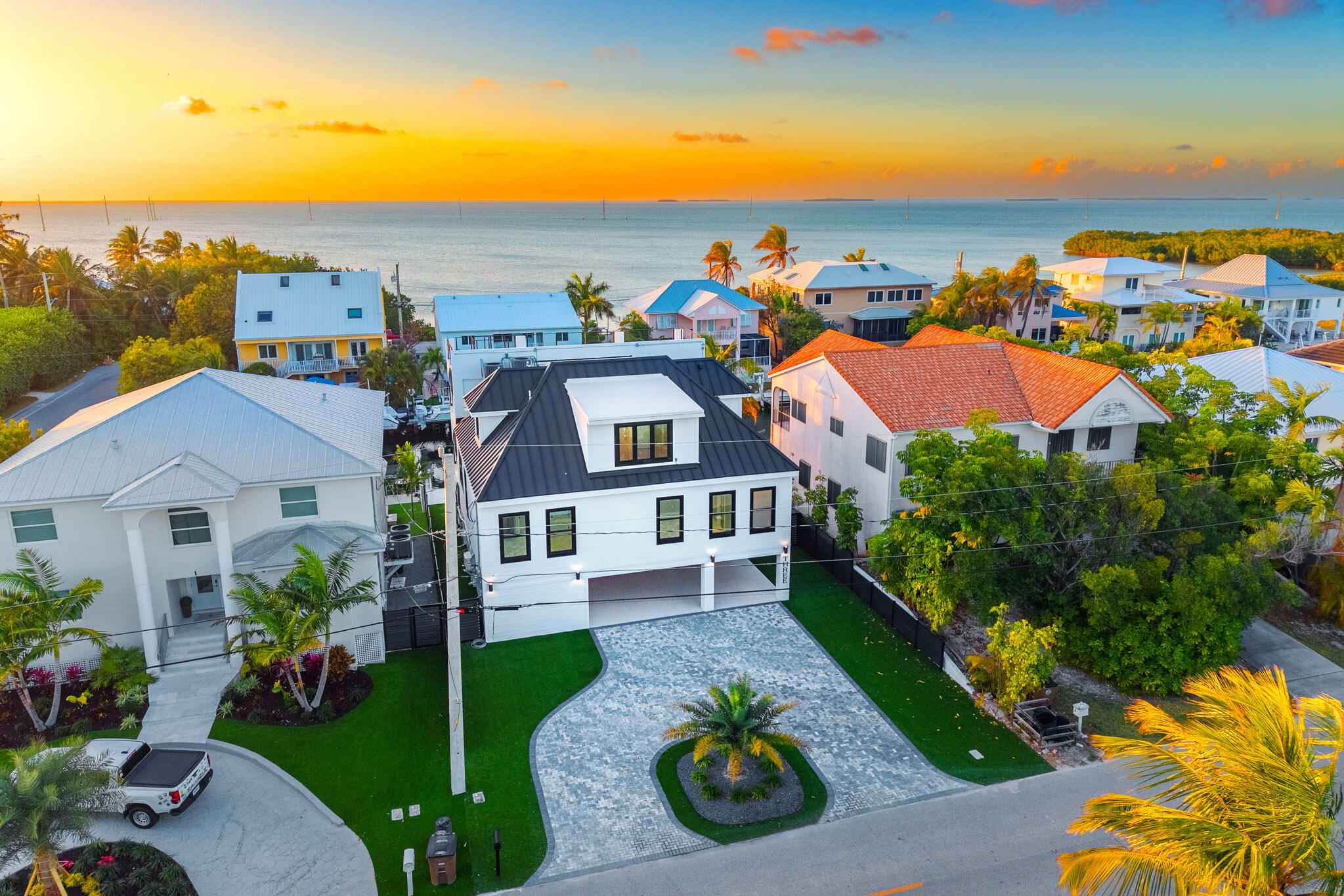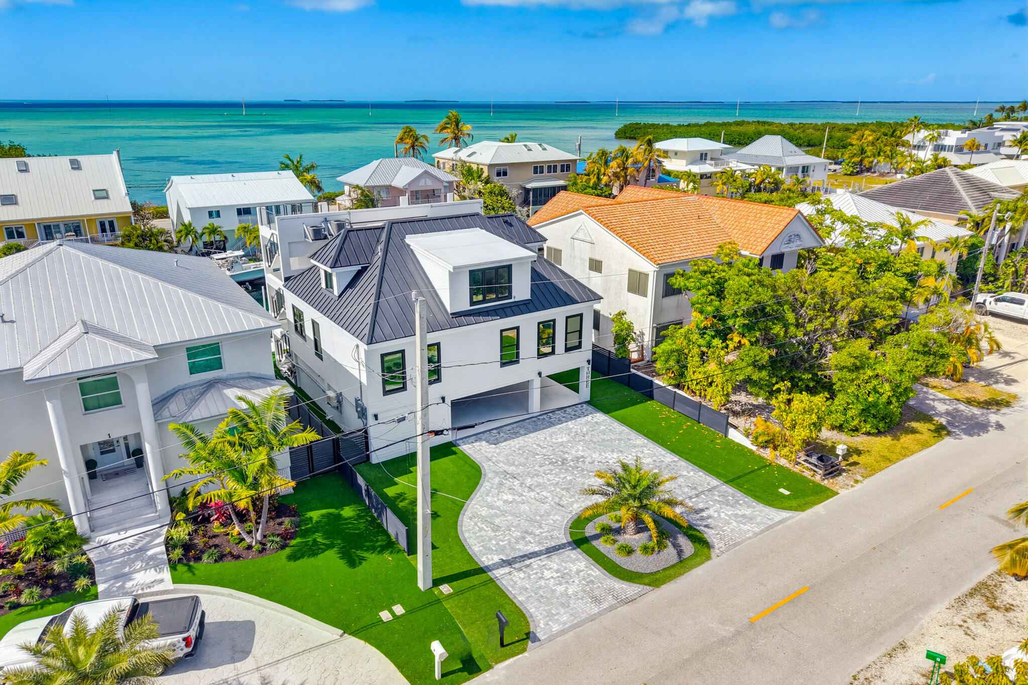 New 2025 waterfront construction on the final canal in Key Haven--an architectural entertainer designed for seamless indoor-outdoor living just 5 minutes from Key West. Unlike typical Keys homes, this residence was designed around outdoor living, offering over 2,400 Sq.Ft. of covered entertaining space seamlessly connected to the interior. Completed in 2025, this striking modern waterfront residence offers 4 bedrooms + office, 4 bathrooms, and 2,458 Sq.Ft. of interior living space. Positioned on the coveted final canal in the exclusive Key Haven community, the home is designed for privacy, entertaining, and exceptional boating access. The layout offers rare flexibility. The entire top level functions as a private guest quarters, ideal as an elevated primary suite, luxury guest retreat, or in-law residence with some of the best water views in the home. This level also features a large covered porch spanning the entire floor, creating an additional private entertaining space. Inside, the architecture emphasizes volume, light, and clean modern lines. Tall ceilings, expansive glass, and large polished porcelain tile flooring create a refined coastal aesthetic. The open living area centers around a gourmet kitchen with Thermador appliances designed for entertaining. Stackable glass doors open the entire main living space onto a wide covered waterfront porch, for seamless indoor-outdoor living. A private elevator with access from ground level.Outdoor spaces include four decks, a rooftop deck with sweeping water views, a pool with swim-up bar, and a private putting green. The rooftop deck is ideal for spectacular sunsets and stargazing.For boating enthusiasts, the property features a 15,000 lb boat lift and davit with quick access to both the Gulf and Atlantic. Additional highlights include solid concrete construction, standing seam metal roof, elevator access, high-end finishes, and a large air-conditioned storage room. Photos include virtually staged furniture layou