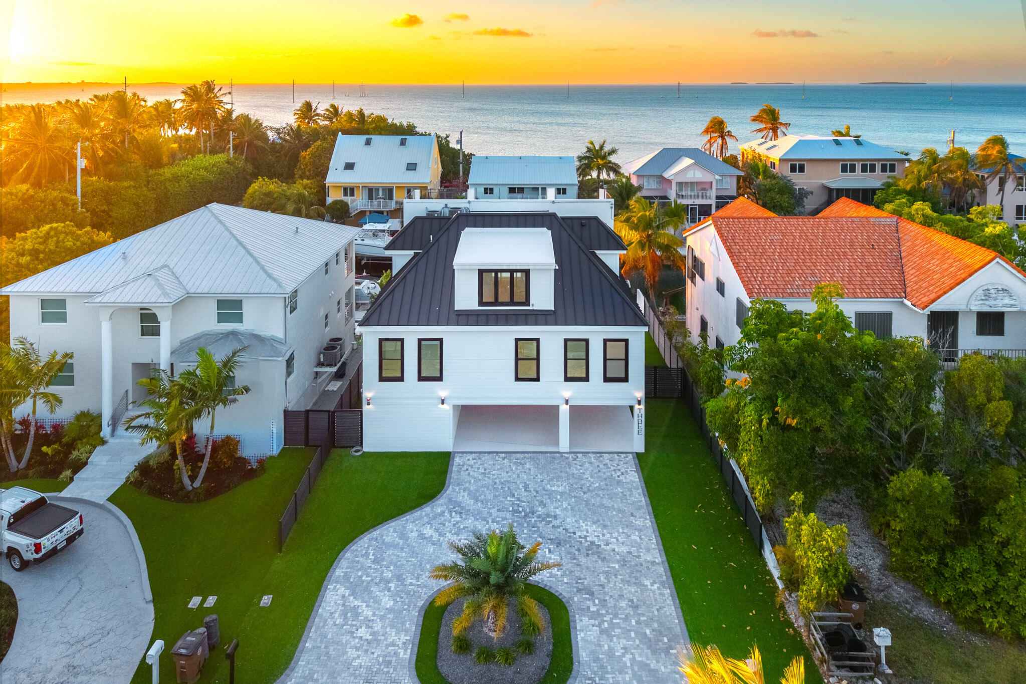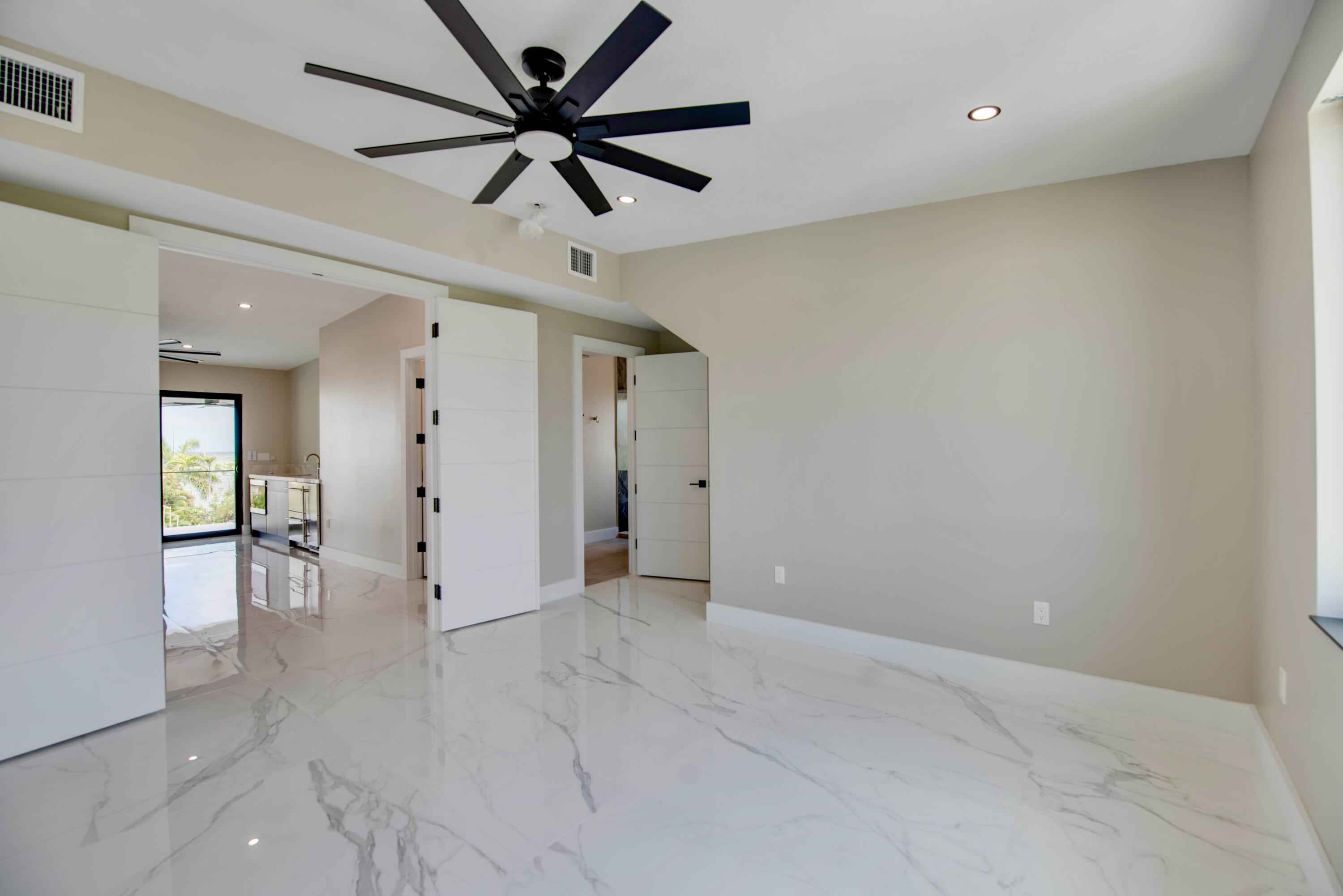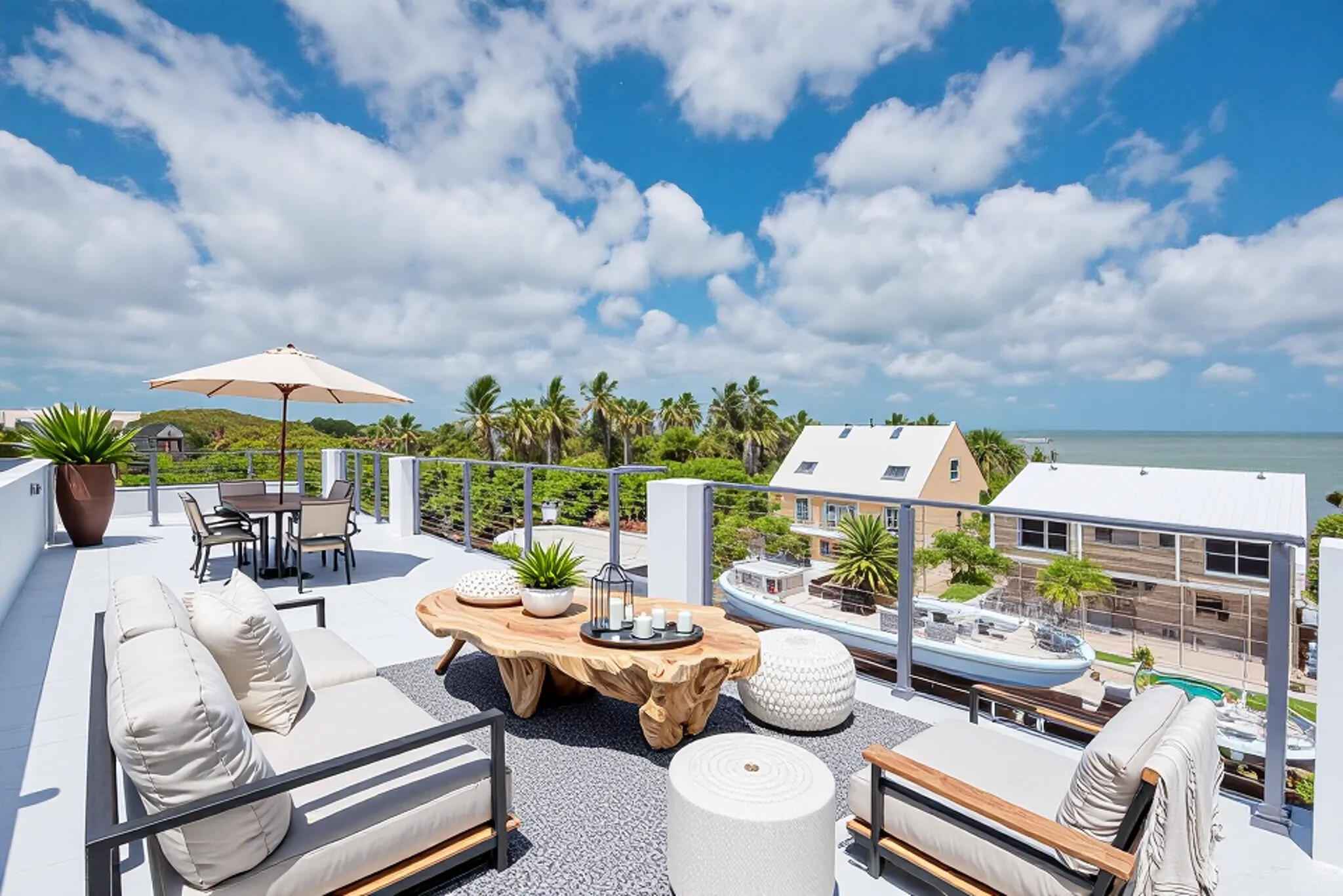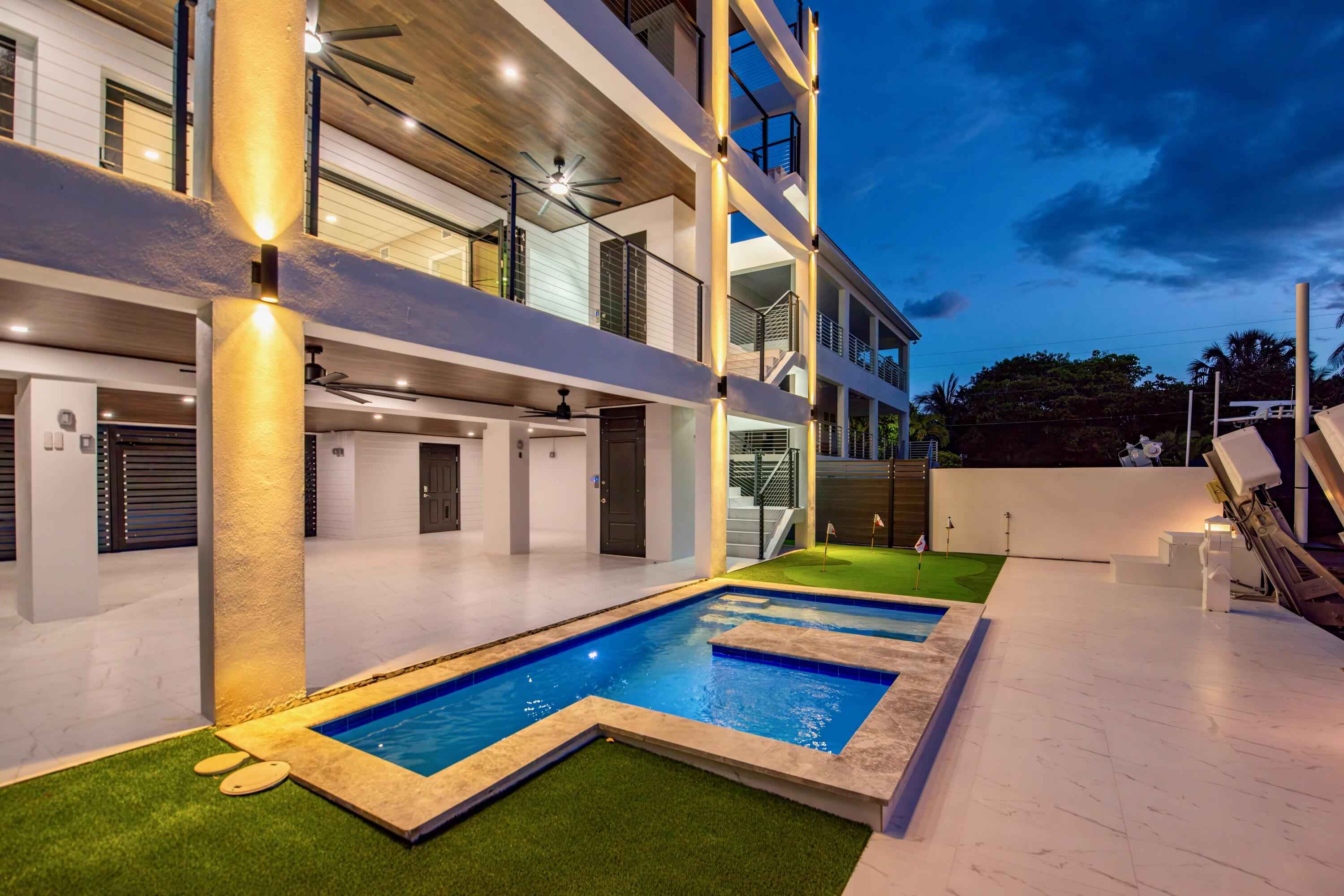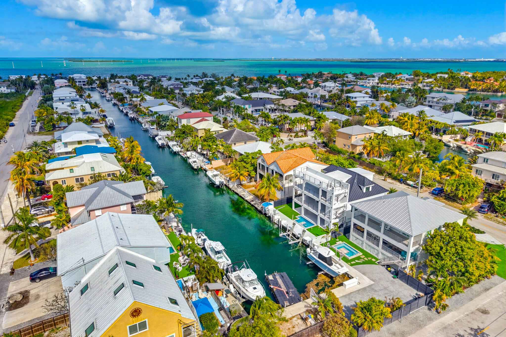 New 2025 waterfront construction on the final canal in Key Haven--an architectural entertainer designed for seamless indoor-outdoor living just 5 minutes from Key West. Unlike typical Keys homes, this residence was designed around outdoor living, offering over 2,400 Sq.Ft. of covered entertaining space seamlessly connected to the interior. Completed in 2025, this striking modern waterfront residence offers 4 bedrooms + office, 4 bathrooms, and 2,458 Sq.Ft. of interior living space. Positioned on the coveted final canal in the exclusive Key Haven community, the home is designed for privacy, entertaining, and exceptional boating access. The layout offers rare flexibility. The entire top level functions as a private guest quarters, ideal as an elevated primary suite, luxury guest retreat, or in-law residence with some of the best water views in the home. This level also features a large covered porch spanning the entire floor, creating an additional private entertaining space. Inside, the architecture emphasizes volume, light, and clean modern lines. Tall ceilings, expansive glass, and large polished porcelain tile flooring create a refined coastal aesthetic. The open living area centers around a gourmet kitchen with Thermador appliances designed for entertaining. Stackable glass doors open the entire main living space onto a wide covered waterfront porch, for seamless indoor-outdoor living. A private elevator with access from ground level.Outdoor spaces include four decks, a rooftop deck with sweeping water views, a pool with swim-up bar, and a private putting green. The rooftop deck is ideal for spectacular sunsets and stargazing.For boating enthusiasts, the property features a 15,000 lb boat lift and davit with quick access to both the Gulf and Atlantic. Additional highlights include solid concrete construction, standing seam metal roof, elevator access, high-end finishes, and a large air-conditioned storage room. Photos include virtually staged furniture layou